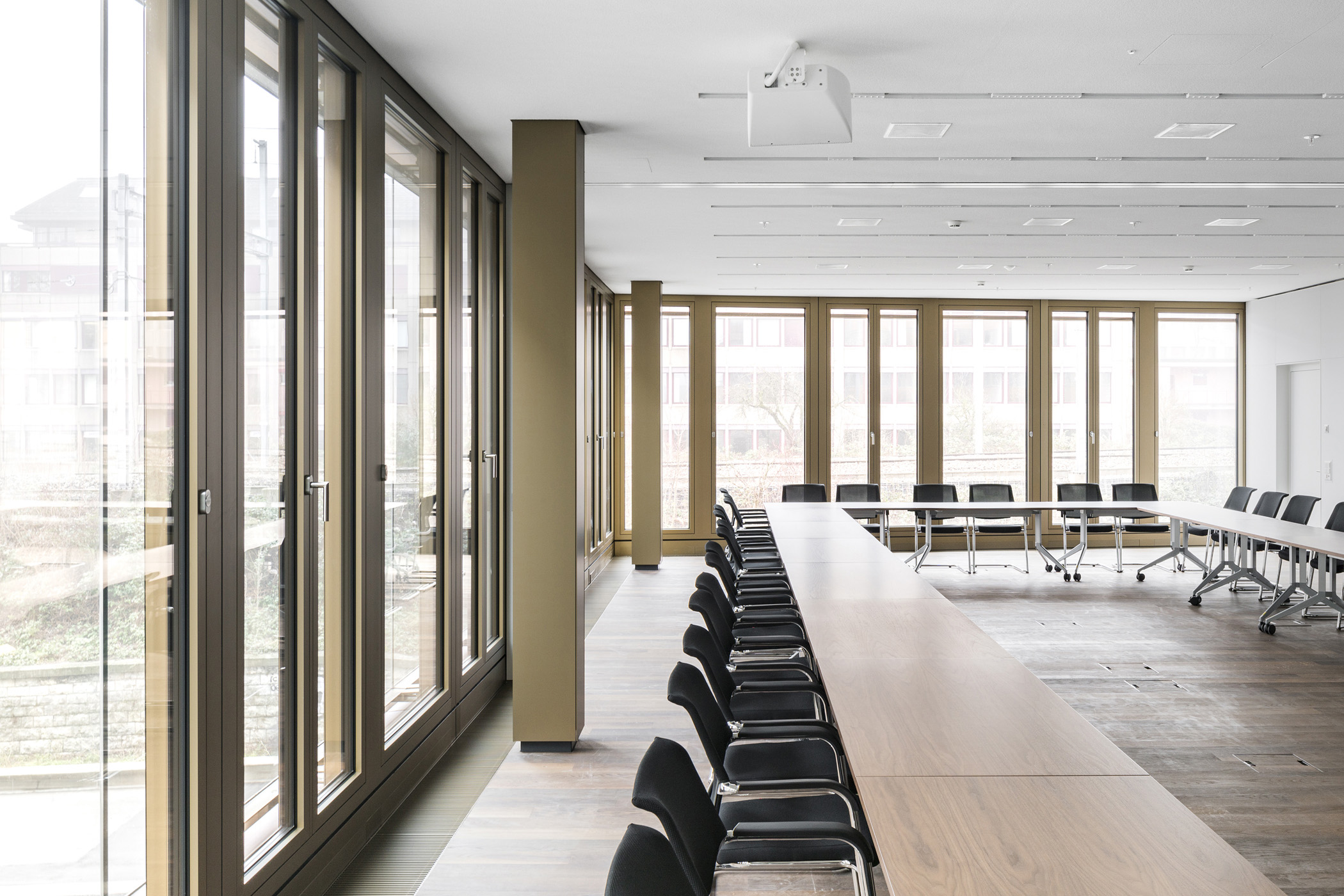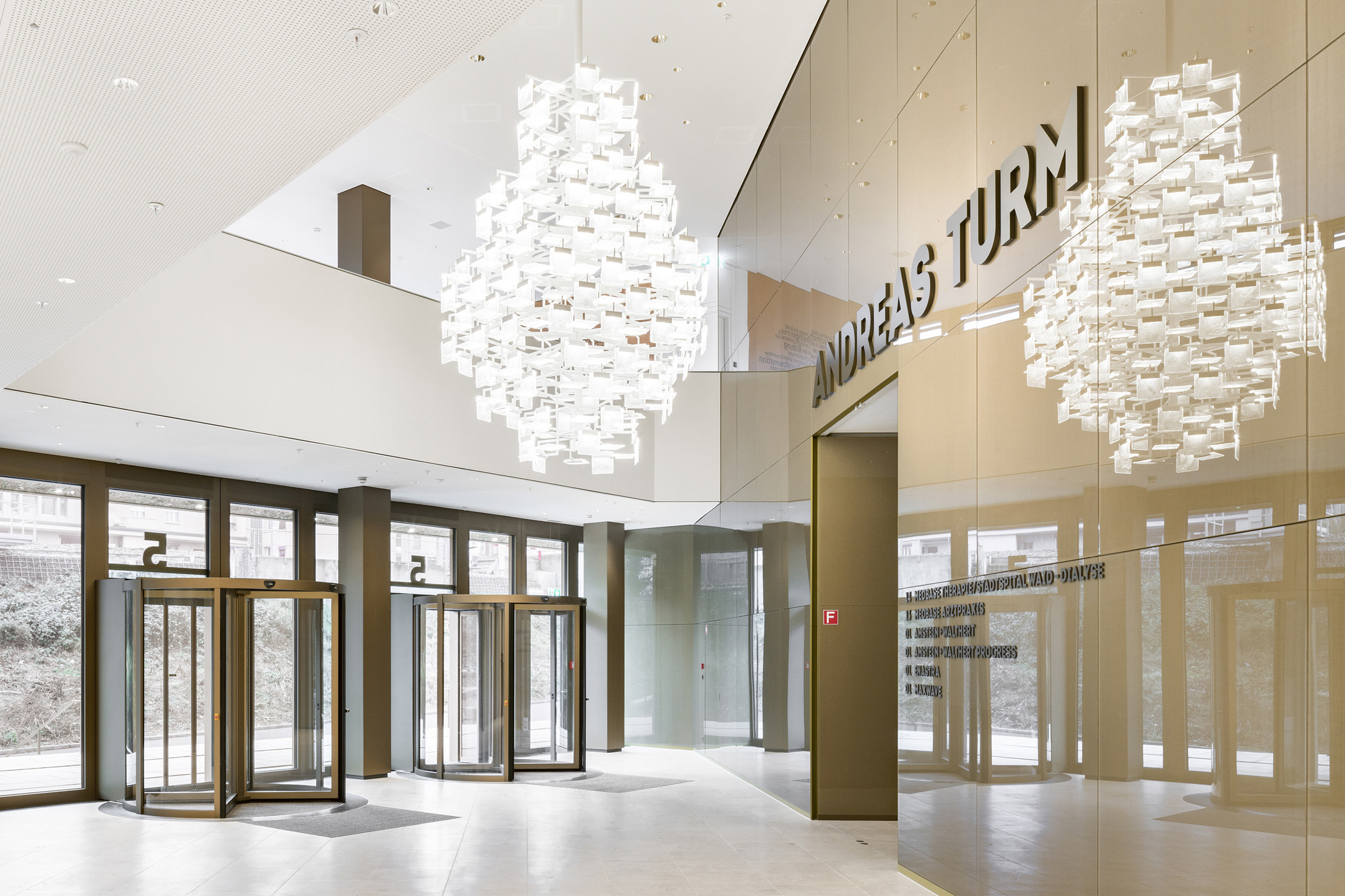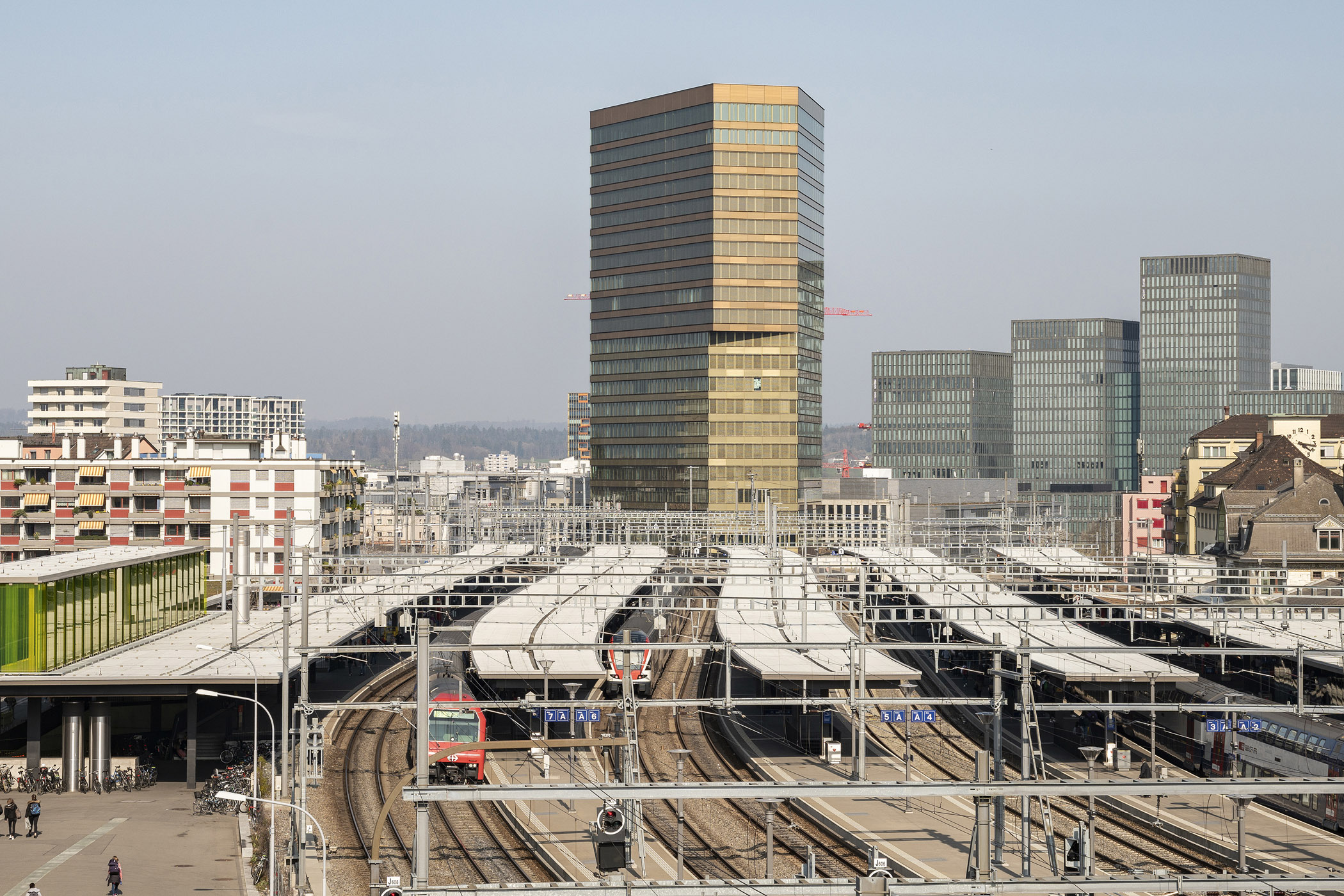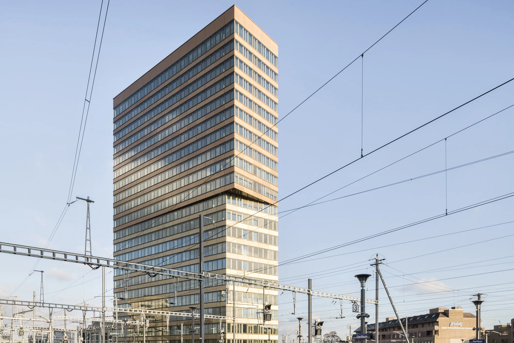 Das Hochhaus besetzt am Bahnhof Oerlikon zwischen sich auffächernden Gleisen eine dreieckige Parzelle. Ein ausladender Sockel verankert den Baukörper in seiner Umgebung und erschliesst ihn über mehrere Ebenen. An der Andreasstrasse liegt der Haupteingang mit öffentlichen Nutzungen, am höher gelegenen Perron der Eingang des Ankermieters Amstein + Walthert (1.-12. Obergeschoss).