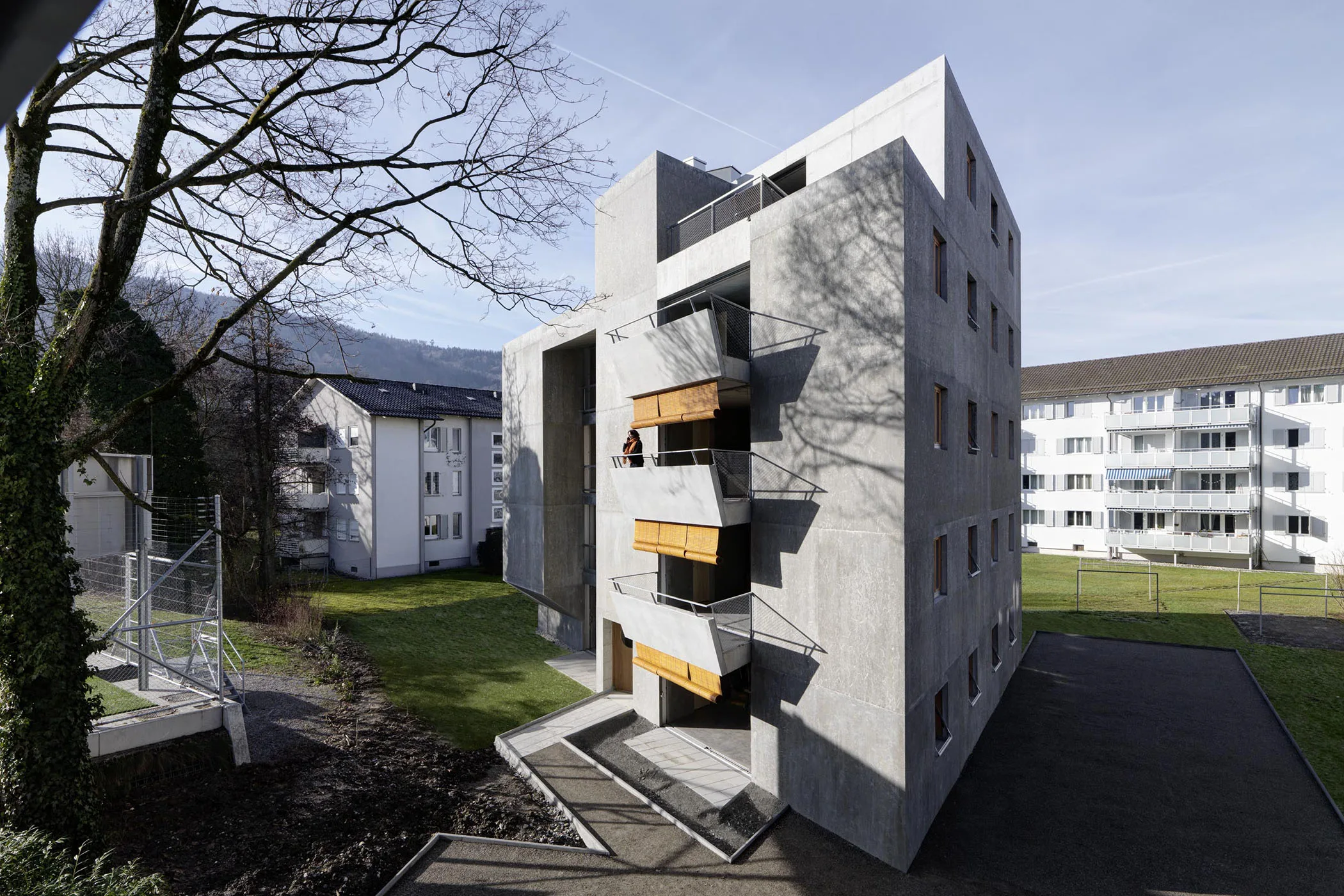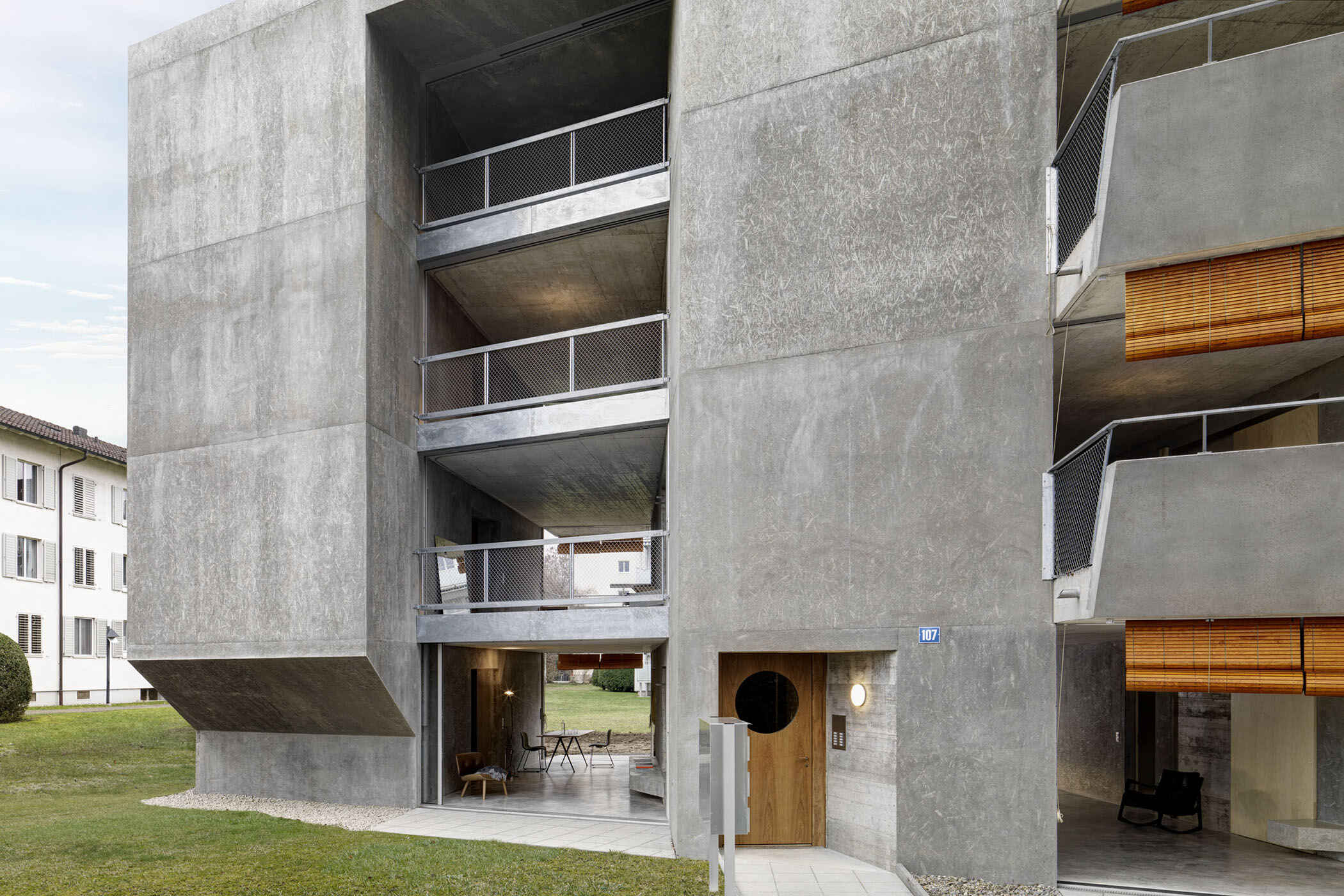 In der Architektur, hier im Wohnungsbau, zeigen wir mit diesem Projekt, wie die Verlagerung vom Schwerpunktweg von Konnotationen und Standards hin zum Raum Moment und Raumqualität, eben dies ermöglicht. Das Programm sind 4 3 ½ Zimmer Wohnungen à 60m2, 4 4 ½ Zimmer Wohnungen à 90m2, eine Dachwohnung à 53m2 und eine gemeinschaftliche Dachterrasse nach Süden gerichtet. Morphologisch ist die Baute ein massiver Betonblock, organisch geschalt, aus dem zwei Höfe heraus geschnitten wurden.
