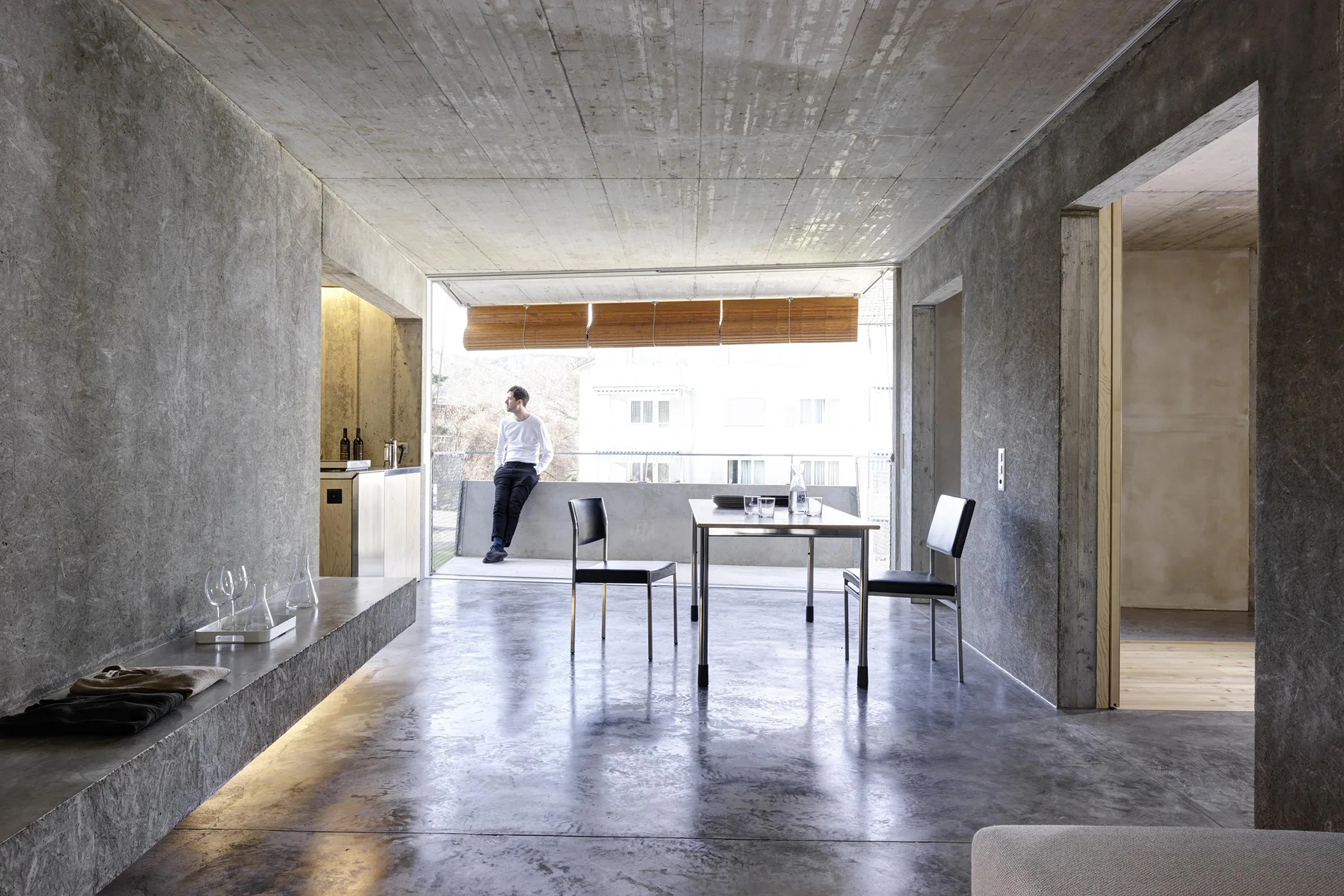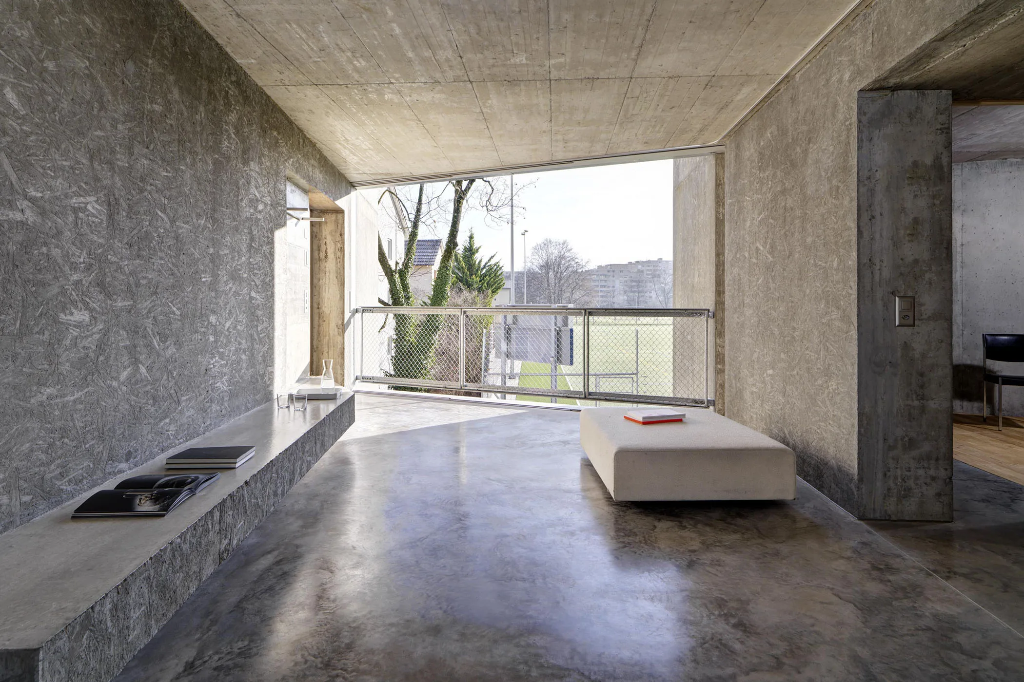 In diesen Höfen schweben die Wohnräume wie Brücken, von der Morgensonne hin zur Abendsonne. Ein durchgehender Raum von Ost nach West, der topografisch das Gefühl erzeugt, der Wohnraum sei eigentlich ein Aussenraum. Dies ergibt ein unglaubliches Moment von Grösse in einem an sich kleinen Raum. Die Peripherie des Wohnraumes ist topografisch bearbeitet und macht die raumeingrenzenden Elemente kommunikativ.
