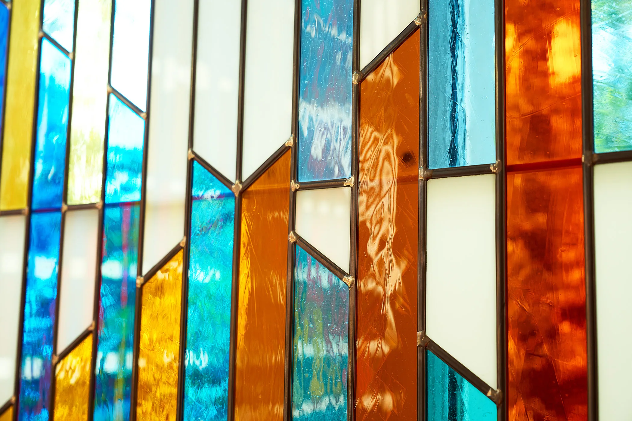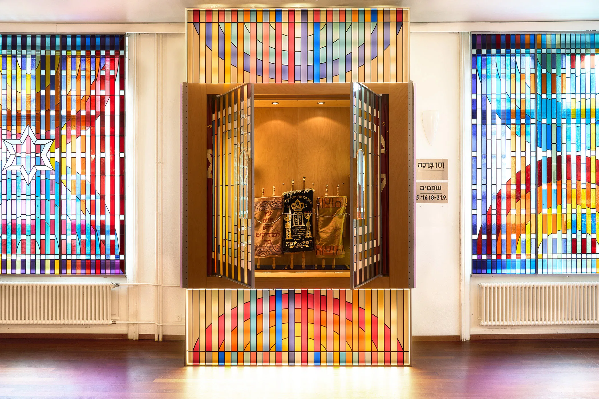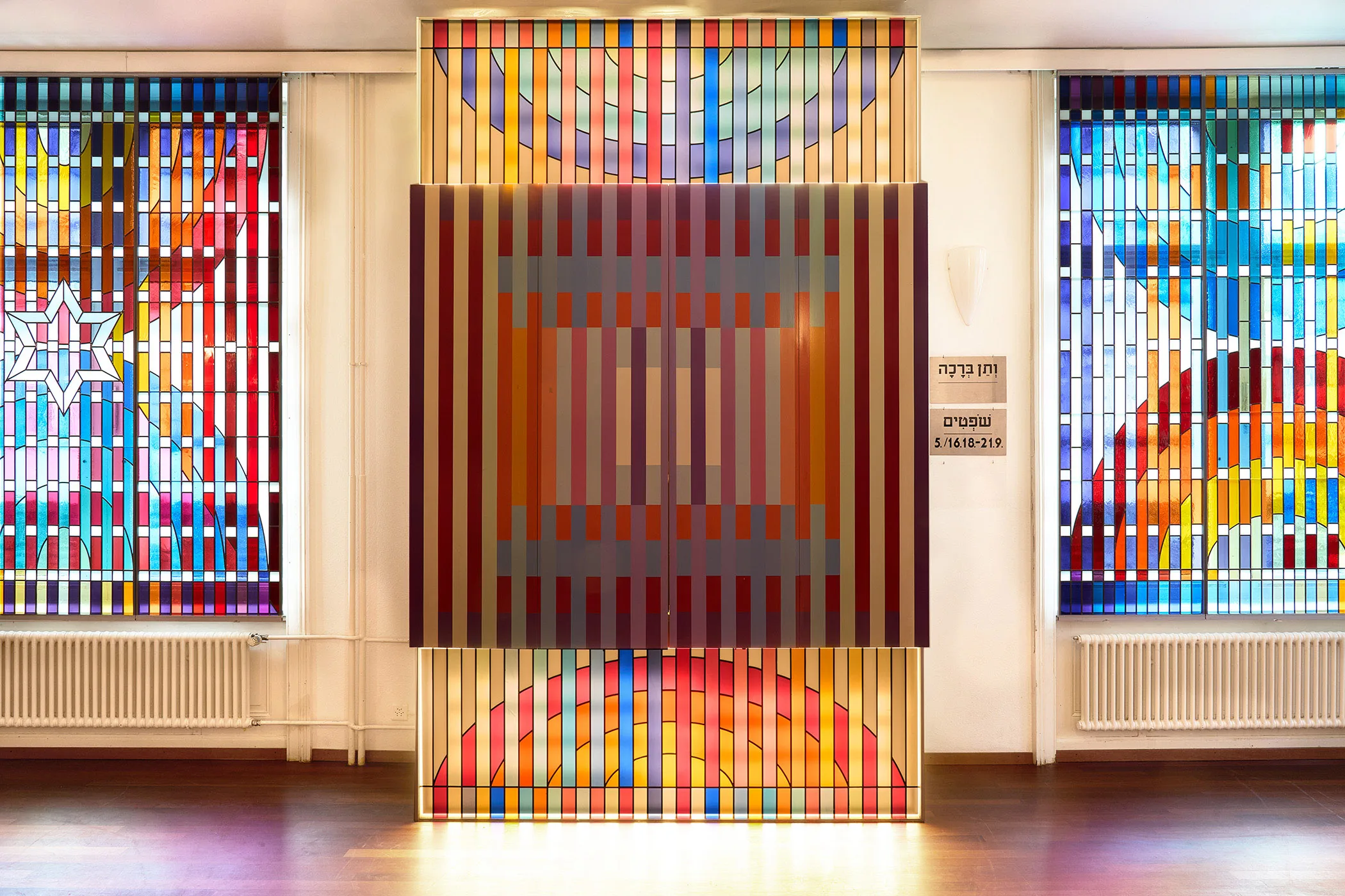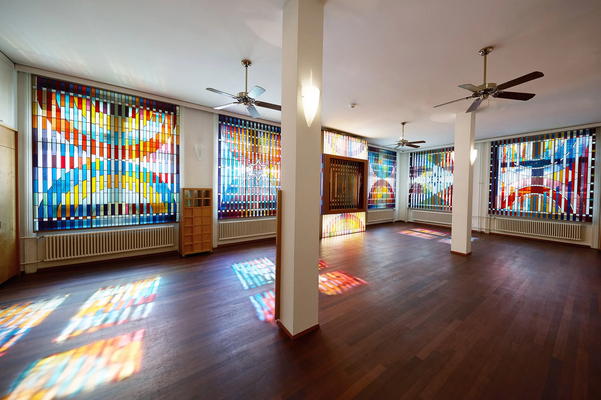Agams abstrakte Bildsprache basiert auf geometrischen Formen und der Wirkung von Farbe, die sich in diesem Saal durch die Kunstverglasungen und je nach Betrachterposition zu vielfältigen dynamischen Kompositionen verbinden. Gemäss dem zweiten mosaischen Gebot, das die Schaffung von Bildern verbietet, setzt Agam stattdessen auf die symbolische Formen der Menora und des Davidsterns als Zeichen für das Judentum.