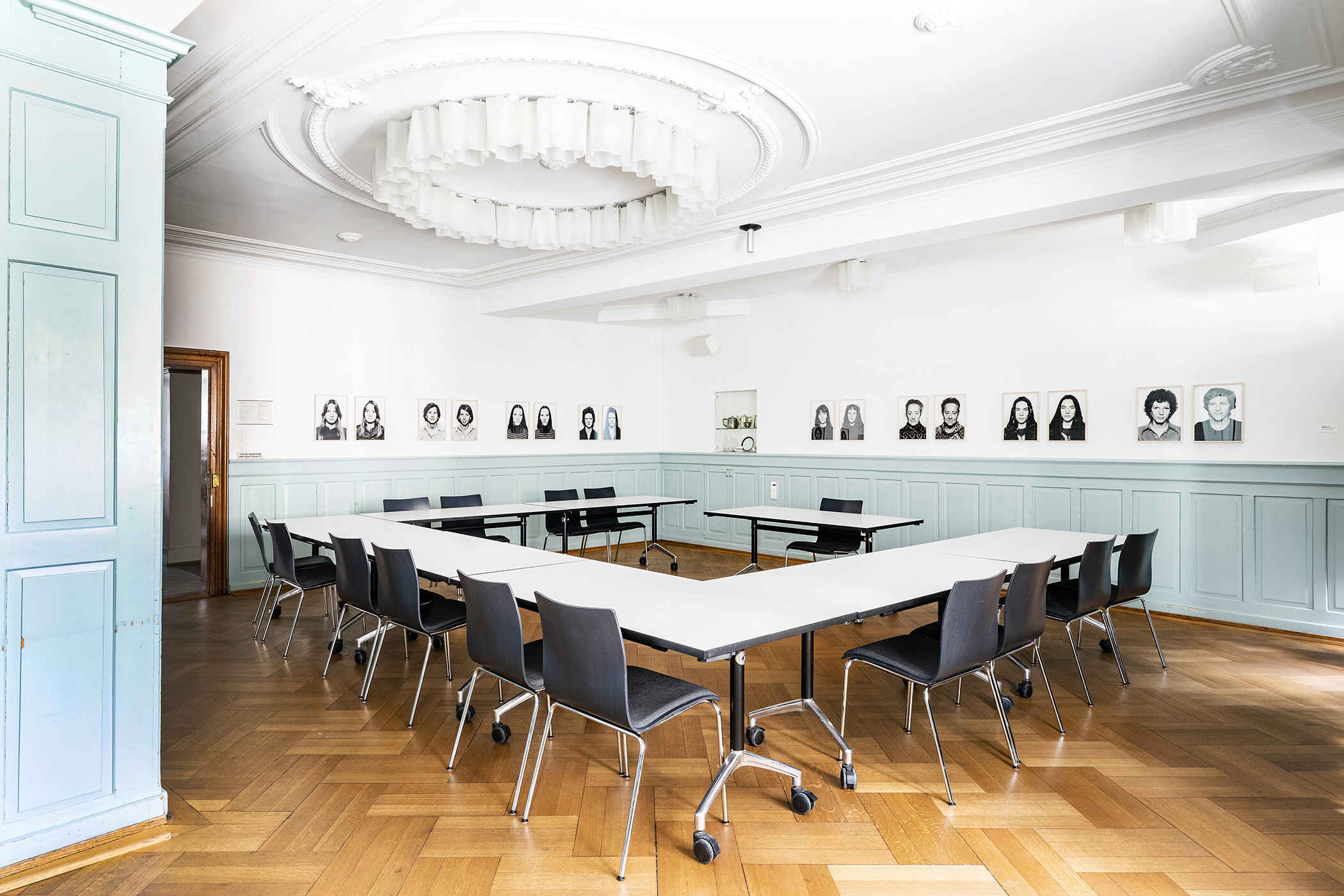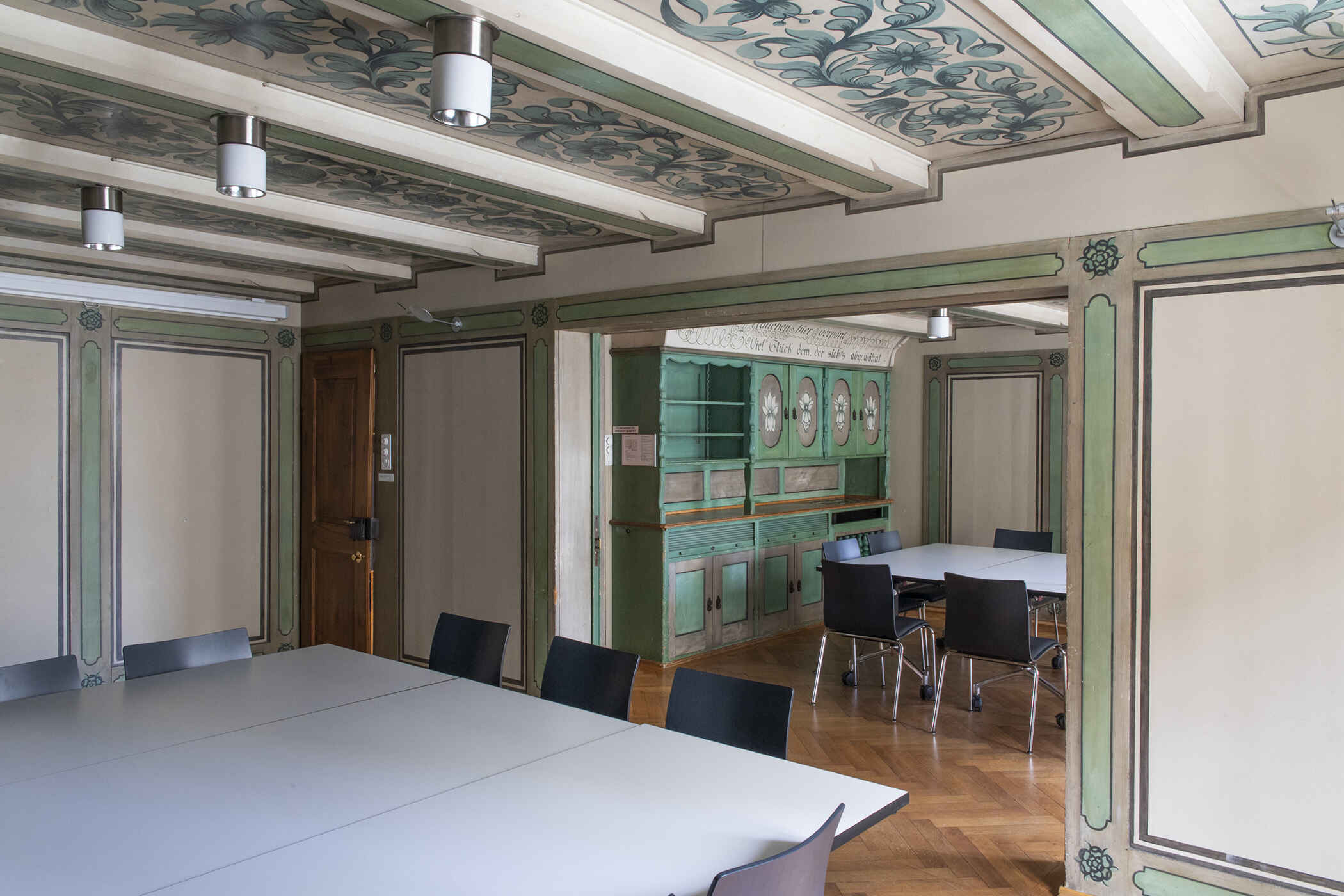 Hausrundgang mit Besichtigung der historischen Sitzungszimmer mit Originalausstattungen aus dem 17. und 18. Jahrhundert, des Innenhofes und der Dachterrasse. Es geht um die Geschichte der Liegenschaft, deren Umbauten und heutigen Nutzung.