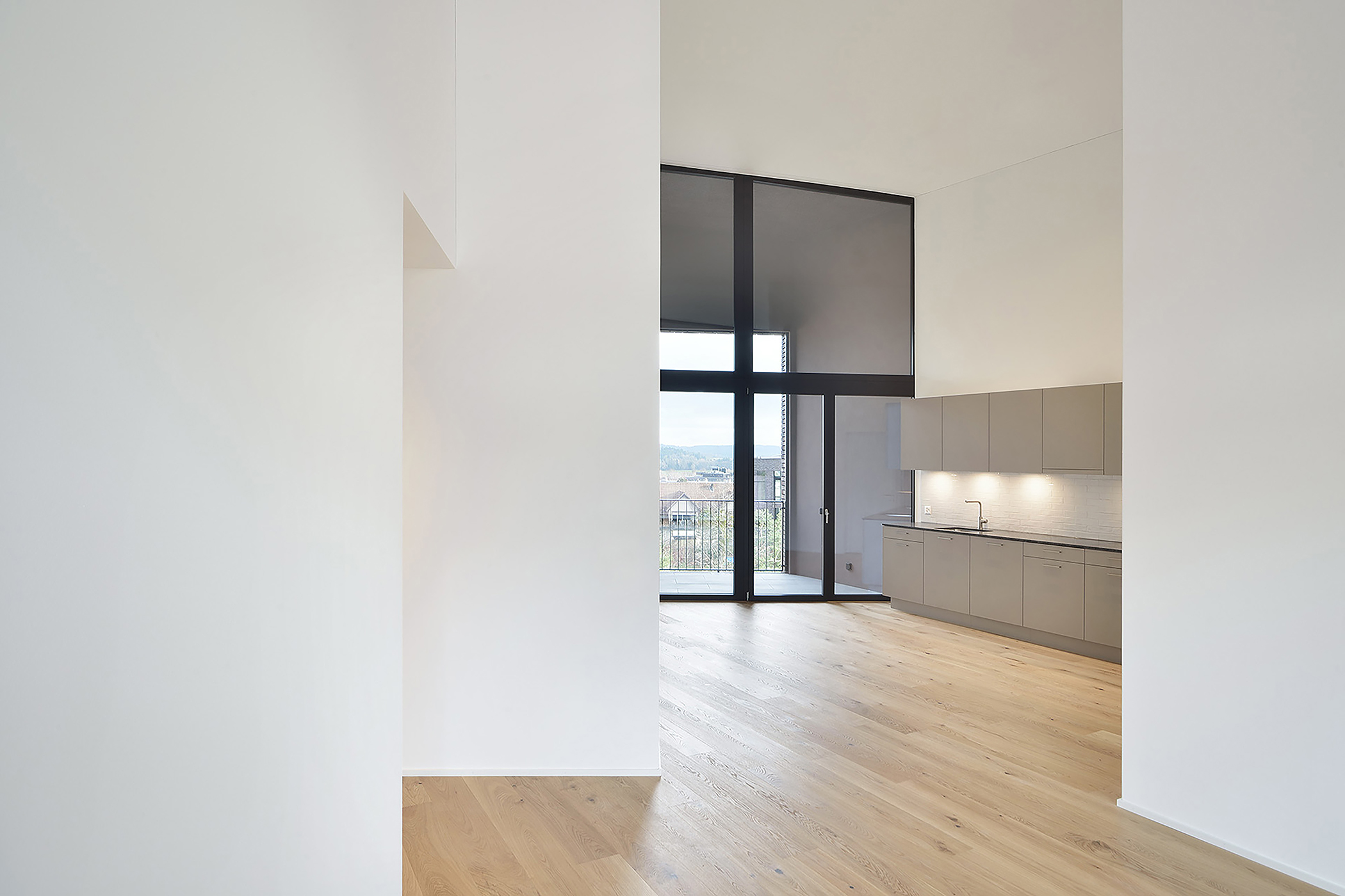 Die Wohnungen zeichnen sich durch klare Grundrisse, helle Räume und vielfältige Bezüge nach aussen aus. Loggien und raumhohe Verglasungen schaffen fliessende Übergänge zwischen innen und aussen. Auch die Treppenhäuser sind besonders gestaltet: mit Lichtöffnungen und sichtbarem Beton werden sie zu sinnlichen Erlebnisräumen.