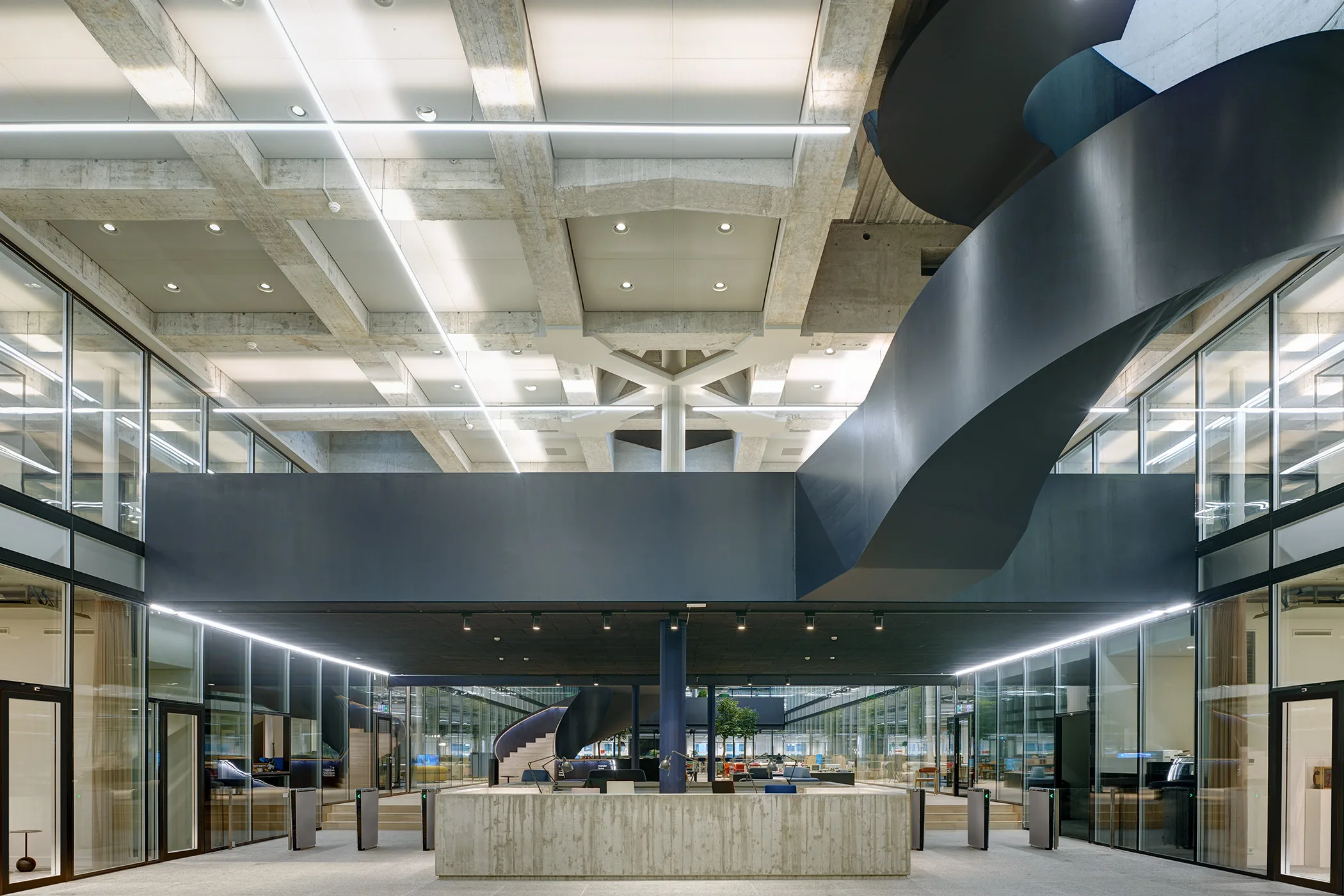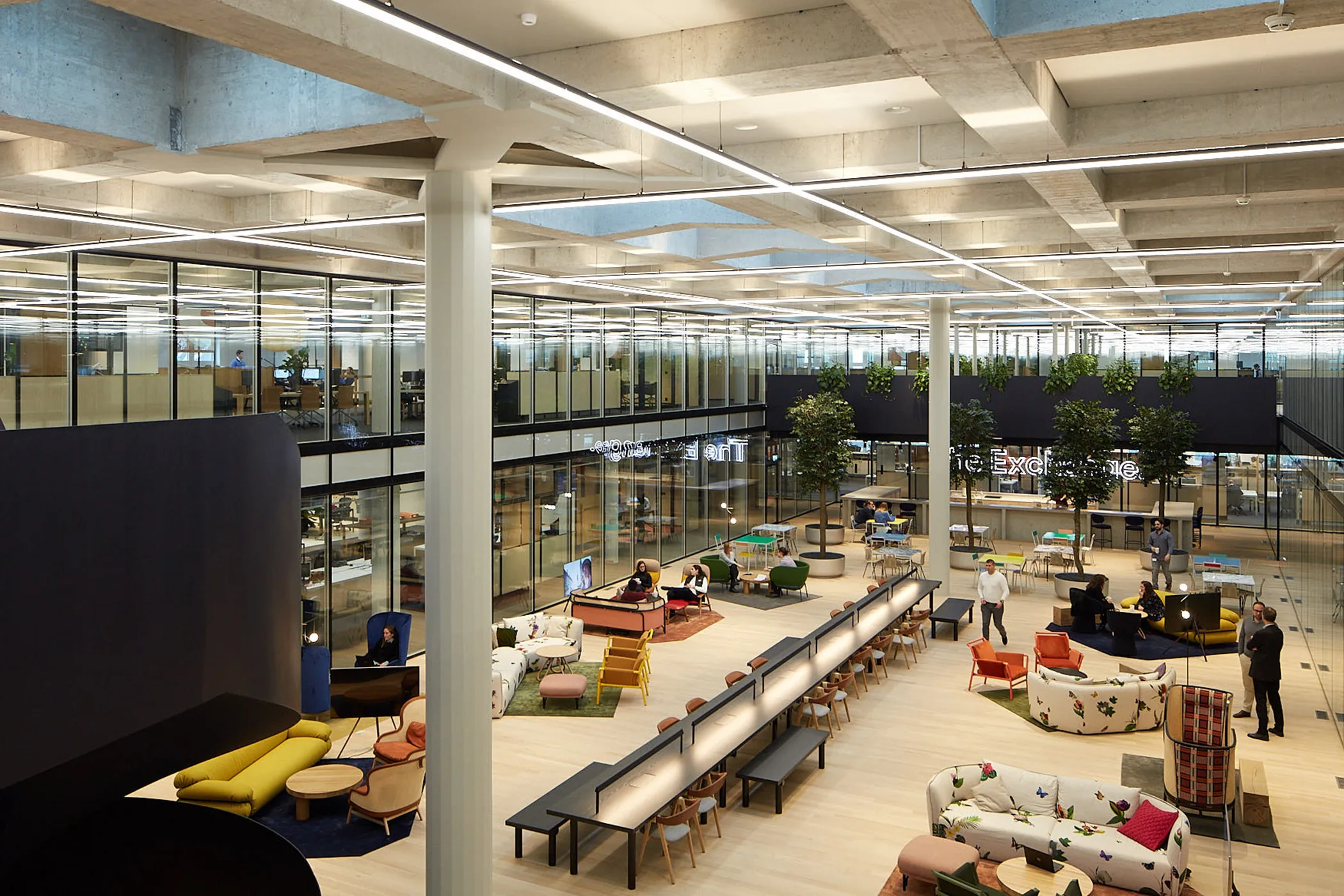 Zentrales Element des Gebäudes bildet eine 64 Tonnen schwere Wendeltreppe aus Stahl, welche die verschiedenen Etagen miteinander verbindet. Wo sich früher der Börsenring befand, bietet ein grosser offener Bereich namens «The Exchange» die Gelegenheit zum Austausch – inkl. einer Kaffeebar sowie verschiedenen Sitz- und Meetingecken.