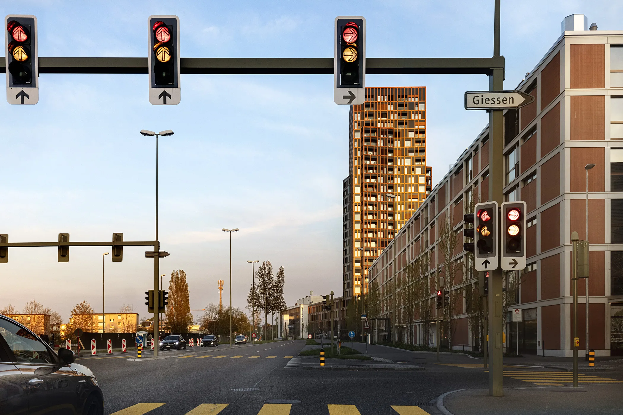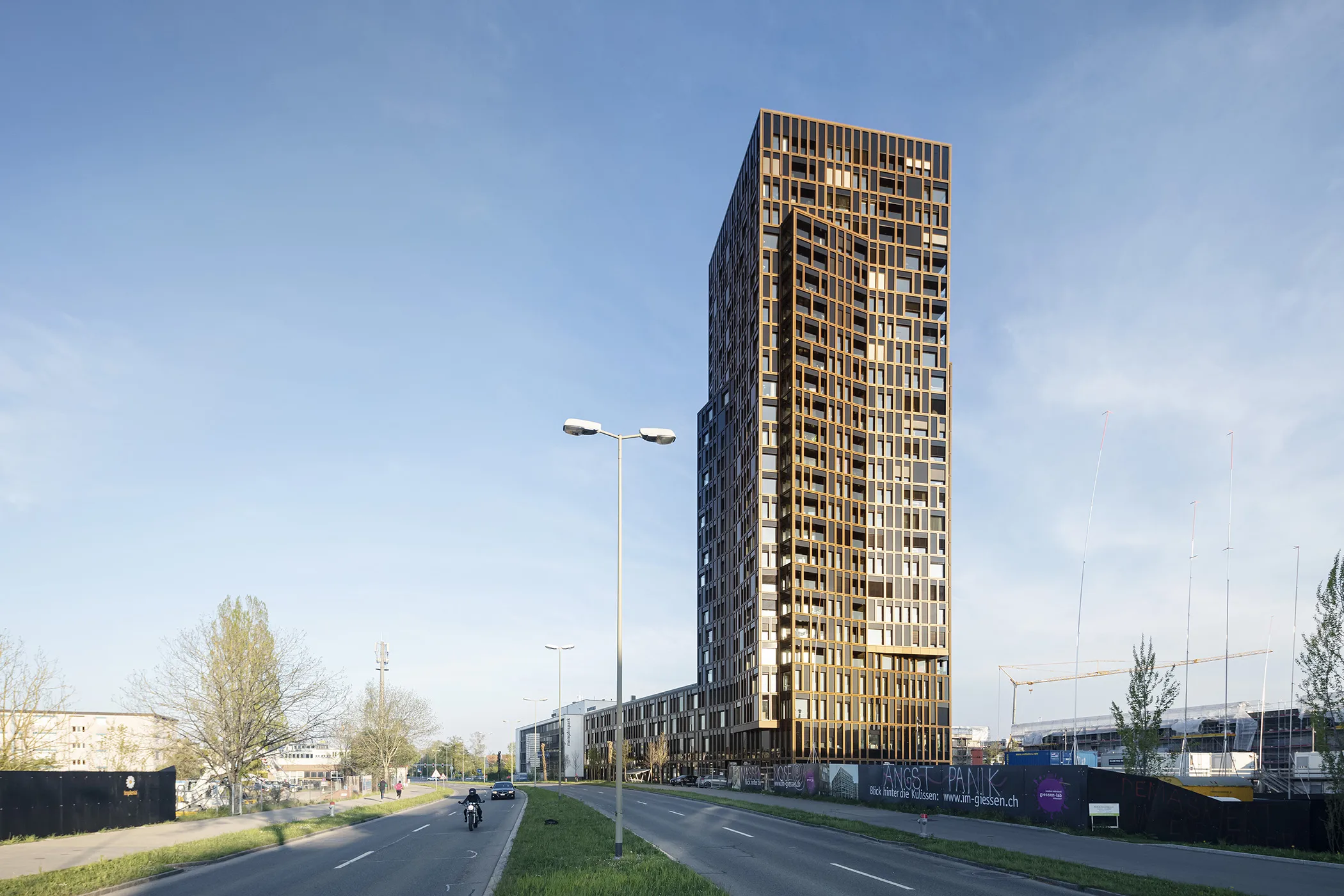 Als Teil des Giessenareal-Masterplans markiert das Hochhaus die Schnittstelle zwischen dem suburbanen Gewerbe- und Industriebereich und dem gewachsenen, kleinkörnigen Kern der historischen Gemeindestruktur Dübendorfs.