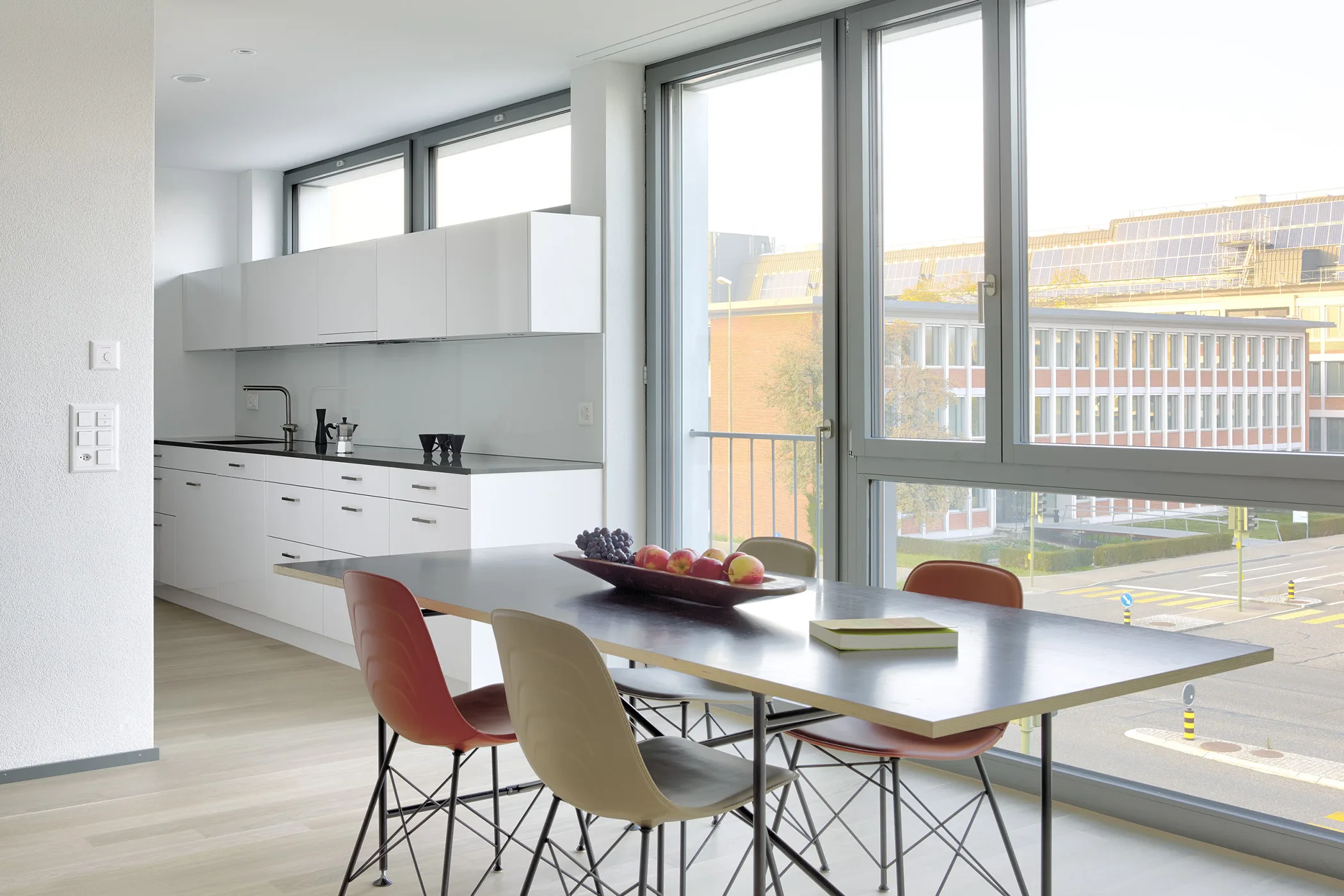 Die verkehrsreiche Überlandstrasse, der Giessenpark und die ansprechende Landschaft entlang der Glatt bilden den engeren Rahmen für die Bebauung. Aus diesen Voraussetzungen heraus wird ein einfacher, starker Gebäudetypus entwickelt, welcher sämtliche gestellten Anforderungen an ein qualitätsvolles Wohnen an diesem speziellen Ort erfüllt. Kernstück der Anlage ist ein grosszügiger, sorgfältig gestalteter Innenhof als Ergänzung, aber auch als ein identitätsstiftender Kontrast zur Umgebung. Um diesen Hof herum werden die Wohnungen angeordnet und durch die geschlossene Form des Hofgebäudes wird die vom Verkehrslärm stark beeinträchtigte Bebauung wirkungsvoll geschützt. Der Ausdruck des Gebäudes orientiert sich an Themen der näheren Umgebung. Der architektonische Ausdruck der benachbarten EMPA Bauten wird in eine der heutigen Zeit entsprechenden Sprache übertragen und neu interpretiert.