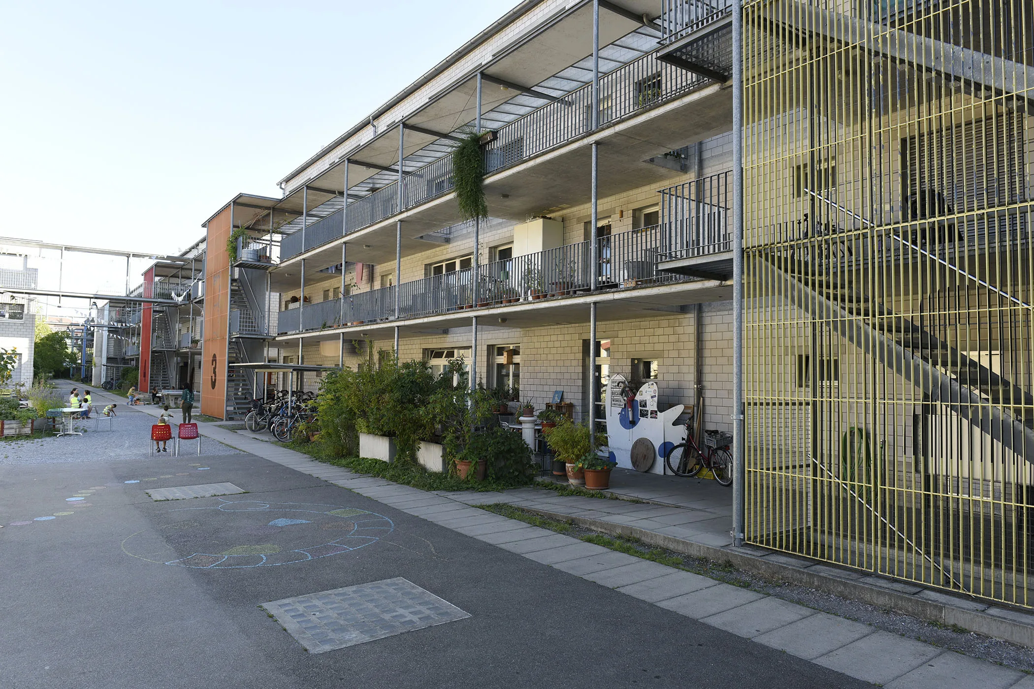 Alle Geschosse sind mit Laubengängen erschlossen, die der Fassade vorgelagert sind. Bei den Wohnungseingängen entstehen balkonartige Erweiterungen, die den Aufenthalt direkt an der Zugangszone erlauben. Zwischen den Eingängen ist der Blick frei, auf tiefer oder höher liegende Laubengänge, was vielfältige Bezüge und Kontakte ermöglicht.