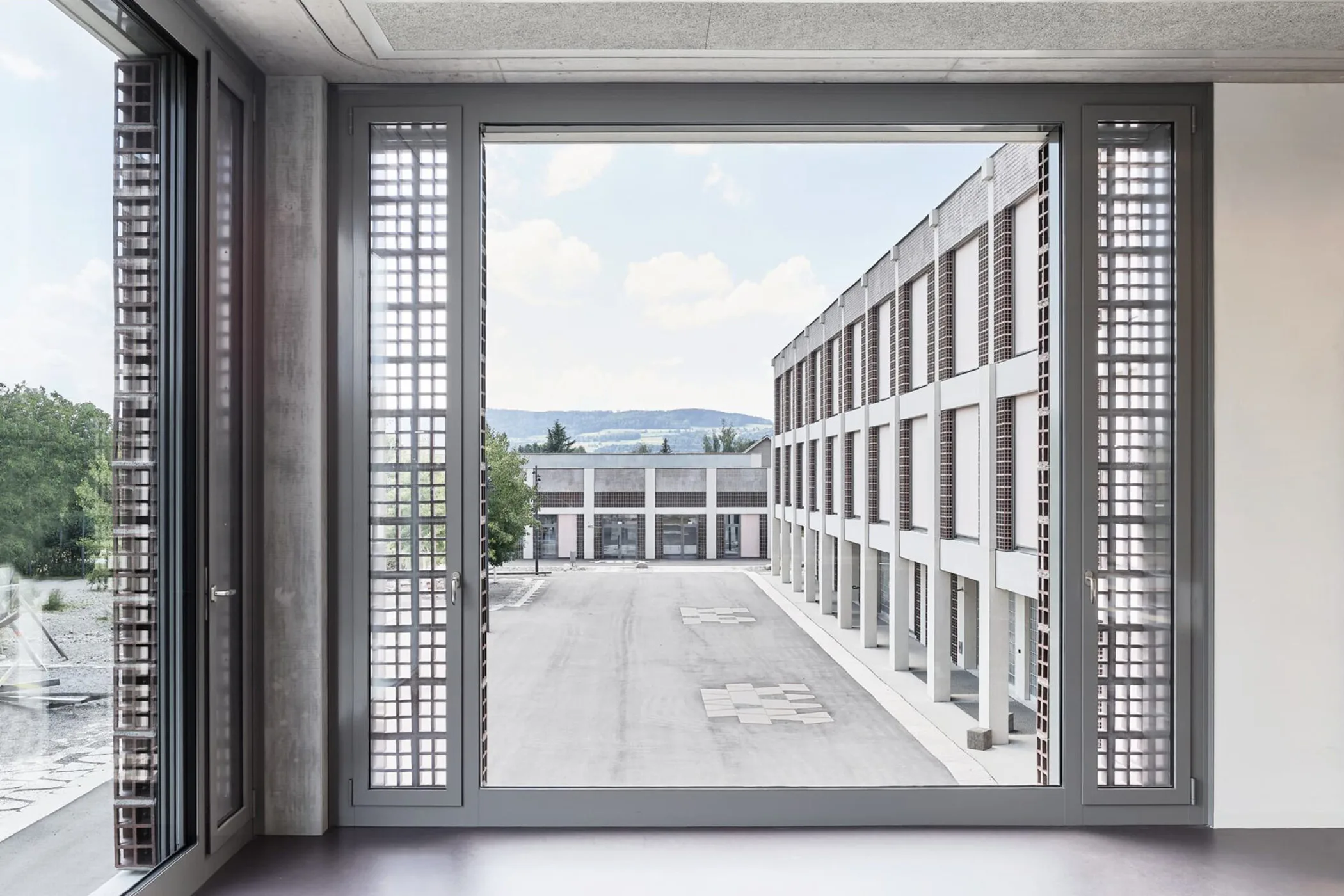 Das Schulhaus und die zu einem wesentlichen Teil im Boden versenkte Sporthalle bilden ein Ensemble, das sich um einen gemeinsamen Platz gruppiert – ein klassischer Schulhausplatz, auf dem alles zusammenfindet.