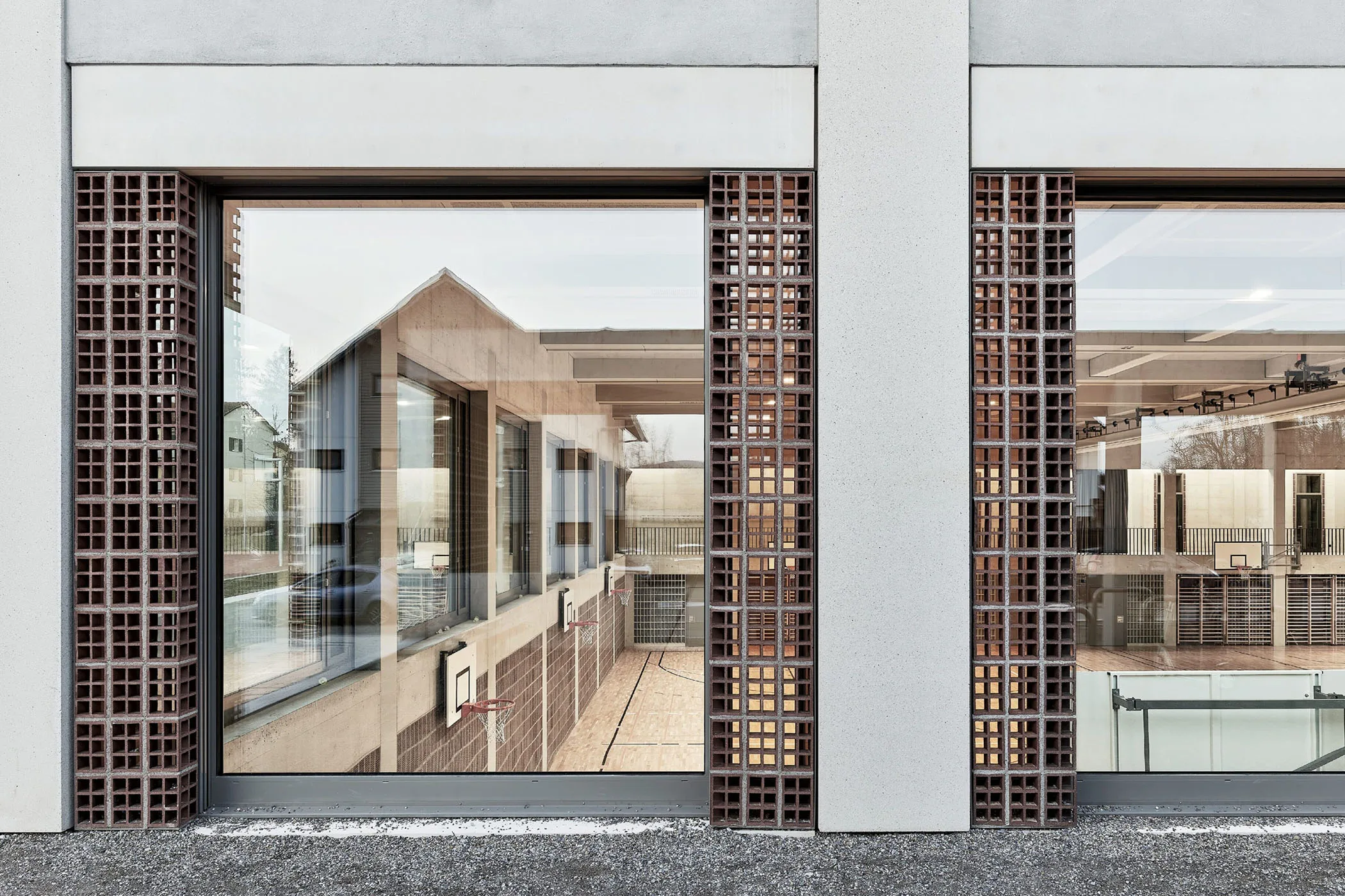 Sinnlichkeit in Haptik und Material: Der Ausdruck der Erweiterungsbauten bei der Schulanlage Krämeracker in Uster entspricht nicht unbedingt den Konventionen. Von Weitem wirken die Fassaden, als wären sie mit Ornamenten dekoriert, beim Näherkommen stellt sich jedoch heraus, dass es sich hierbei um durchaus raue und rohe Materialien handelt. Besonders die roten Terrakottasteine, zusammengefasst in schmalen Streifen, fallen sofort auf.