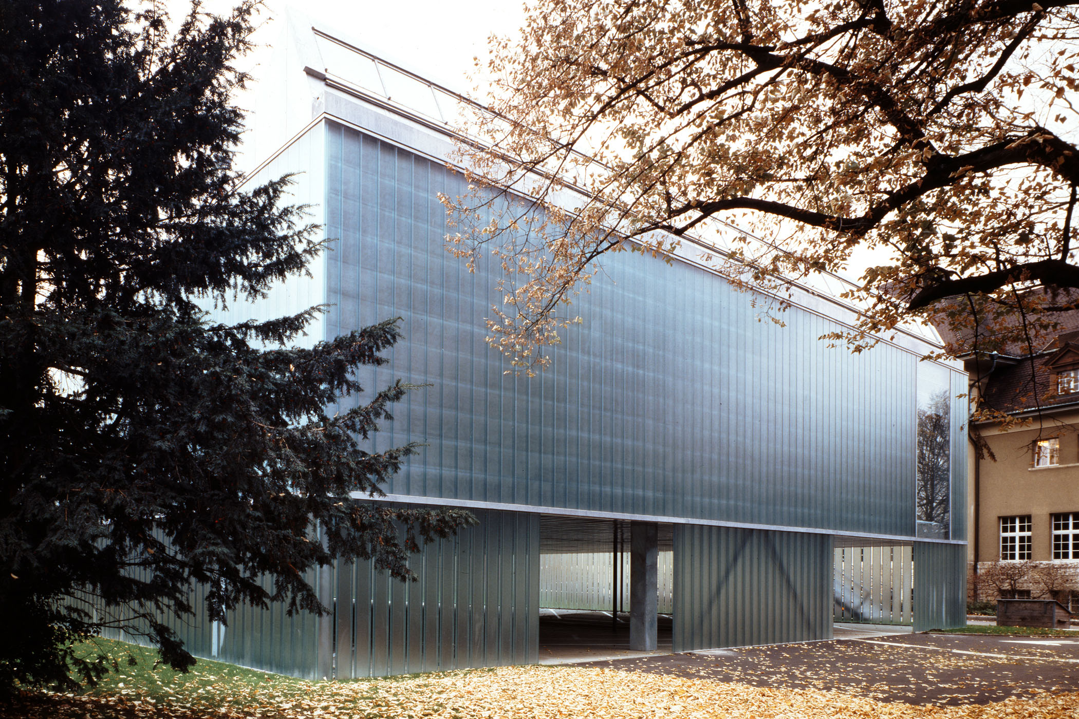 Die 1995 als kostengünstiges «Provisorium» konzipierte Erweiterung besteht aus rezyklierbaren Leichtbauelementen für Konstruktion und Verkleidung sowie massiven, belastbaren Materialien für Wände und Boden im Inneren. Vertikal aneinander gereihte Glasprofile bilden die Fassadenhülle – im Ausstellungsgeschoss als Witterungsschutz, im darunterliegenden Erdgeschoss mit offenen Fugen zur Belichtung und Belüftung der Parkebene.