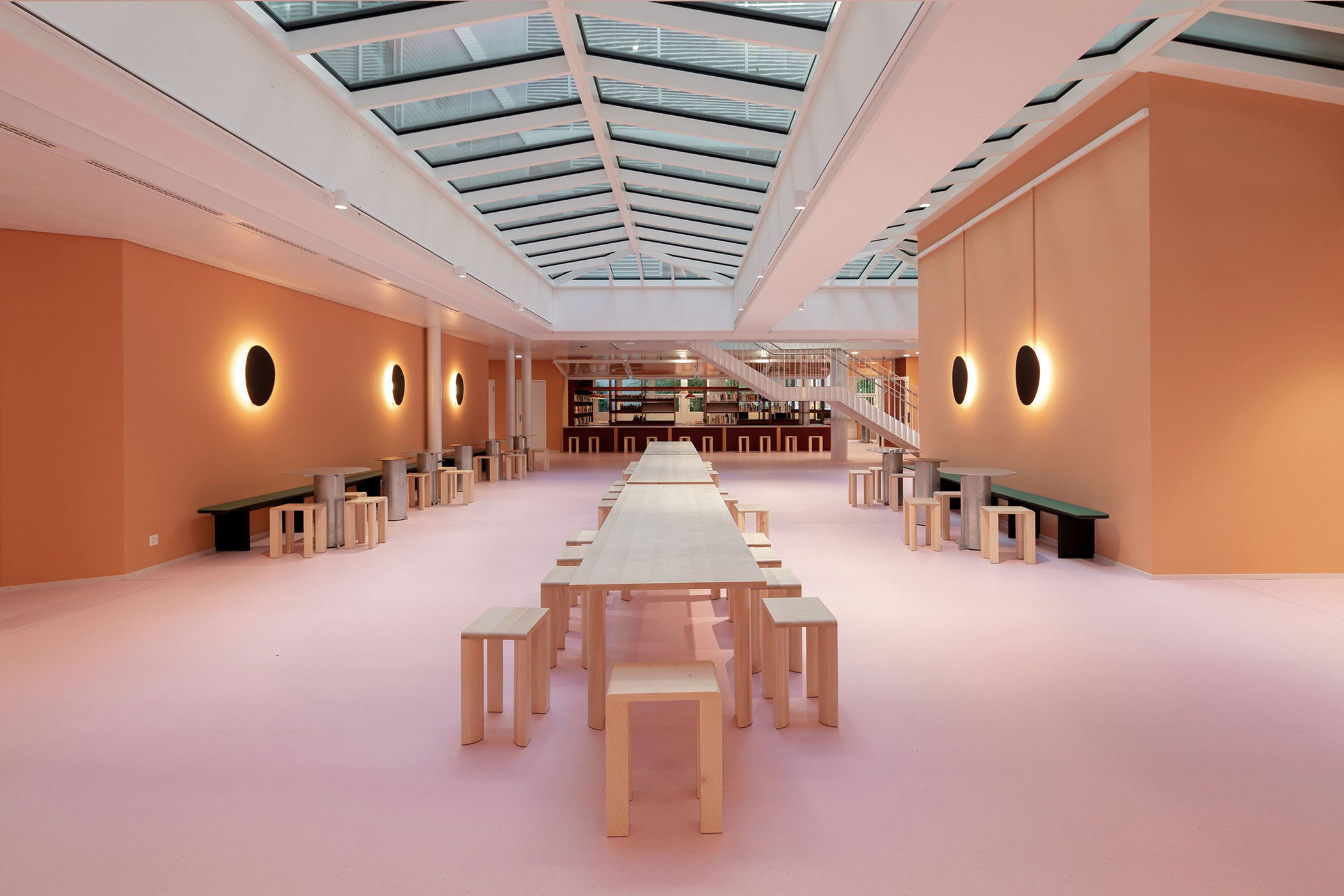 Herzstück ist der offene Eingangsbereich, die sogenannte Piazza, mit frei verschiebbaren Tischen, Stühlen und Bänken. Um die stützenden Säulen, die überall im Gebäude zu finden sind, hat das Duo runde Tischchen anbringen lassen. Sogar die Flure zwischen den Schulzimmern laden mit Bänkchen und Tischen zum Verweilen ein, Stradine (enge Gasse) heissen sie in der Sprache von Kueng und Caputo. Die Fenster der Bibliothek, mit Folie bezogene Stegplatten, die ein rosa, südländisches Licht werfen, lassen sich beidseitig öffnen. Am langen Tisch mit der hellblauen Linoleumtischplatte kann gesessen und gearbeitet werden.