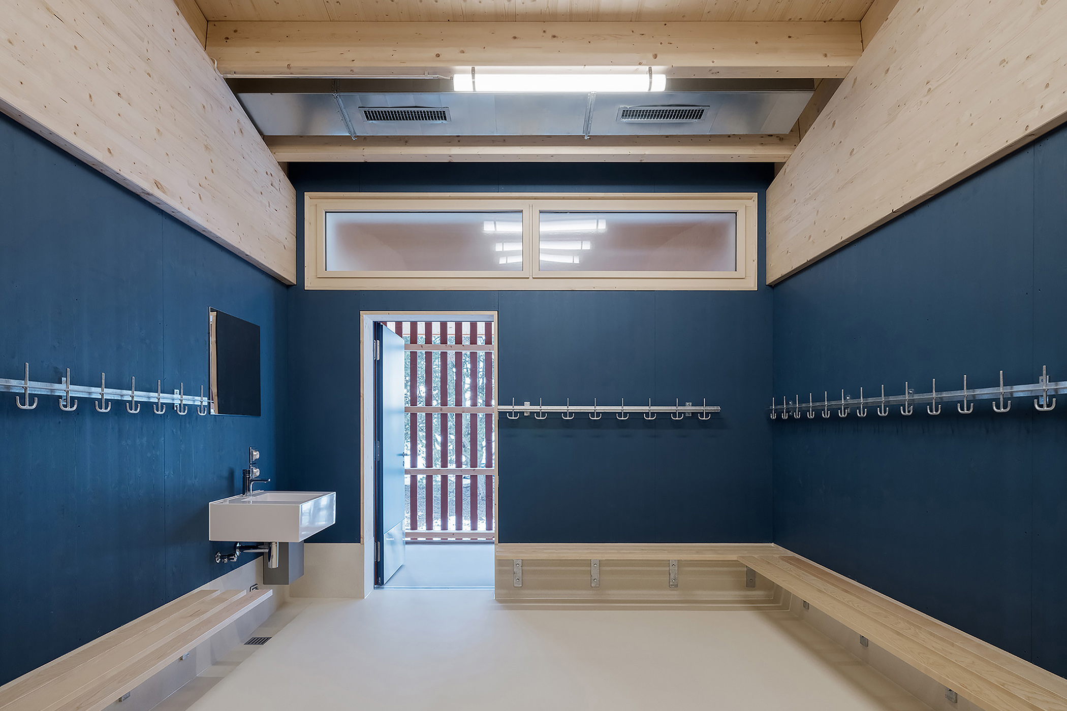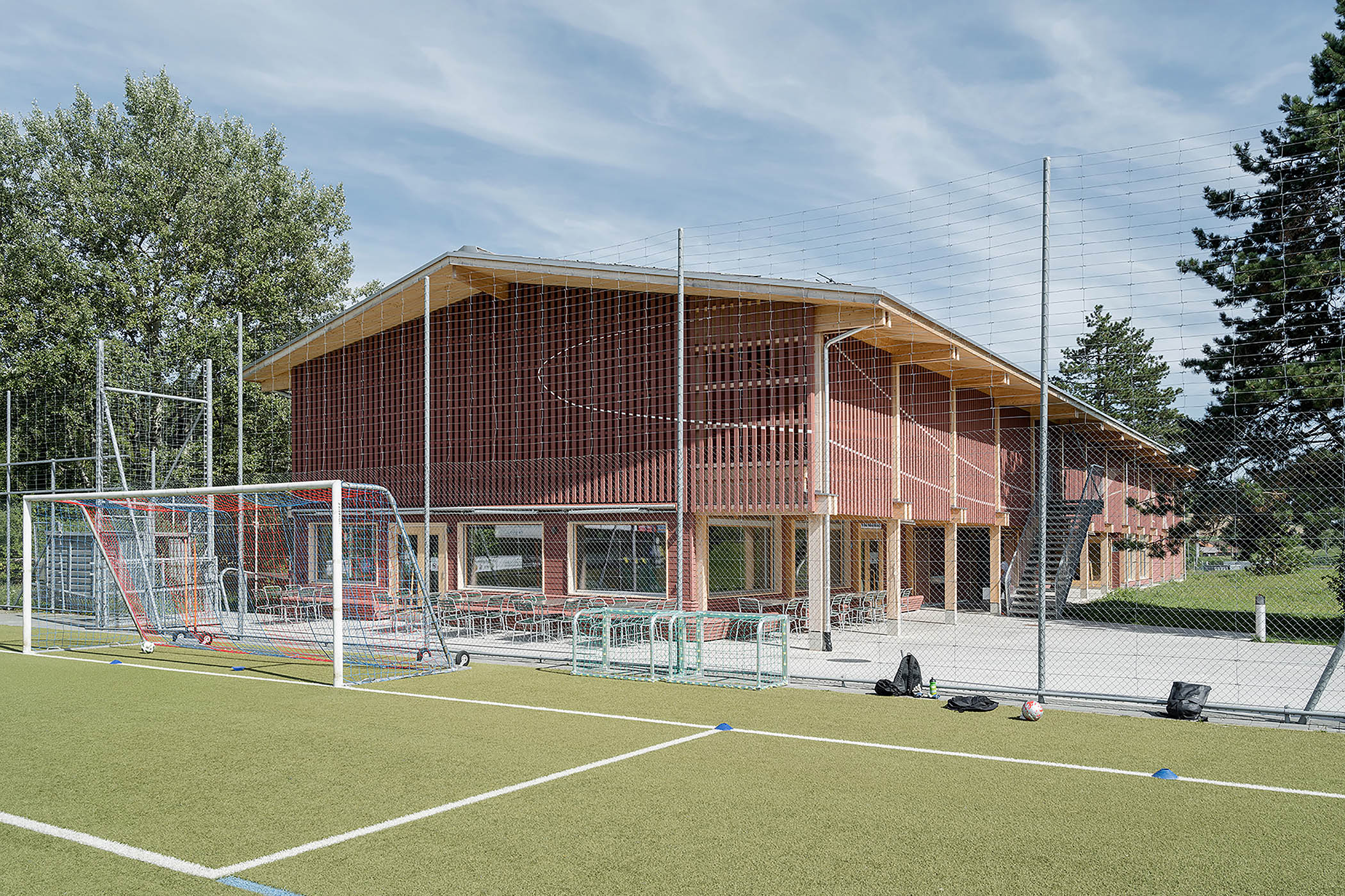 Der Neubau nutzt den Geländeversprung geschickt aus, wodurch das Sockelgeschoss ebenerdig von Norden erschlossen wird. Auf dem Sockel lasten zwei leicht versetzte Volumen unter einem Dach. Sie definieren einen öffentlich zugänglichen Weg diagonal durch das Haus und das Grundstück. Das Gebäude integriert sich harmonisch in die Umgebung, holt Besuchende und Sportler ab und ist zum zentralen Anlaufpunkt der Sportanlage im Naherholungsgebiet geworden.