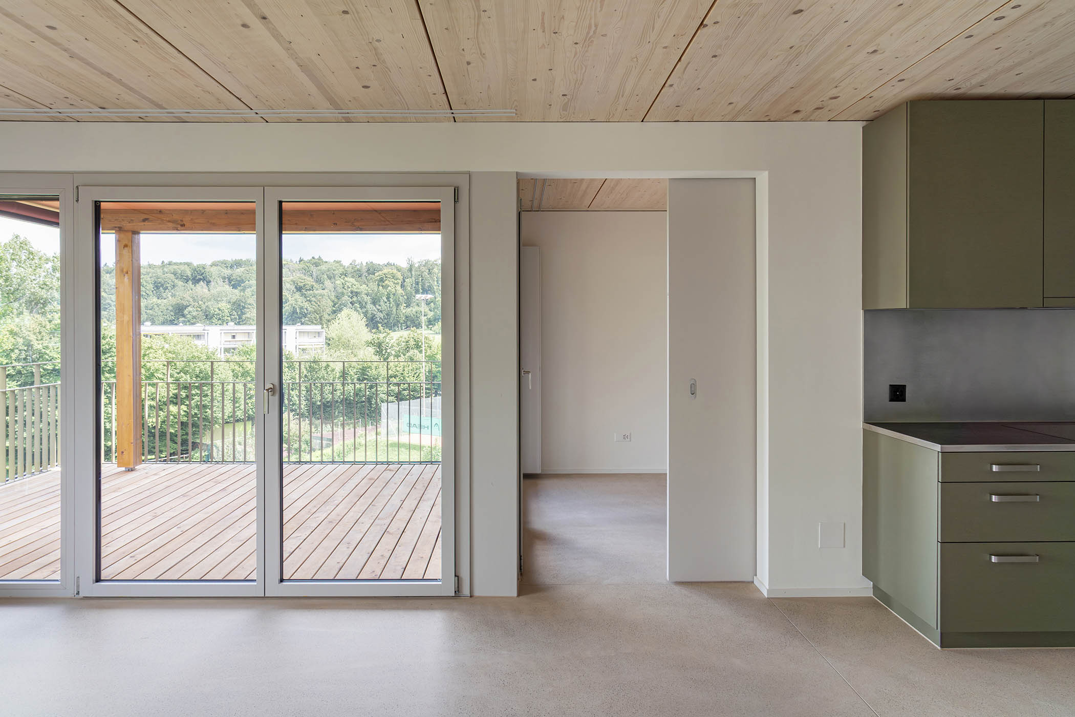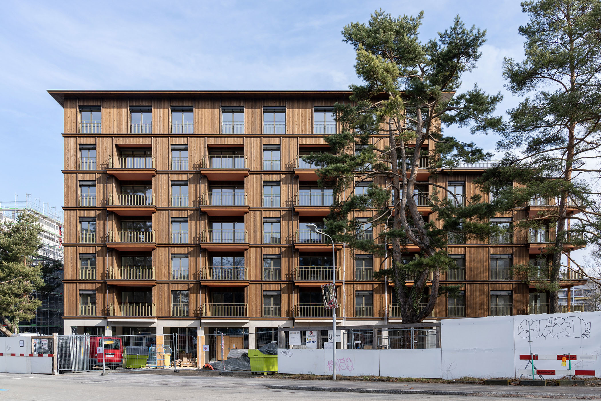 Der Neubau nördlich der ETH Hönggerberg ist Teil eines Ensembles von insgesamt drei Gebäuden, die Fischer Architekten für die Baugenossenschaften Hagenbrünneli und Turicum realisieren. Die tiefen, kompakten Volumen entwickeln die bestehende Siedlung am Lerchenberg kohärent weiter und stärken die vorhandenen Qualitäten des Orts, zu denen insbesondere die weitläufigen Grünflächen zählen. Als Erstes ist im Oktober das Gebäude der Genossenschaft Hagenbrünneli bezugsbereit. Es beherbergt 48 altersgerechte Wohnungen, eine zusätzliche Clusterwohnung mit 10 Einheiten, grosszügige Gemeinschaftsräume sowie ein Café und den Tennisclub Lerchenhalde. Untergeschoss, Erdgeschoss und Treppenhauskern sind als Stahlbetonkonstruktion ausgebildet, während die über dem Sockel liegenden Wohngeschosse in traditioneller Holzbauweise mit vorgefertigten Wandelementen und Vollholzdecken konstruiert sind.