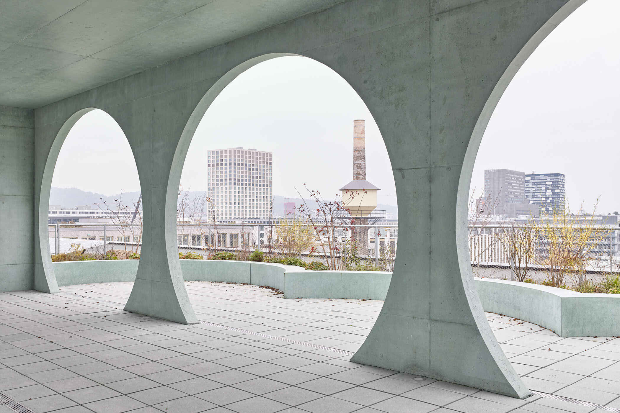 Das Bürogebäude liegt an der Hardbrücke in der Nähe des Escher-Wyss-Platzes, wo sich Infrastruktur und aktive Industriearelae an gewerbliche und kulturelle Bauten reihen. Das Haus greift die Dynamik der aktuellen Situation auf und knüpft gleichzeitig an die Industriegeschichte des Viertels an. Grosszügige Auskragungen an beiden Enden des Hauses offerieren eine kontrollierte Durchlässigkeit und bieten überdachte Freiflächen für Nutzungen im Erdgeschoss. Die aussen tragende Betonkonstruktion ist in lange, aus grünlich eingefärbtem Ortbeton gefertigte Querträger und in vorgefertigte schwarz eingefärbte Stützen unterteilt. Tiefe Pflanzentröge an der Kopfseite der Balkone beinhalten eine reiche Variation von Buschgewächsen in verschiedenen Farben und Formen als eine angemessene und abstrakte Art und Weise, um «Grün» in den intensiv bebauten städtischen Kontext einzubringen.