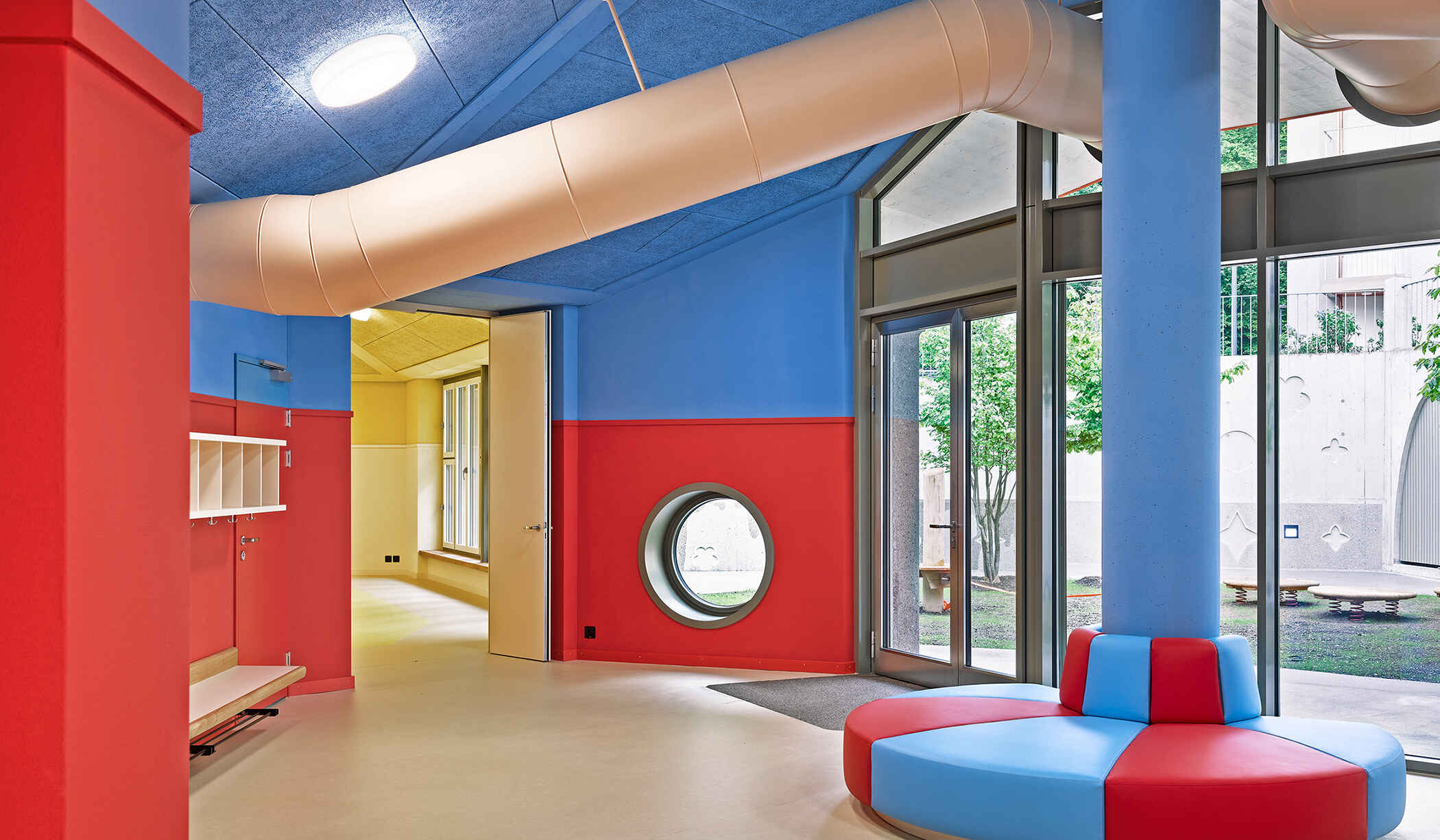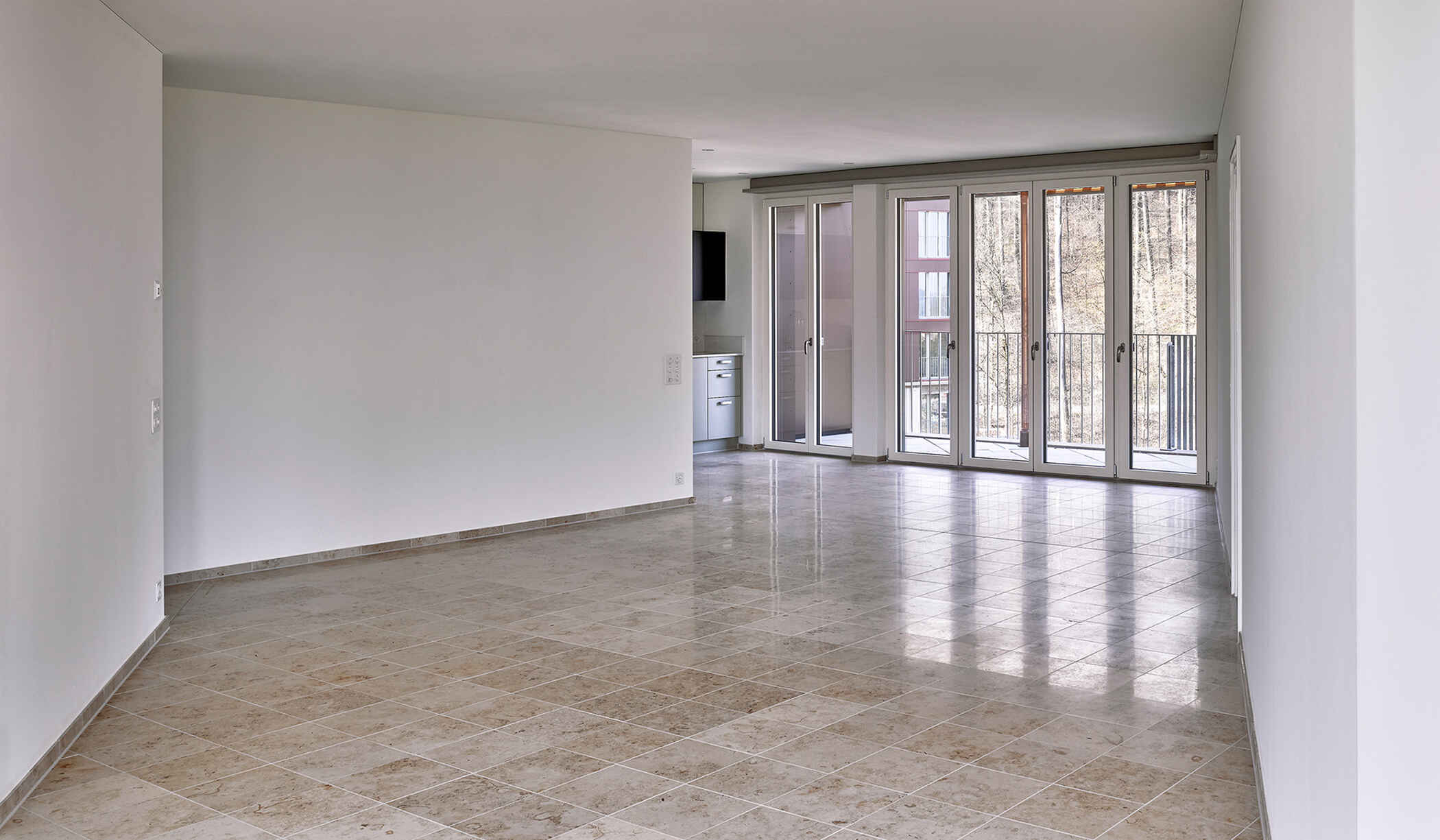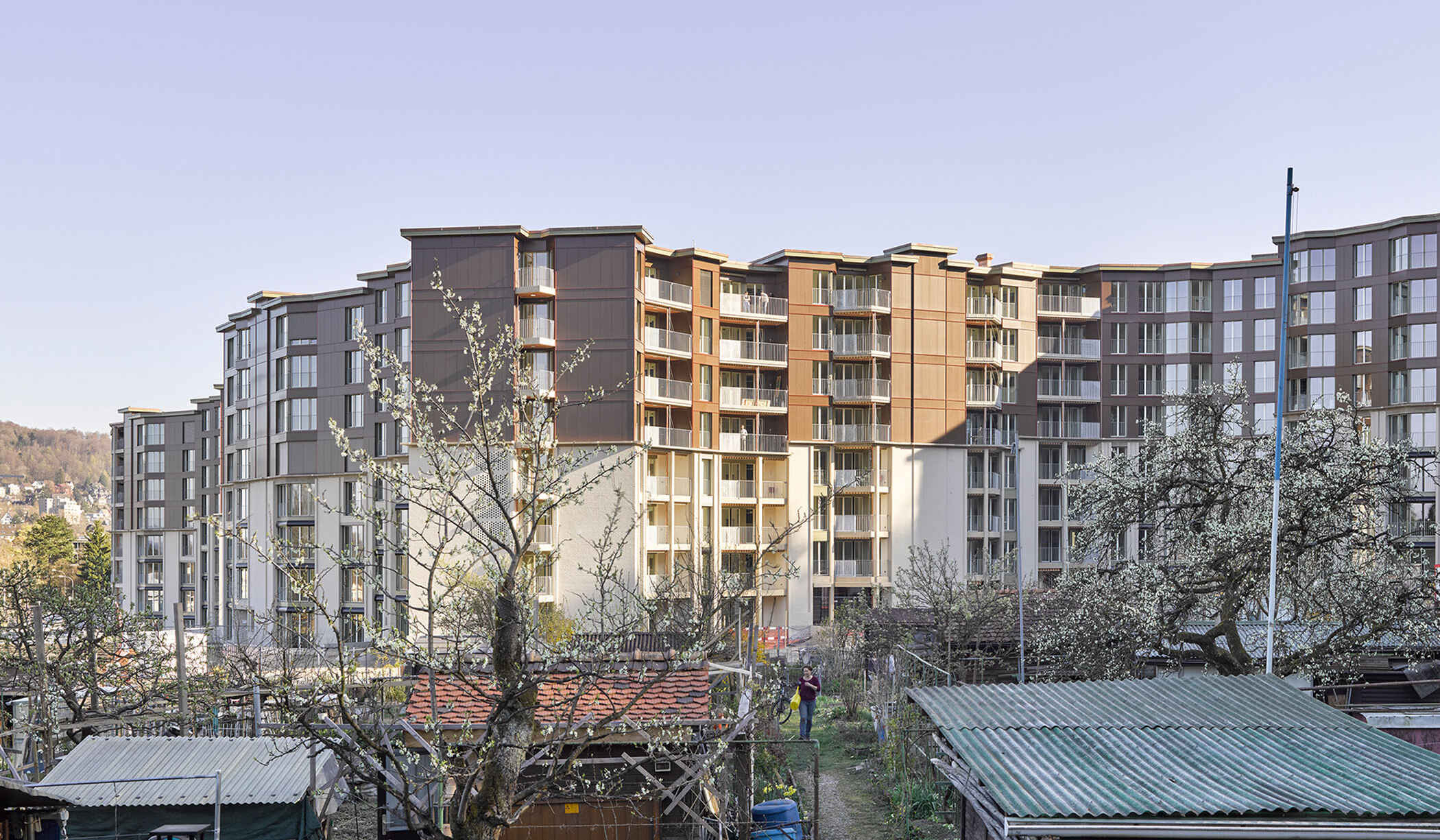 Die gekrümmte Geometrie ergibt eine Grundrissform mit wenig Fassadenanteil und vergleichsweise grossen Raumbreiten im Inneren. Infolge der Mischorientierung haben die meisten Wohnungen zwei Balkone oder ersatzweise einen Fassadenerker.