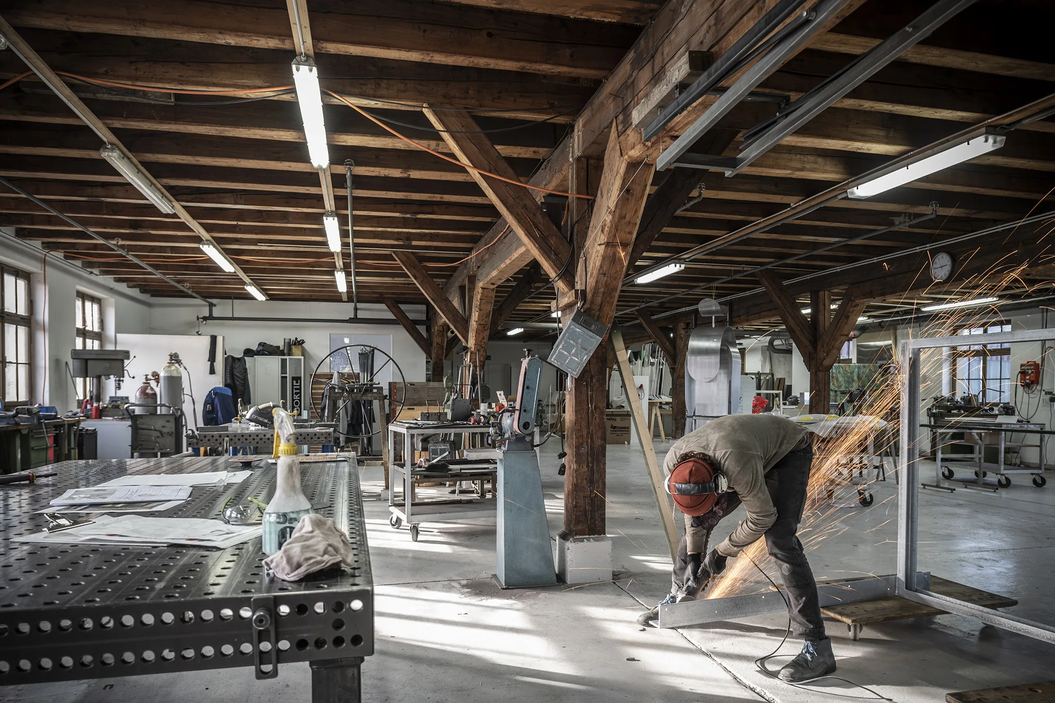Zwischen alten Holzbalken wurde nach dem ersten Weltkrieg Obst für die Versorgung der Zürcherinnen getrocknet. Heute schweissen wir kleine und grosse Metallobjekte für Architekt*innen, Kund*innen und Künstler*innen. Wir planen und entwerfen eigenständige Produktionen, von der Lampe über das Möbelstück, bis hin zur konstruktiven Tragstruktur.
