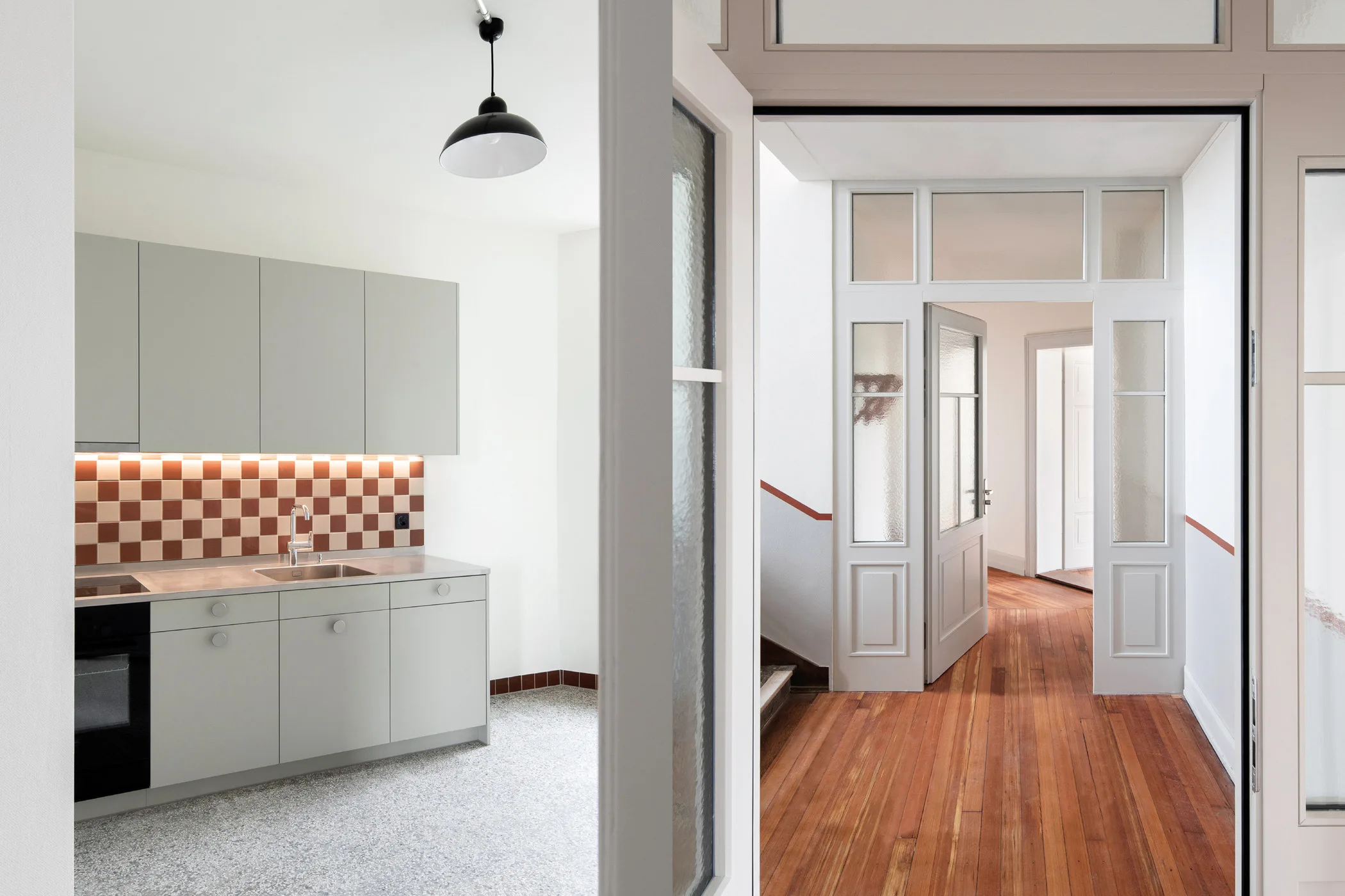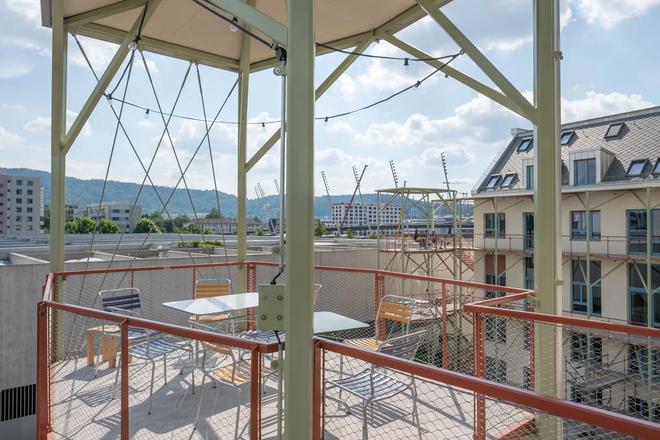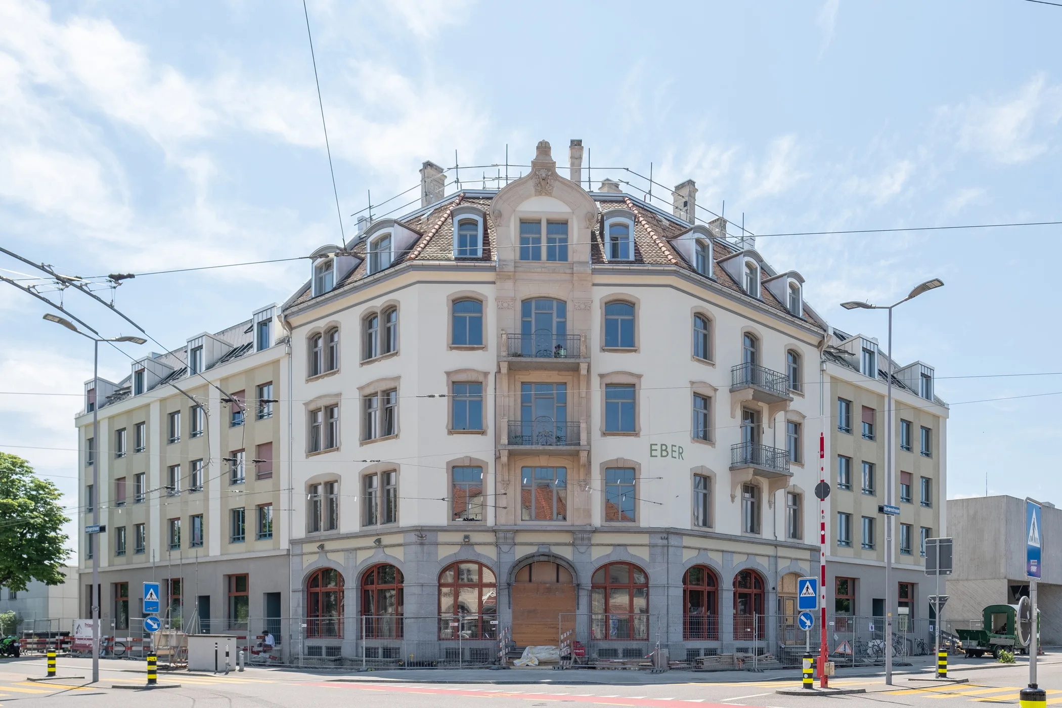 Das 1904 erbaute „Haus Zum Eber“ wurde unter Begleitung der Denkmalpflege gesamtsaniert und beidseitig um ein Segment erweitert. Die beiden Anbauten führen die vertraute Gebäudetypologie des Randgebäudes weiter, wodurch der Innenhof grosszügig freigespielt wird. Es entsteht ein Ensemble aus Alt und Neu, das auch in der Farbe und Materialisierung verschiedene Bezüge aus der Umgebung aufnimmt. Ein hofseitiger Laubengang verbindet die drei Gebäudeteile und lässt alle am gemeinsamen Innenhof und den ihn einfassenden Balkontürmen teilhaben. Über eine Schnittlösung mit Splitlevel entstehen Überhöhen in den Geschossen, die jeweils die gemeinschaftlichen Bereiche auszeichnen. Die Offenheit der Wohnungen zum Laubengang erlaubt spontane Begegnungen und fördert den Austausch. Besonderes Augenmerk wurde dabei aber auch auf Rückzugsmöglichkeiten gelegt.