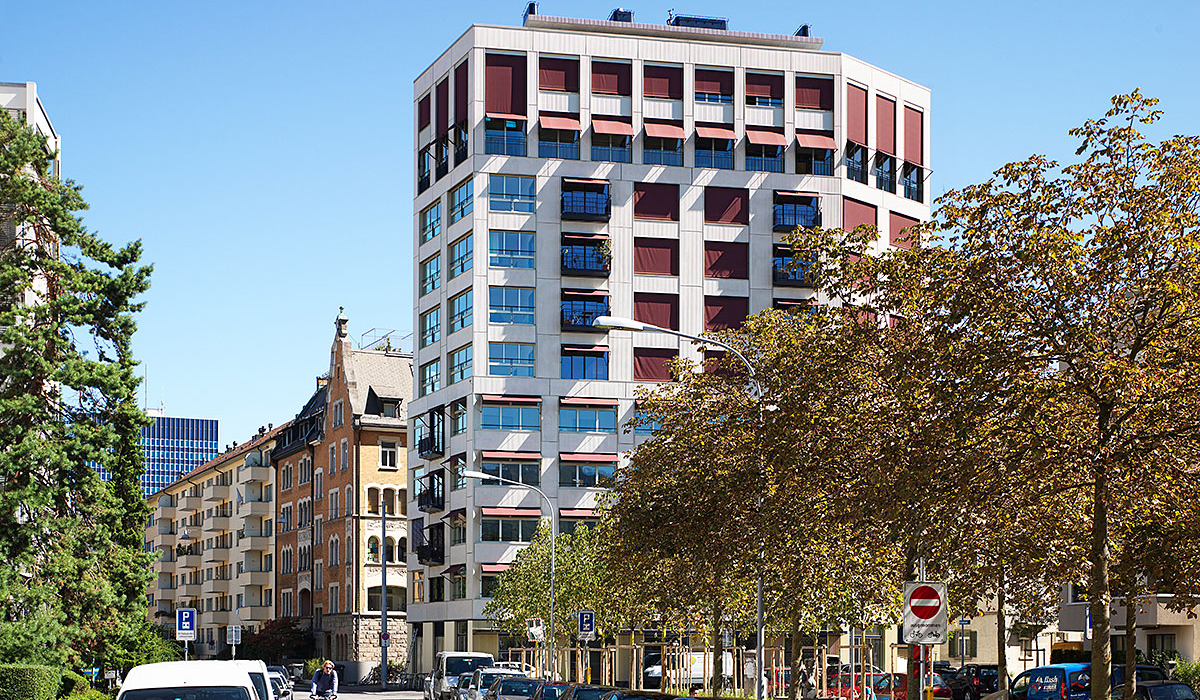 Mit seinen knapp 40 Metern Höhe knüpft das Wohnhaus an die akzentuierenden Hochhäuser im Gründerzeit-Quartier an. Zwei verschiedene Grundrisstypen reagieren auf die unterschiedlichen Wohnsituationen: Die Wohnungen der unteren Geschosse thematisieren das Wohnen innerhalb der Blockrandstadt und kommunizieren über den Wohnraum an der Längsseite zum gegenüberliegenden Platz. Darüber beginnt das Wohnen im Hochhaus, die dreiseitige belichteten Wohnräume an den Schmalseiten orientieren sich nun an der Längsrichtung des Limmattales. Die Küchen verbinden sich dank ihrer grossen Schiebetüren mit der Weite des Stadtraumes und verwandeln sich in grosszügige Aussenzimmer. Die Dachterrasse steht allen Bewohnenden zur Verfügung, ein Café und eine Bar im Erdgeschoss schafft die Verbindung zum Platz.