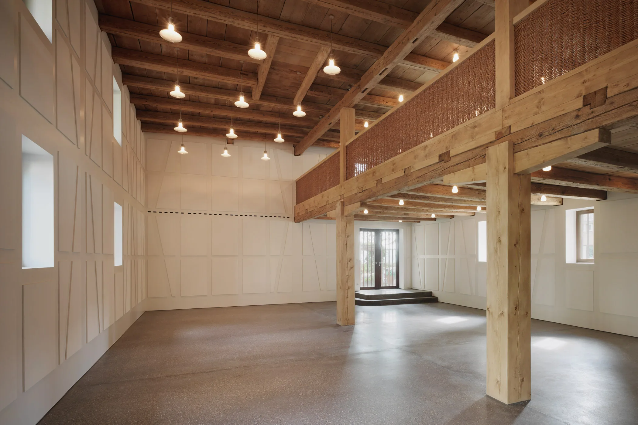 In der Trotte wurden spätere Einbauten entfernt, um den Raum in seiner ursprünglichen Grösse wiederherzustellen. An den Aussenwänden wurde eine neue Wandverkleidung aus Akustikplatten angebracht, die als Relief das darunterliegende Holzfachwerk der Fassade nachbildet.