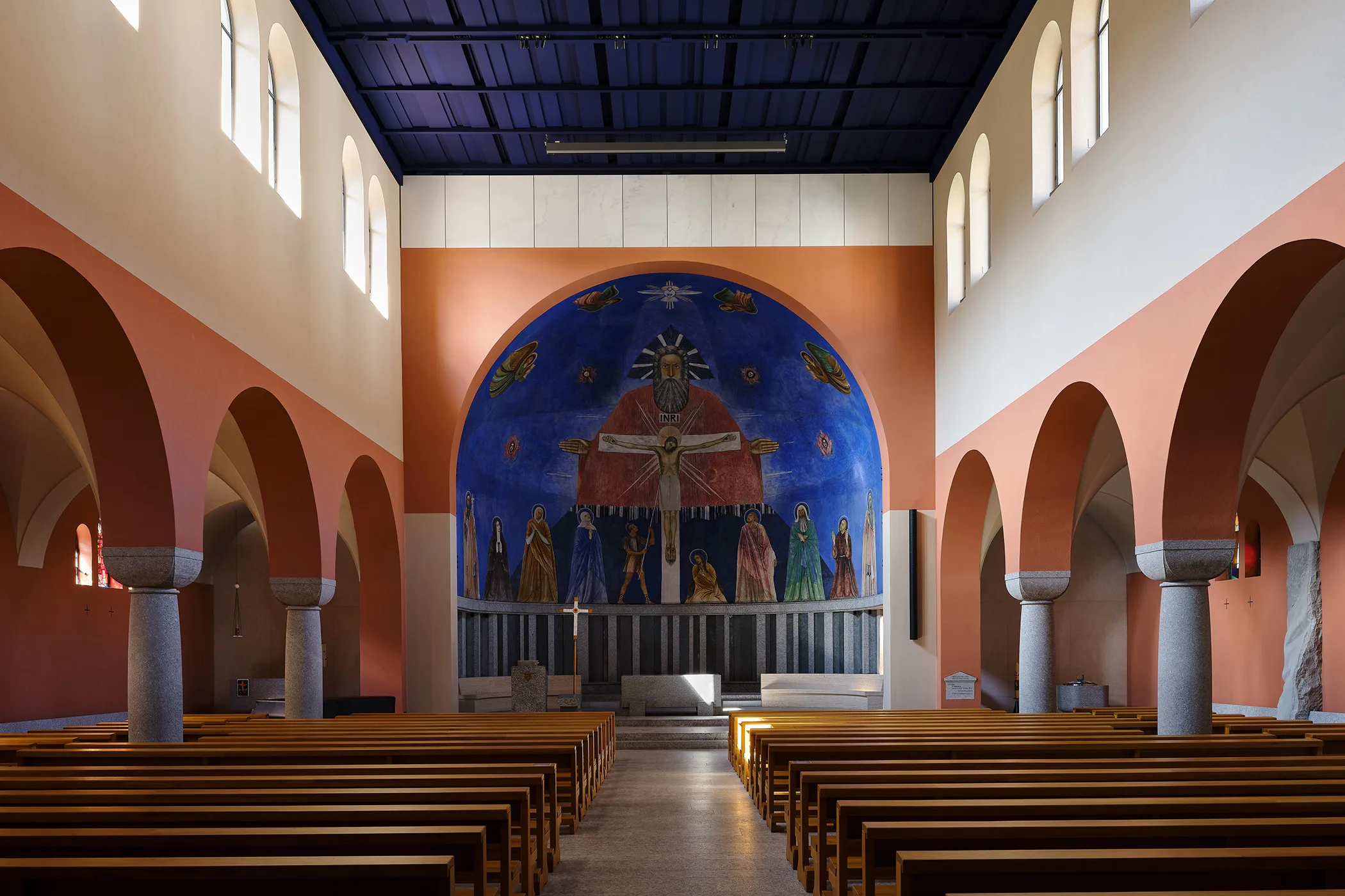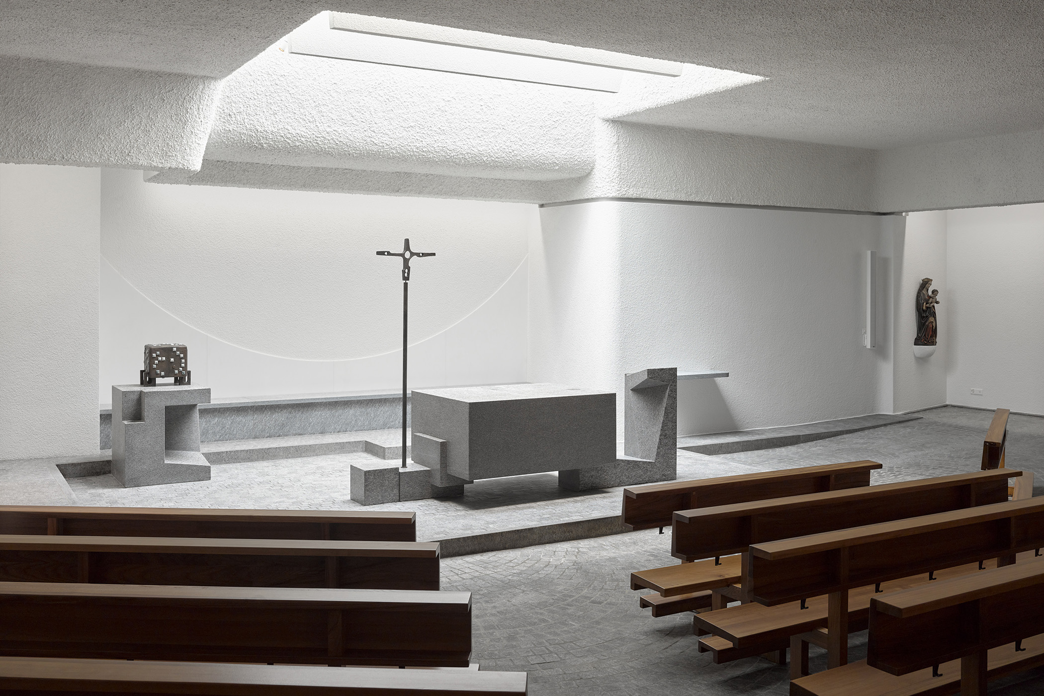 Das Weiterdenken im Bestand ermöglichte eine Umgestaltung ohne Kraftakt: es war weder zwänglerisches Ziel, das Alte analog nachzubilden, noch wurde mit allen Mitteln versucht, eine neue Sprache über das Bestehende zu stülpen. Vielmehr wurde den zwei Fragen nachgegangen: Wie wurde die Kirche gedacht? Wie kann mit einfachen, heutigen Mitteln wieder eine räumliche Intensität geschaffen werden?