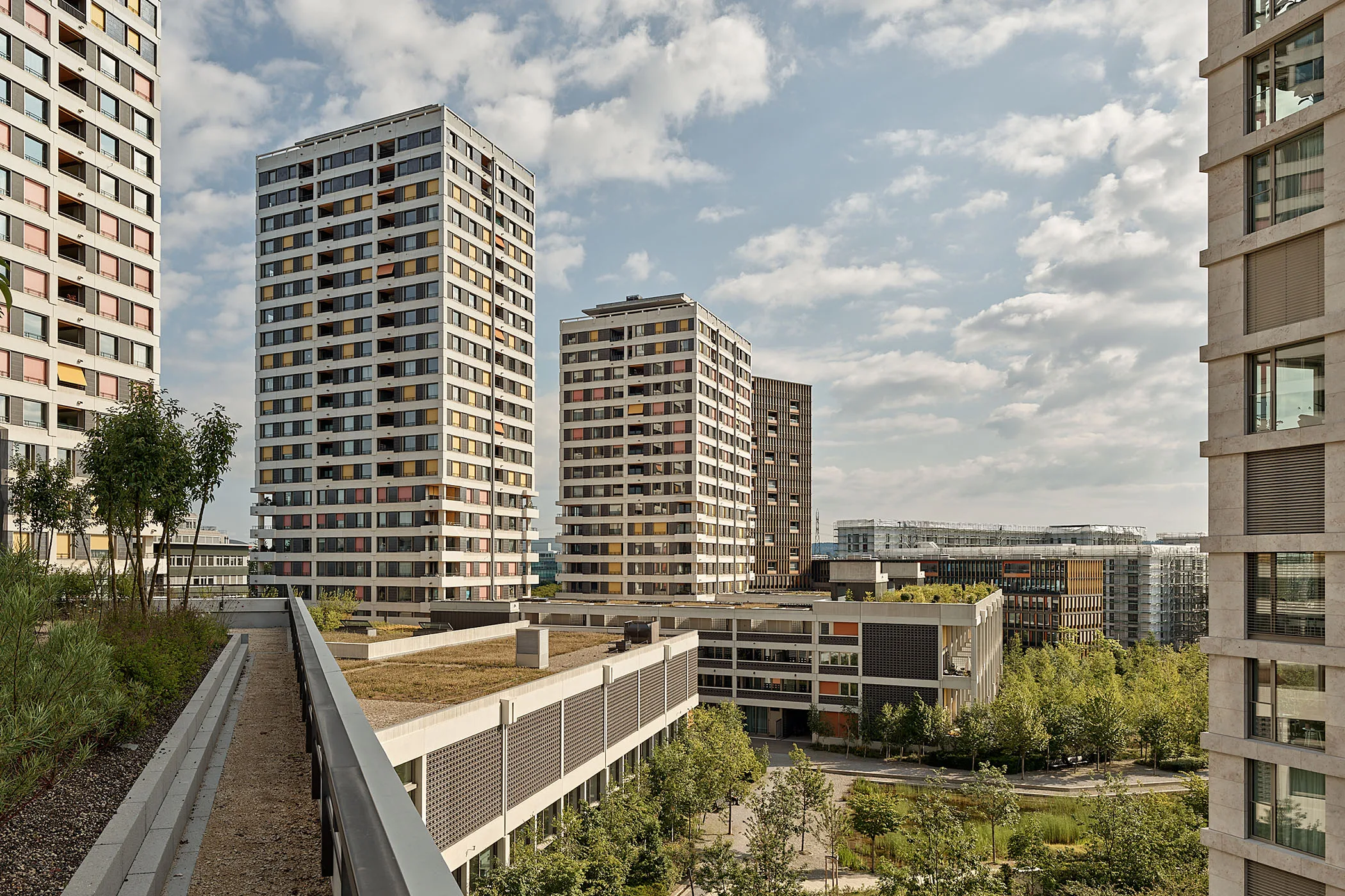 Im Dreieck Leutschenbach-/Hagenholzstrasse bildet das 2024 fertiggestellte Hochhausensemble das einladende Entrée des Stadtquartiers Leutschenbach. In der Tiefe des Areals befindet sich ein Abschnitt des Inneren Gartens, welcher sich als parzellenübergreifender Grünraum in Zukunft von der Hagenholzstrasse bis zum Fernsehstudio fortsetzen soll. Der Messeturm, ein 80 Meter hohes Bürohochhaus, bildet an der Strassenkreuzung den Auftakt. Entlang der Leutschenbachstrasse begleiten Sockelbauten und Wohnhochhäuser den öffentlichen Raum. Als Gefässe für unterschiedliche Nutzungen, von einer Armaturenfabrik über eine Boulderhalle und Wohnungen bis hin zu Restaurants tragen die Sockelbauten zur Vielfalt und Lebendigkeit des Quartiers bei. Die Verteilung der Wohnungen auf verschiedene Gebäudeteile führt zu einer Vielzahl an unterschiedlichen Wohntypologien: von reihenhausähnlichen Wohneinheiten in den Sockelbauten über grosse Familienwohnungen im unteren Teil der Hochhäuser bis hin zu Penthousewohnungen in den Dachkronen.