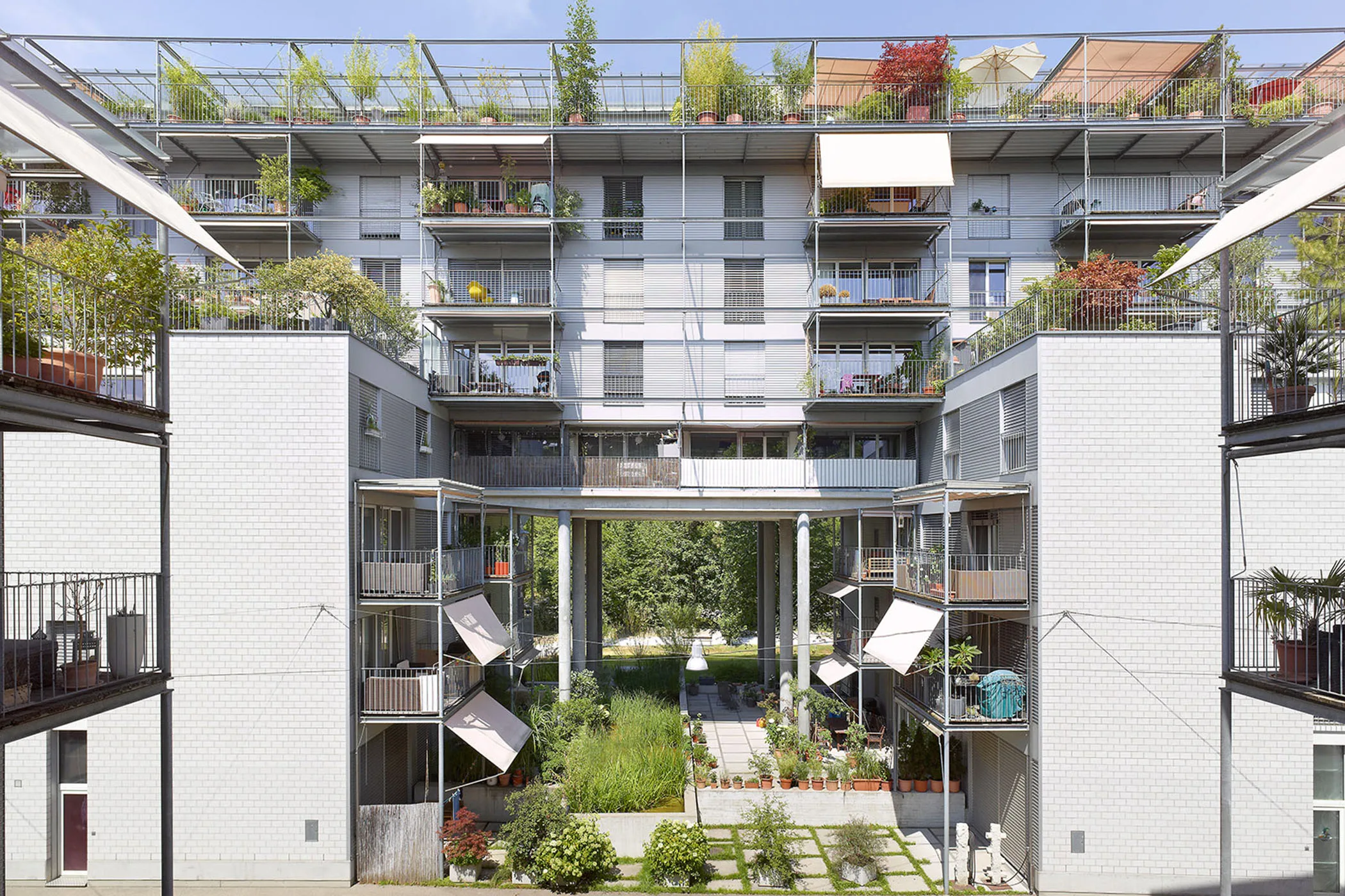 In einem geladenen Wettbewerb wurde ein Projekt ermittelt, welches der besonderen Lage des Grundstückes zwischen der lärmexponierten Hardturmstrasse und dem weit offenen Limmatraum Rechnung trägt.