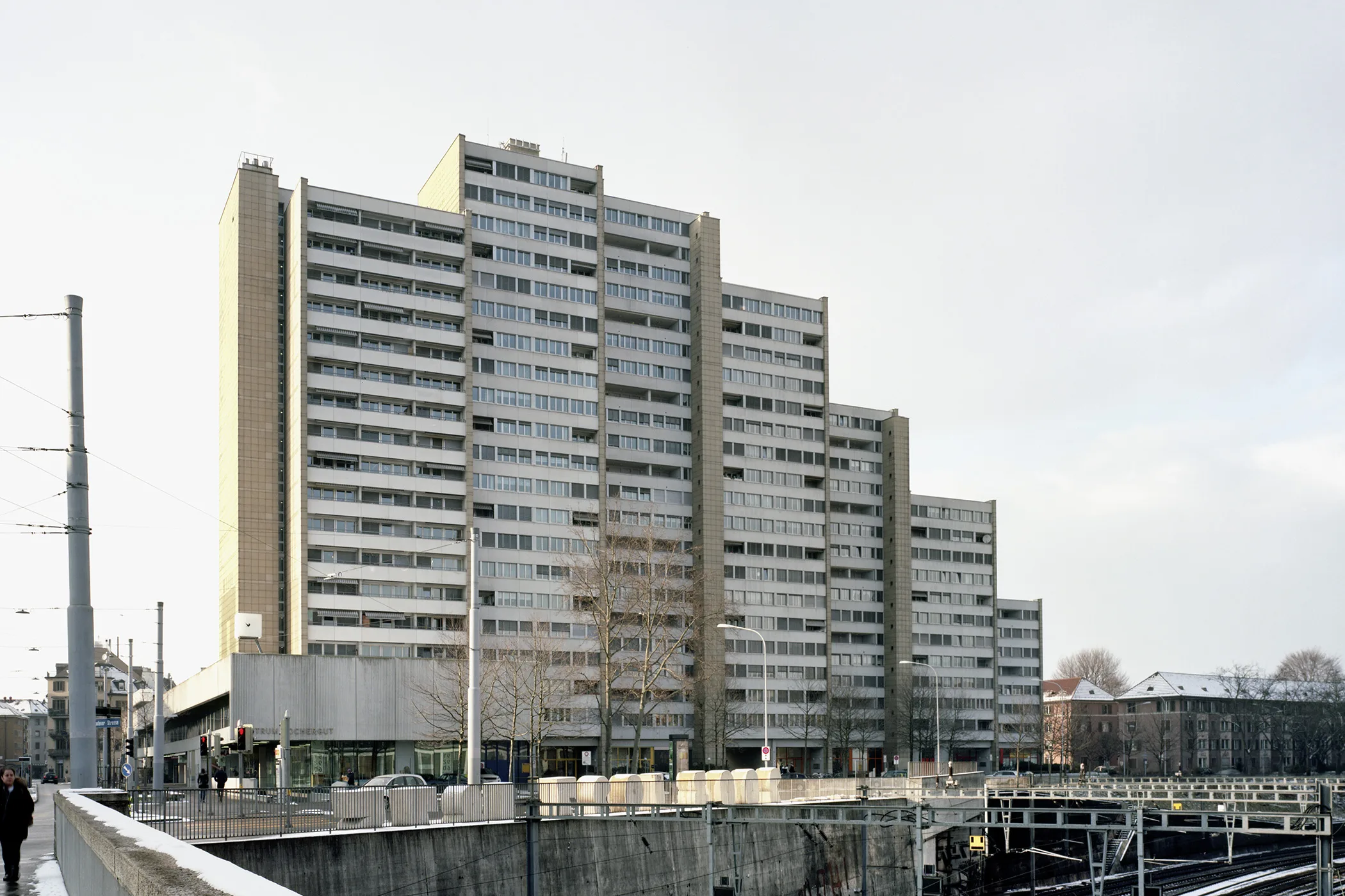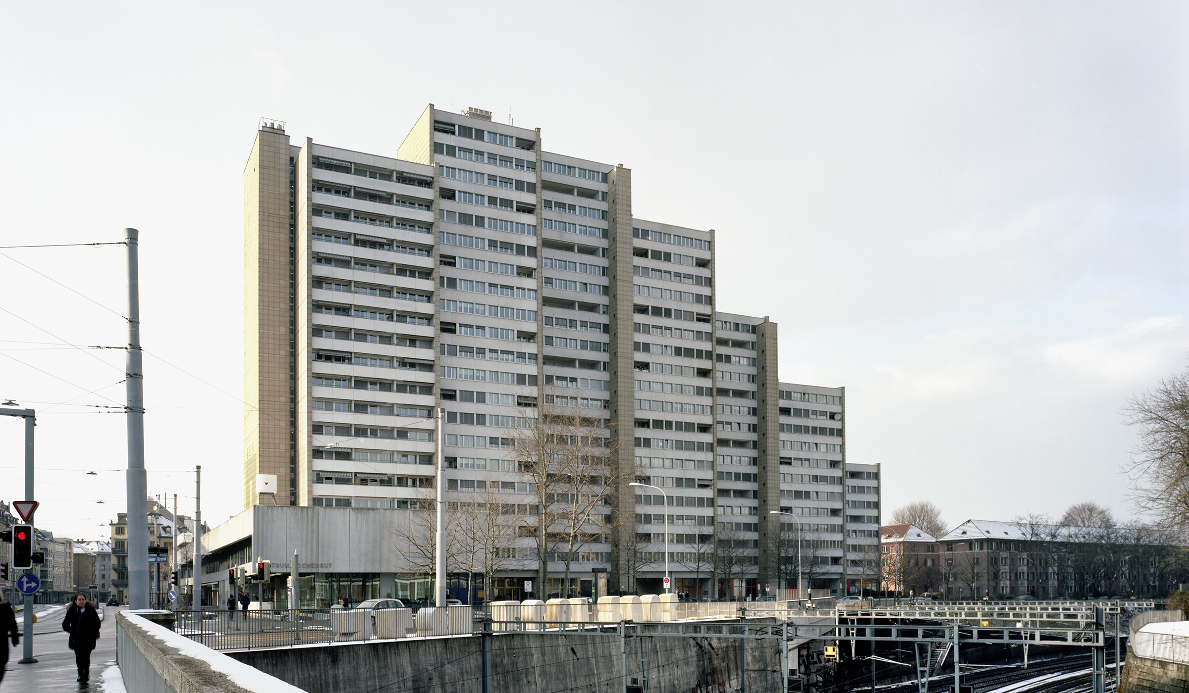 1959 gewann der Architekt Karl Flatz den offenen Wettbewerb der Stadt Zürich mit seinem Entwurf für ein 27-stöckiges Hochhaus. Gebaut wurde es von 1963 bis 1966. Die ursprünglich geplanten 27 Stockwerke wurden auf 21 reduziert. Die 346 Wohnungen sind über ein ausgeklügeltes Erschliessungssystem ineinander verschachtelt, wobei ein Laubengang auf jedem dritten Stock sechs Wohnungen erschliesst, welche sich über die Stockwerke verzahnen.