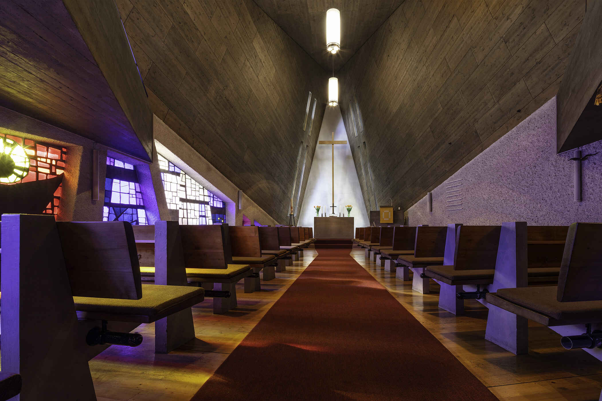 Auf 250 Quadratmeter Raum, zwischen ansteigender Kurvenstrassse und Beckenhofstrasse steht die Martin-Luther-Kirche. Ein für Zürich einzigartiger moderner Kirchenbau, der in der Nachfolge der Kirche Notre-Dame-du-Haut (1950-1954) in Ronchamp von Le Corbusier steht. Der zeltdachförmige Betonbau ist geometrisch durch die Form des Dreiecks geprägt, ein Symbol für den dreieinigen Gott. Der Innenraum wirkt durch die Reduktion auf die einfachsten geometrischen Formen Dreieck und Viereck äusserst schlicht. Die auf die Beckenhofstrasse gerichtete Wand besteht aus verputztem Beton und Fenstern mit farbigen Dickglasstücken, die Weltschöpfung, Sündenfall und Welterlösung darstellen. Die Form des Zeltes erinnert an die Pilgerschaft des menschlichen Lebens und die himmlische Heimat.