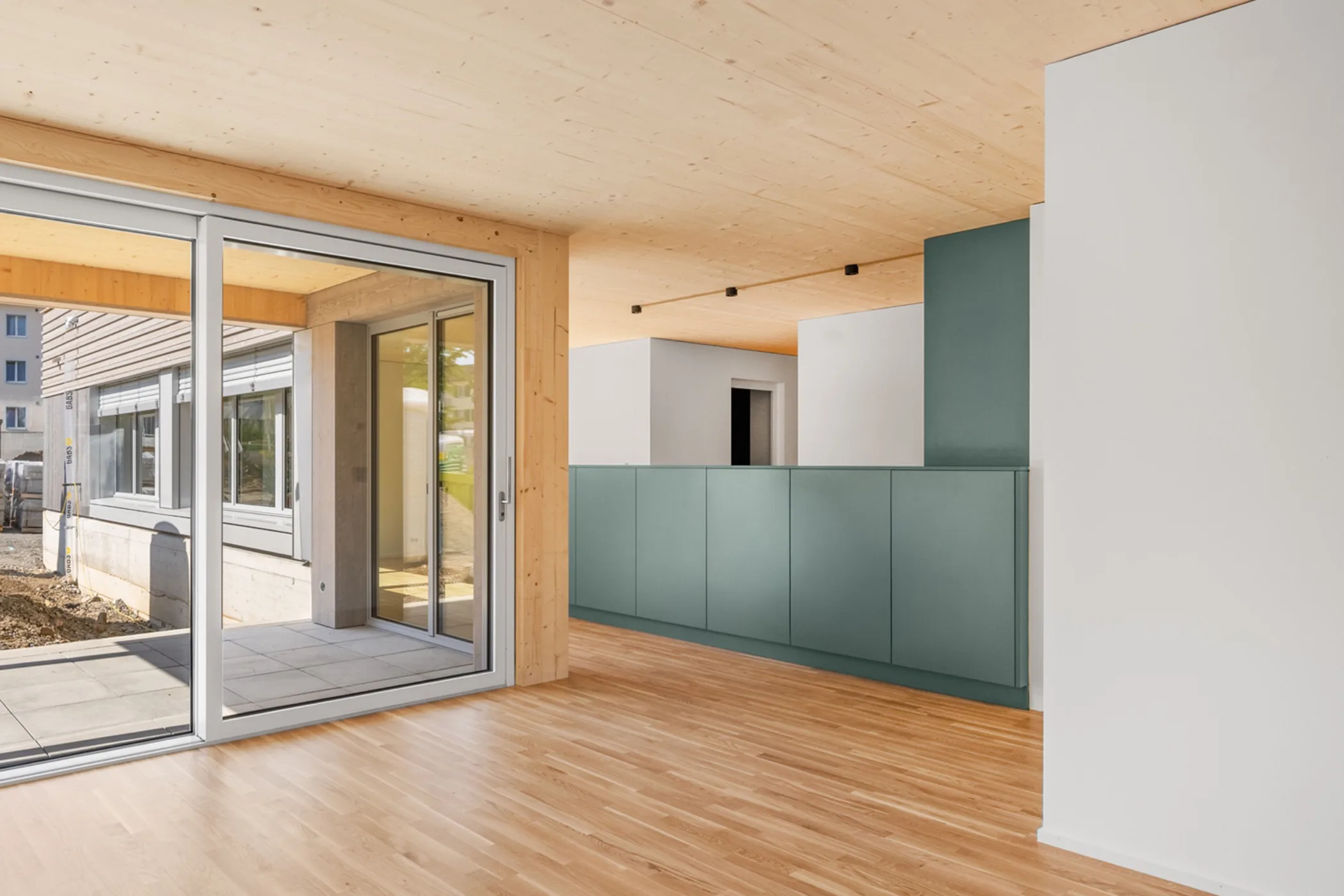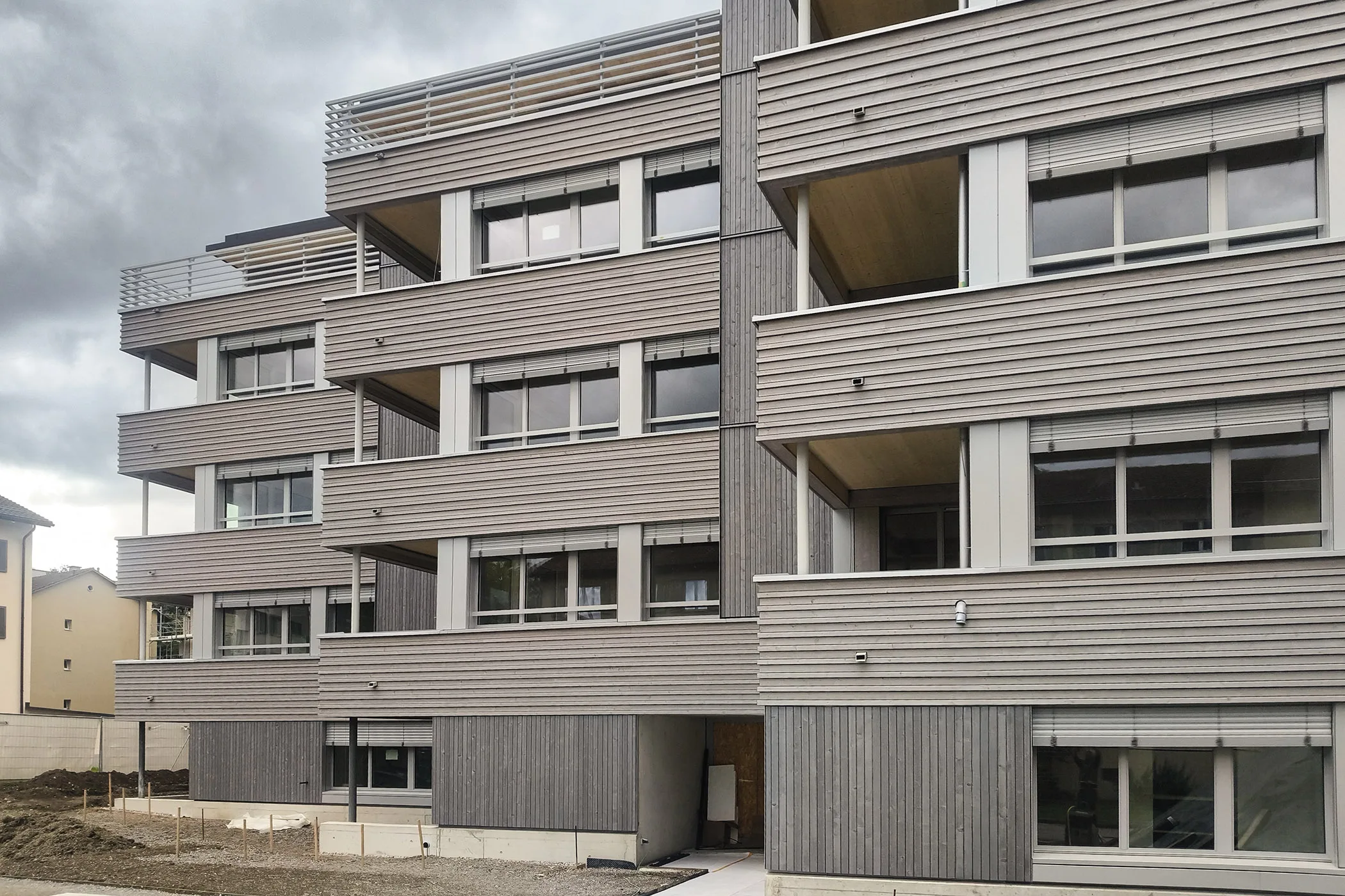 Das übertiefe 4-geschossige Gebäude wird im Bezug zur Luegislandstrasse nach Südosten gestaffelt. Dadurch werden die Zwischenräume aus der Parallelität der ursprünglichen Gartenstadt befreit, die gegenseitigen Einsichten minimiert und die Aussichten optimiert. Die Attika wird über die Staffelung mit dem Baukörper verbunden. Über eine zentrale gemeinsame Eingangshalle erschliessen zwei Treppenhäuser je 4-spännig die Wohnungen. Ein winkelförmiger Wohn-Essraum um eine grosszügige Loggia mit einer zentralen offenen Küche als Herzstück bildet das Grundmodul jeder Wohnung. Dank der Staffelung erhält jede Wohnung eine Übereck-Ausrichtung der Loggia und eine zweifache Orientierung. Durch den Verzicht auf eine Tiefgarage (Verkleinerung Unterterrainvolumen und weniger induzierte Mobilität), der hohen Kompaktheit und Flächeneffizienz und der Holzbauweise wird eine hohe Ressourcenschonung gewährleistet.