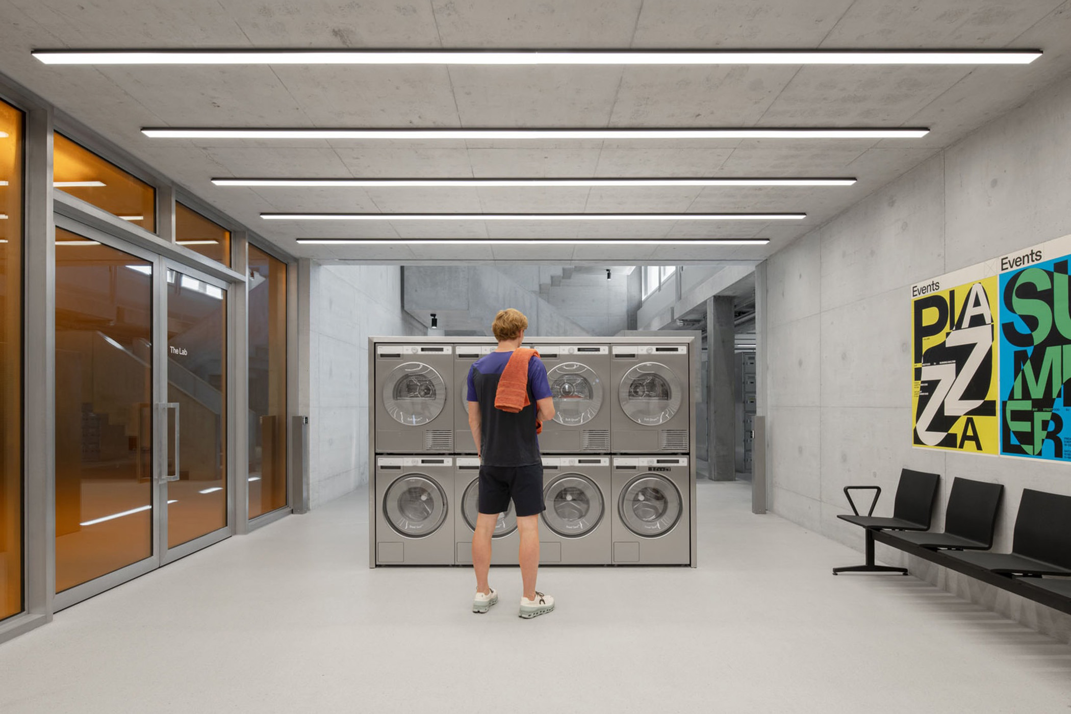 Der Empfang mit integriertem Café und Shop befindet sich im Erdgeschoss. Ein grosszügiger doppelgeschossiger Konferenz- und Co-Working-Bereich im ersten Obergeschoss steht auch externen Gästen zur Verfügung und vernetzt das Gebäude mit dem umliegenden Quartier.