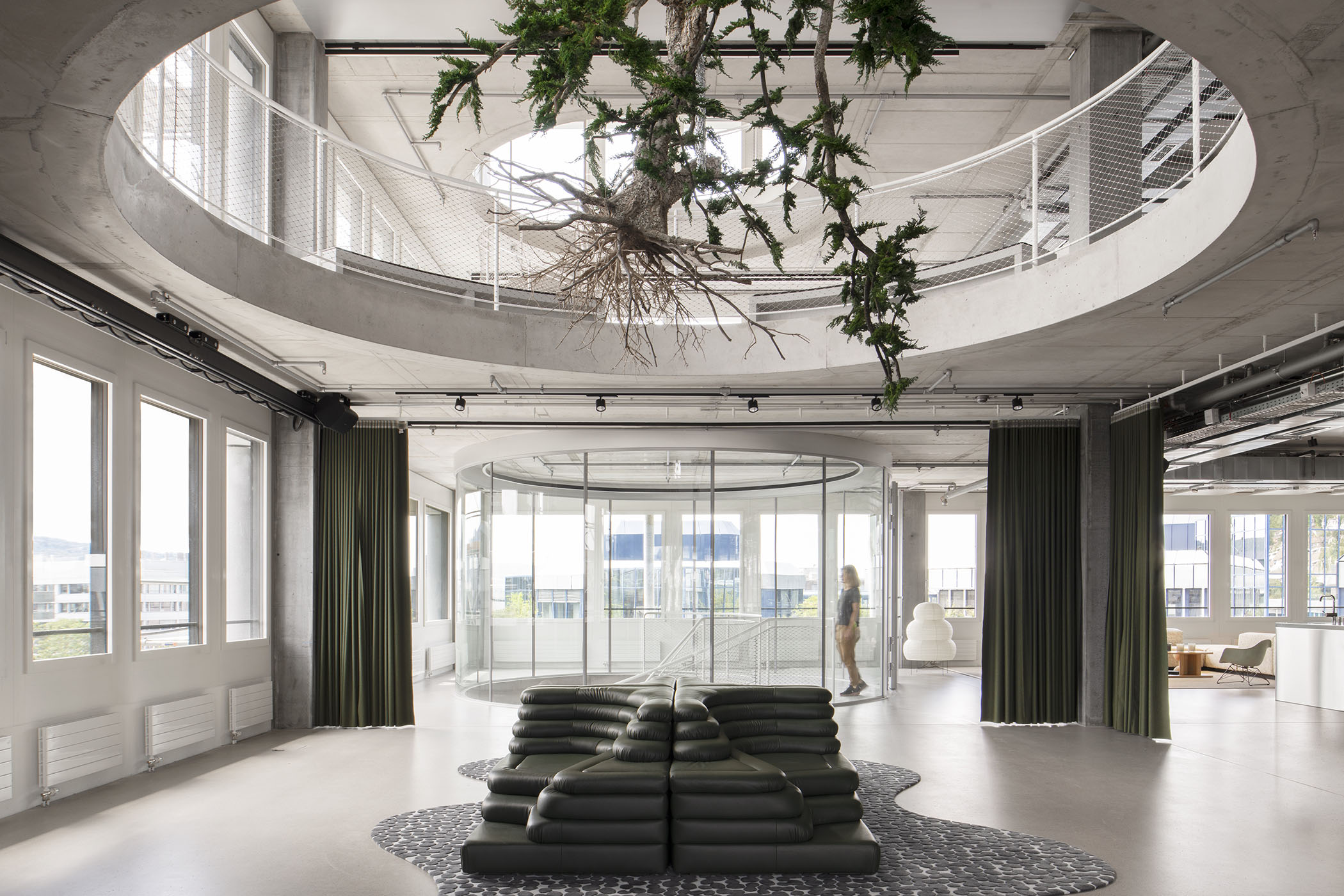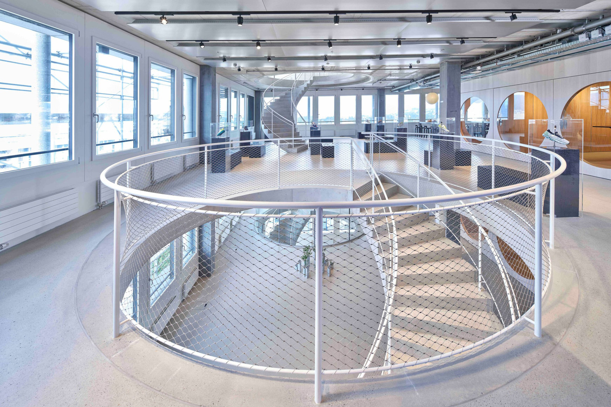 Während die Treppen im Brückenbau geradläufig sind, wechseln sie ihre Form im Turmbereich und werden zu Wendeltreppen, die sich über die Geschosse verjüngen. Die im offenen Grundriss im Gebäudeinneren konzentrierten Sitzungsräume sind um einen Kern angeordnet und von einer perforierten Holzhaut umspannt. Diese öffnet sich über grosse Pivot-Türen, sodass sich die Arbeitsplatz- und Sitzungsbereiche miteinander verzahnen.