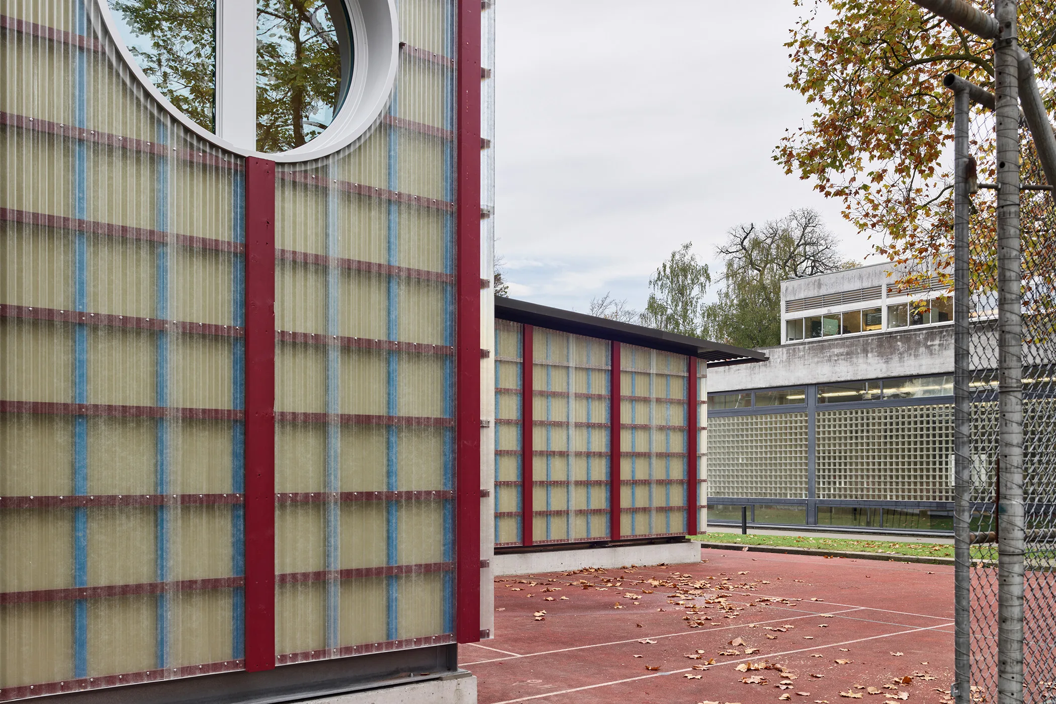 Als wiederkehrendes Volumen zeichnen sich die Gebäude durch eine von aussen sichtbare Rahmenstruktur mit hoch liegenden Fenstern aus. Die vertikale Struktur der Holzkonstruktion prägt die primäre Erscheinung der Fassaden. Um den Charakter des Provisoriums zu transportieren, sind für die Fassadenbekleidung transparente Fiberglas-Wellplatten vorgesehen, welche sichtbar vor eine farbig gestrichene Dämmung befestigt werden und durch die Überlagerung einen Eindruck von Tiefe und Leichtigkeit vermitteln.