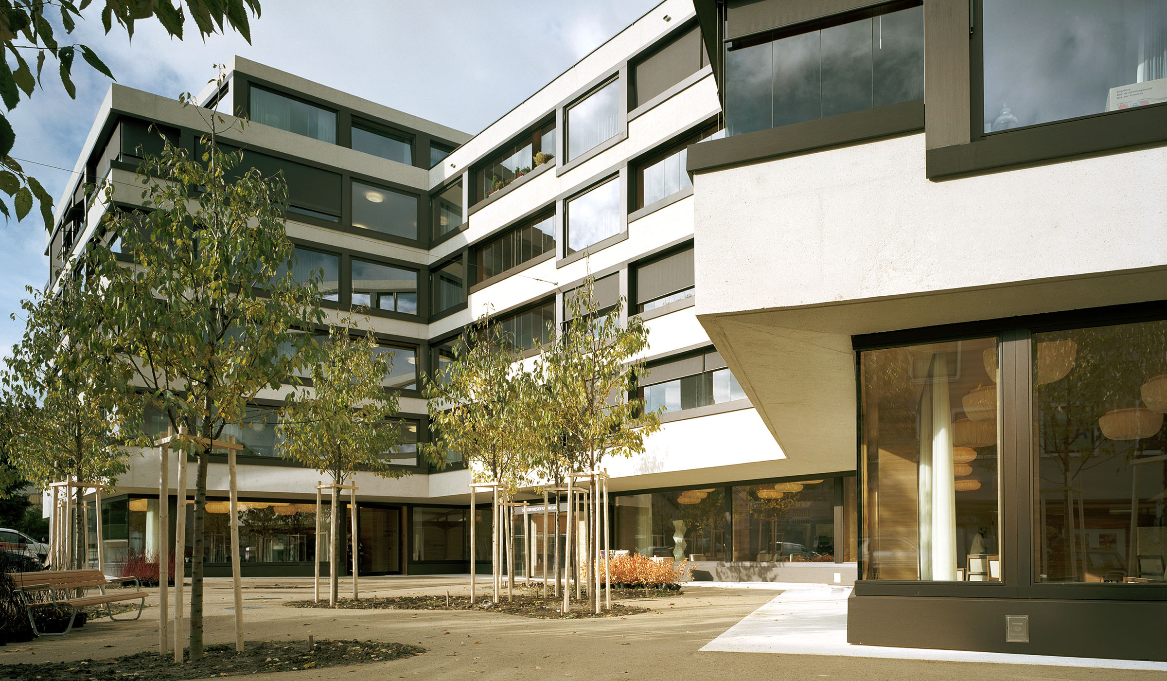 Über den zur Spirgartenstrasse gelegenen und mit Zierkirschbäumen bepflanzten Hof, der im Sommerhalbjahr das öffentliche Gartenrestaurant beherbergt, betritt man das zeitlose Gebäude, welches sich harmonisch in die Umgebung Altstettens einfügt. Die Eingangshalle ist das räumliche Zentrum der Residenz. Die stadtabgewandte Seite mit dem Garten für die Bewohner wird von einer lauschigen Pergola umgeben.