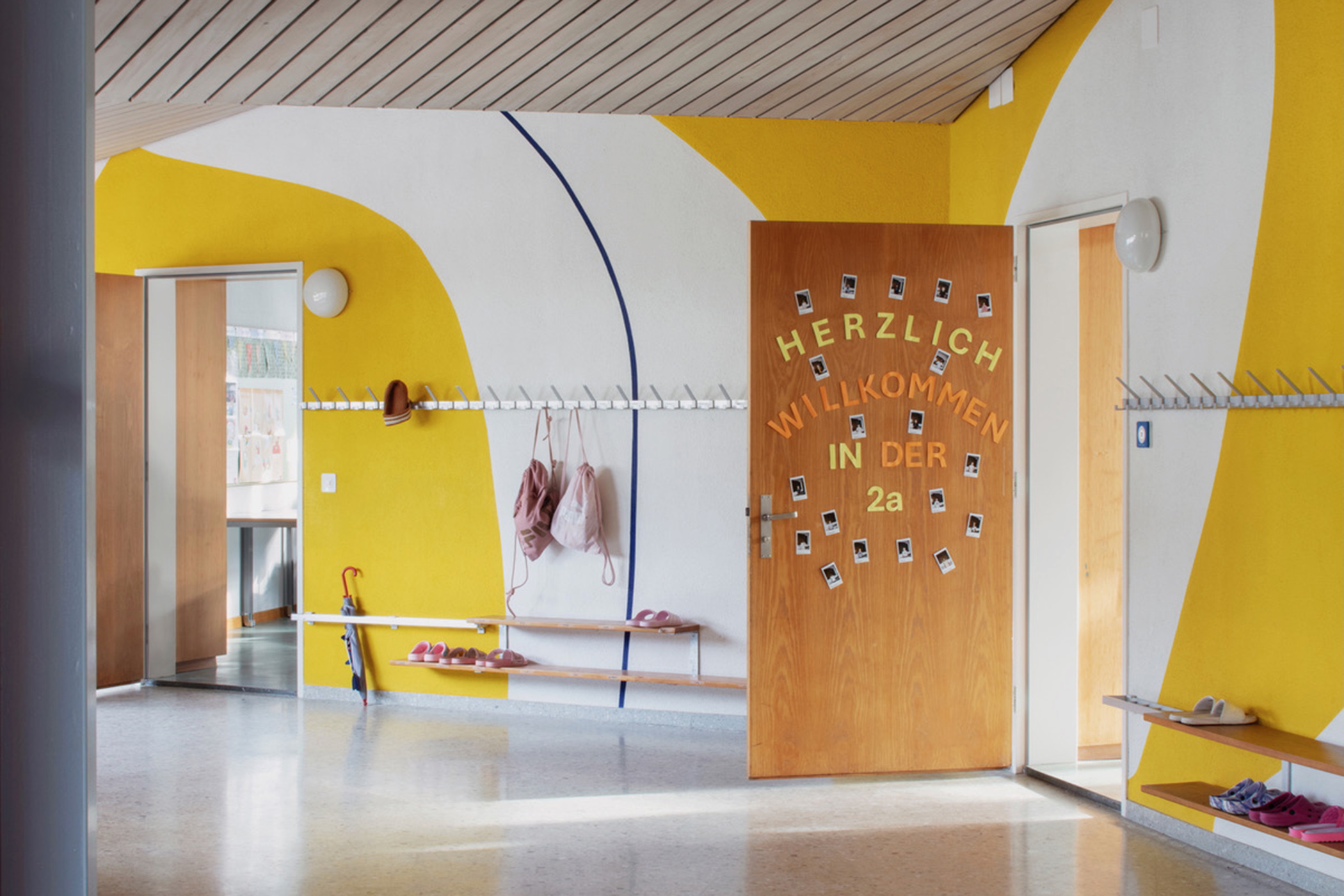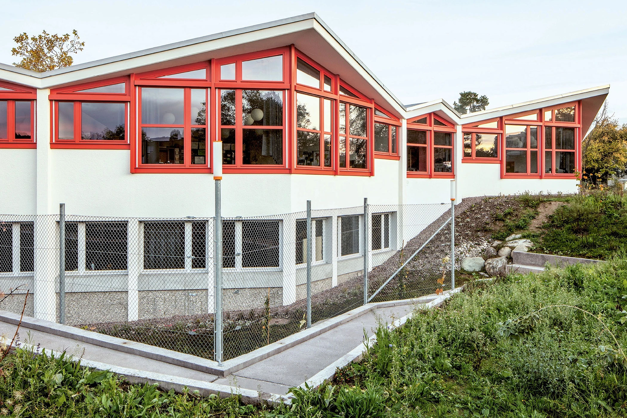 Das von Gertrud Frisch von Meyenburg entworfene Schulhaus Auzelg mit Gartenanlage steht unter Denkmalschutz. Umbau und Erweiterung setzen bei der Neugestaltung des Aussenraums an und lassen den Baubestand maximal unangetastet. Ein neu geschaffenes beranktes Erdbauwerk setzt Faltdach und bewegte Fassade in eine neue Beziehung zum Boden, gewährleistet eine gute Belichtung vom Untergeschoss, bietet über einen kleinen Anbau einen neuen hindernisfreien Zugang an und schafft einen zum Spiel einladenden durchgängigen Schulgarten. Eine Wildhecke, mit Beerenstauden ergänzt, säumt den neuen Spielgarten zusammen mit dem mediterranen Stauden- und Kräuterband entlang dem Schulhaus.