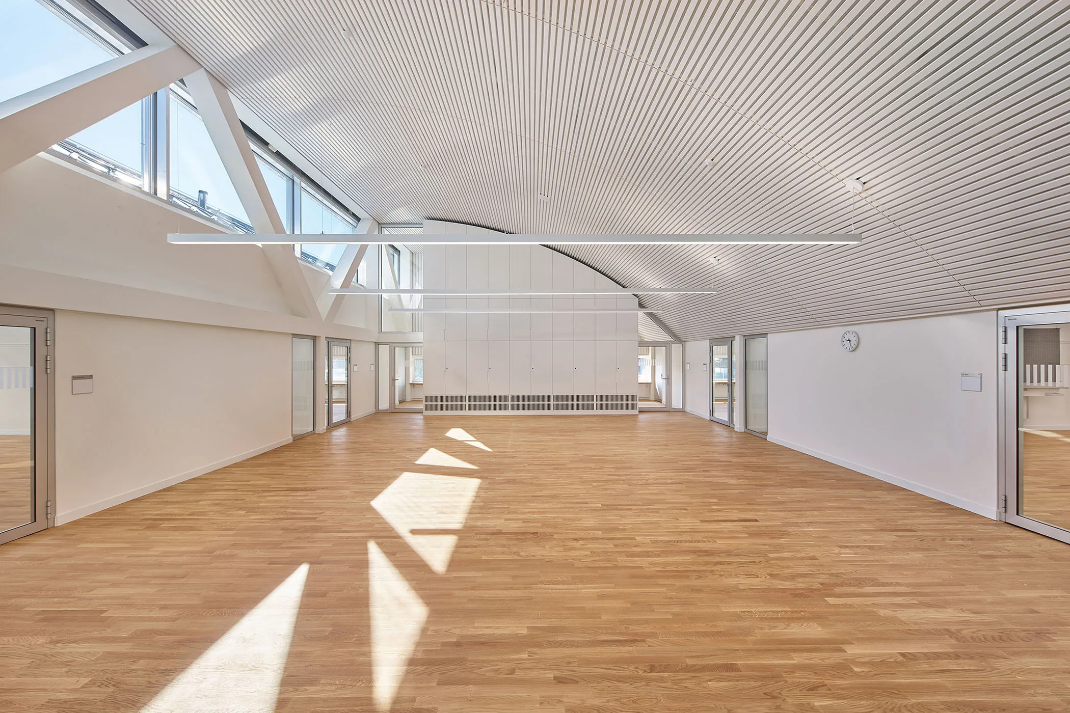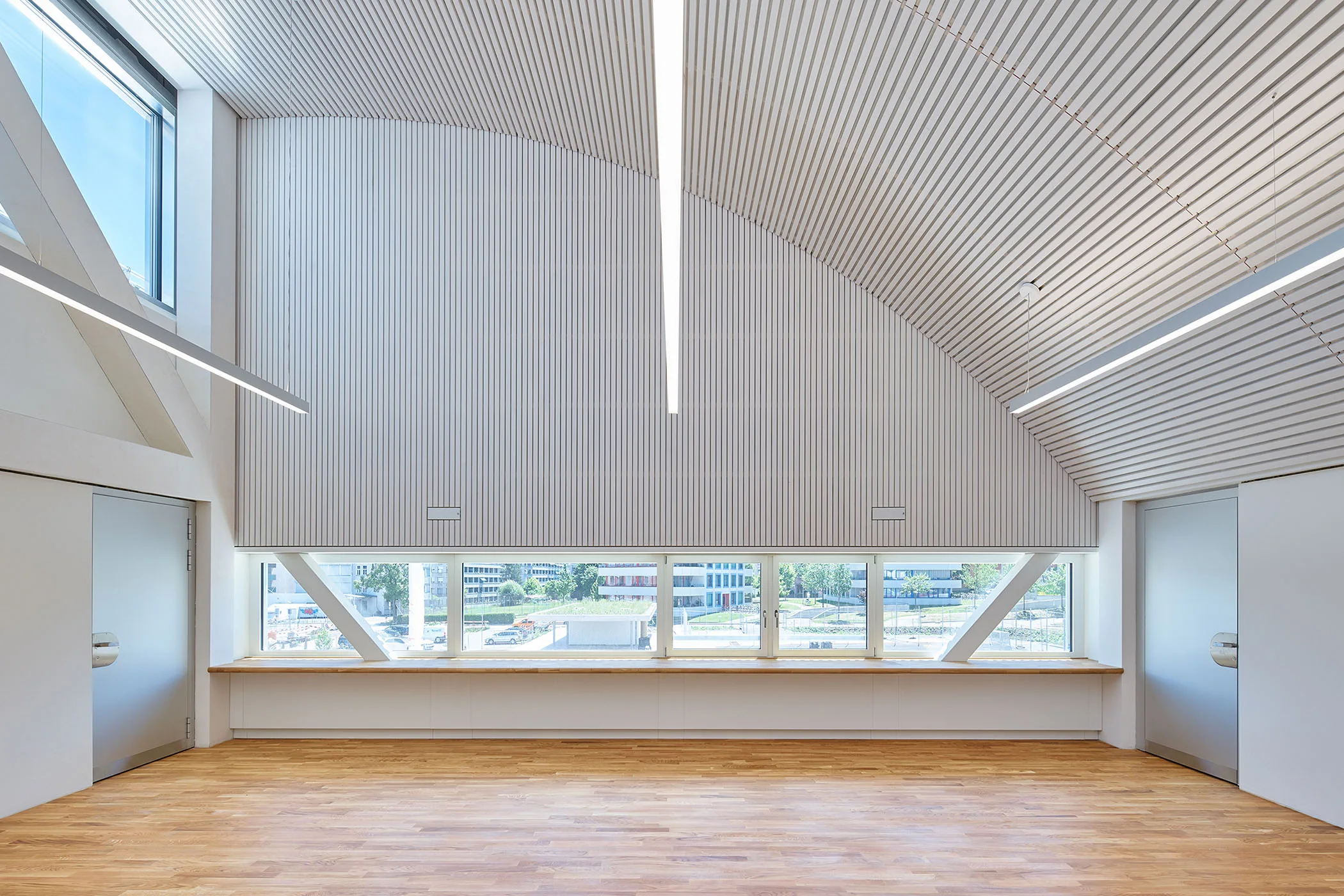Der kompakte Schulhausneubau bietet auf zwei Stockwerken Platz für 18 Klassen der Primar- und der heilpädagogischen Schule im Tagesschulbetrieb. Neben Schwimmhalle, Mehrzwecksaal und Bibliothek gibt es Räume für Sport, Musik, Werken, Therapie, Lehrkräfte und Betreuung, die z. T. mehrfach genutzt werden: Aufenthaltsräume für den Unterricht in Kleingruppen und der Mehrzweck- als Speisesaal usw. Die Unterrichtsräume sind im Obergeschoss und – dank des markanten Sheddachs – mit viel Tageslicht versorgt. Die Sporthalle, Schwimmanlage und Mehrzwecksaal stehen ausserhalb des Unterrichts der Bevölkerung zur Verfügung. Der Aussenbereich verbindet die bestehenden Grünräume zwischen dem Pflegezentrum Bachwiesen und der Wohnsiedlung Freilager zu einem parkähnlichen Grünraumkorridor. Darin eingebettet wirkt das sehr offene Schulhaus identitätsstiftend als Begegnungs- und Erholungsort im Quartier.