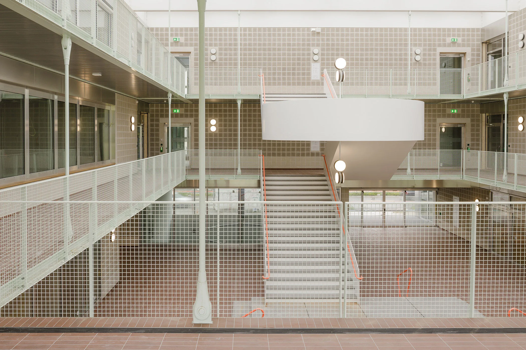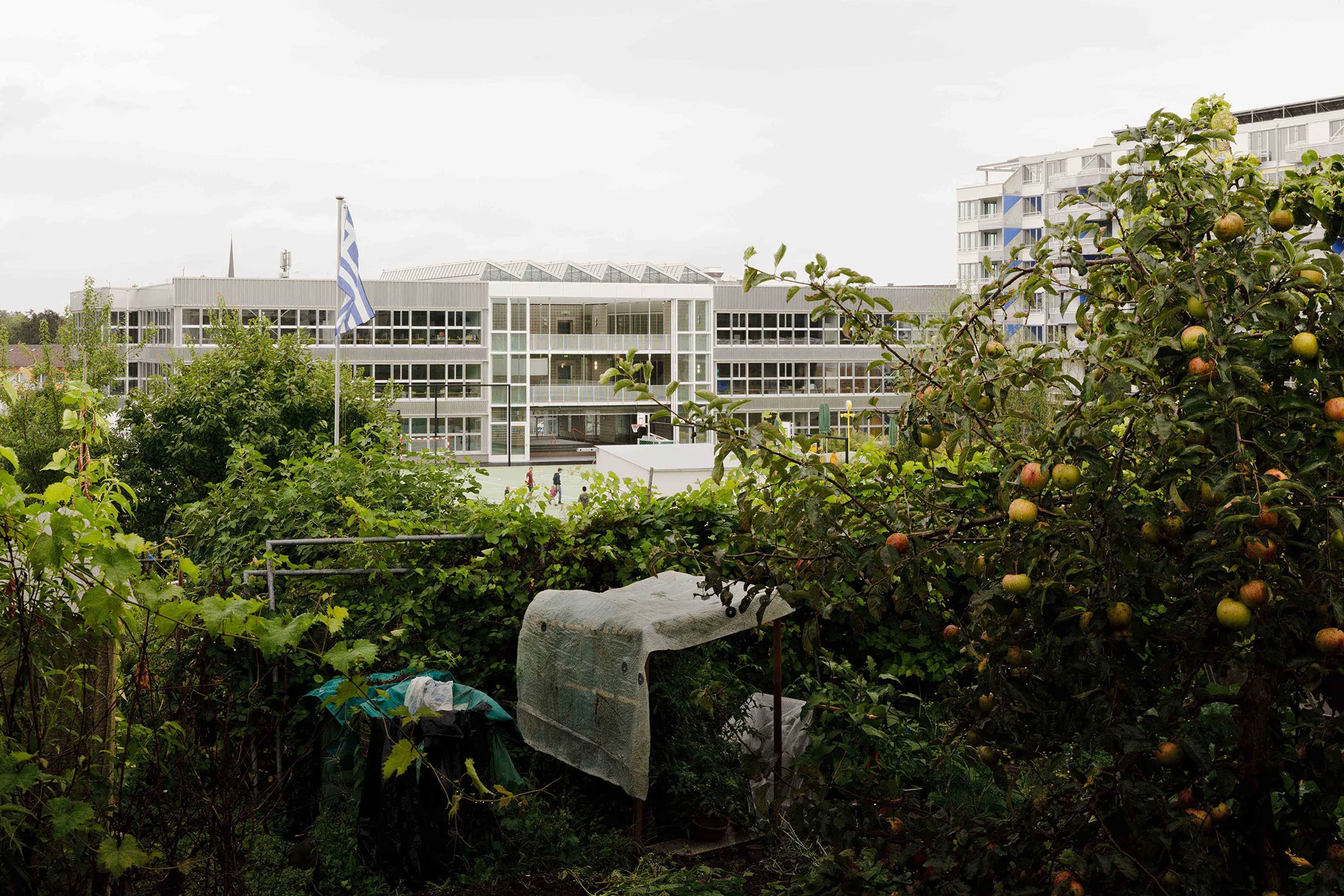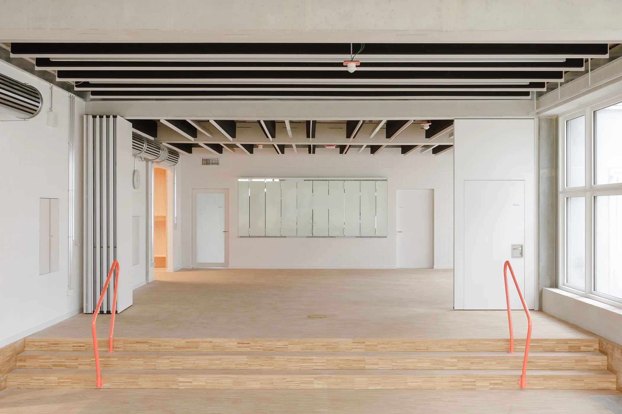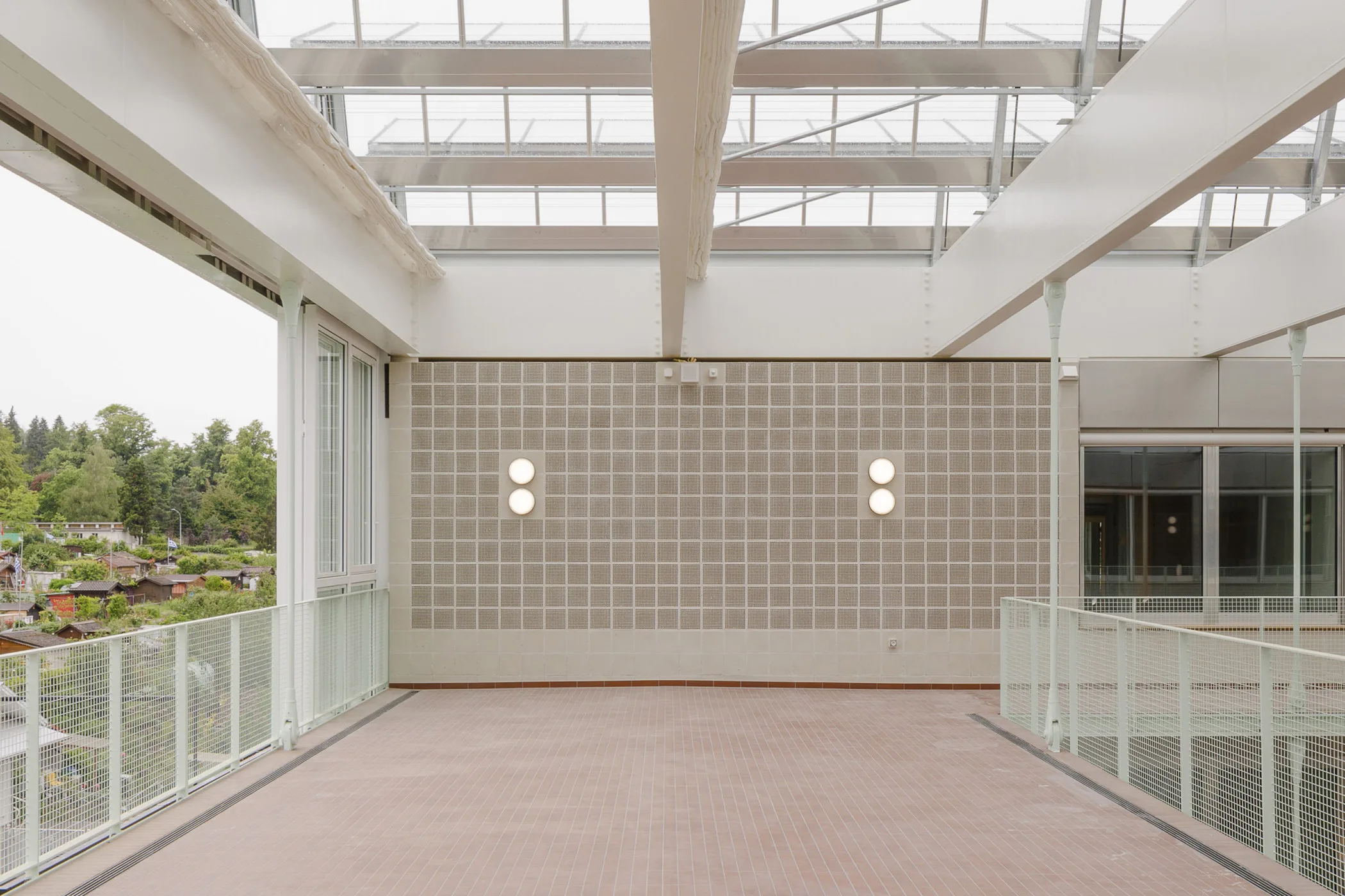 Zentrales Element und Herzstück der Schulanlage Guggach ist das als unbeheizte Zwischenzone ausgebildete Atrium. Mit seinen fassadenhohen Schiebetoren, die im Sommer offen und im Winter geschlossen sind, passt es sich den klimatischen Bedingungen der Jahreszeiten an. Die Nutzenden können Dank der Tore, die ausschliesslich per Hand bewegt werden, das Raumklima selbstständig beeinflussen und den Bedürfnissen entsprechend einstellen.