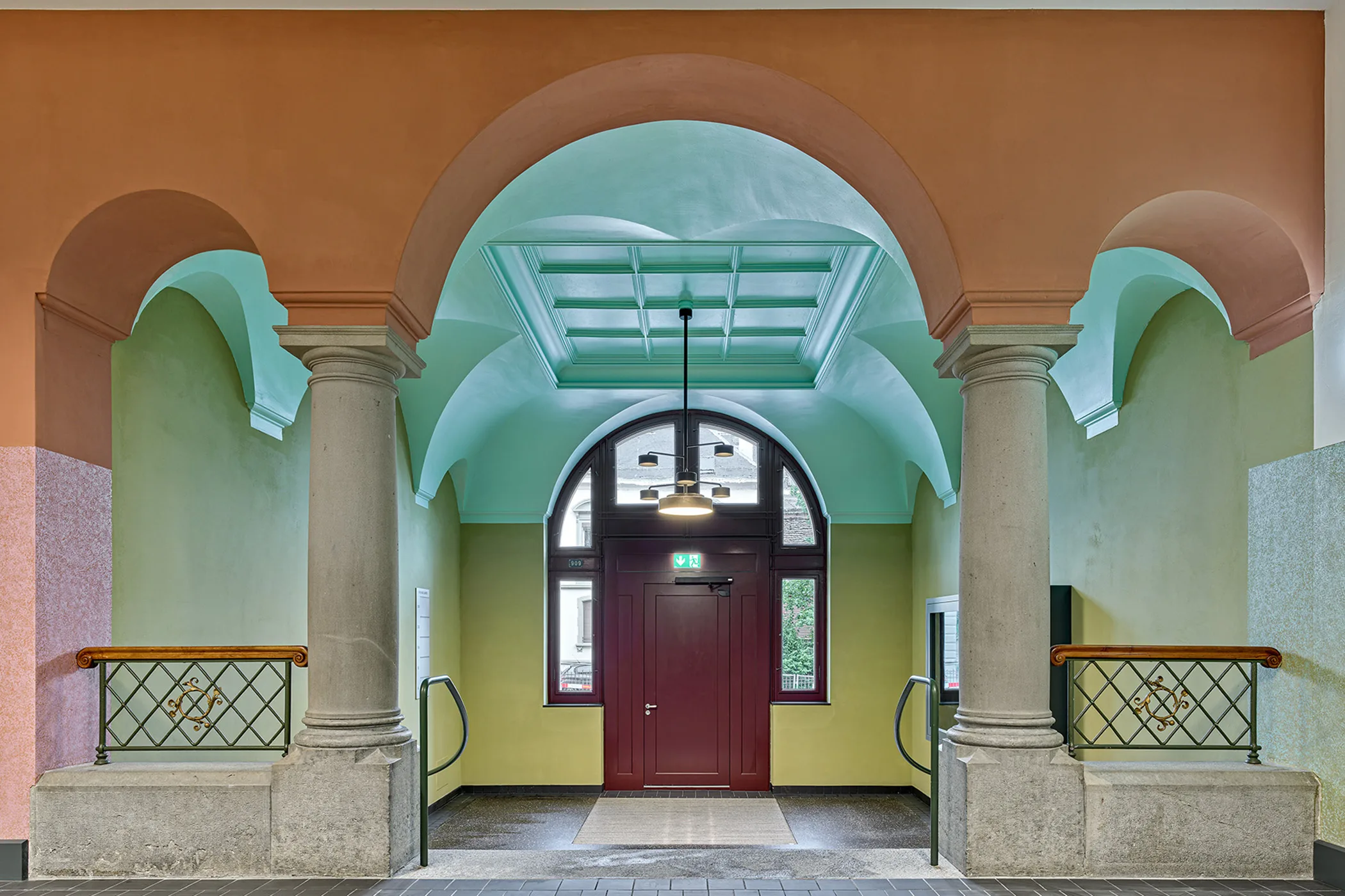 Das Verpflegungsangebot wurde durch die Umnutzung und Erweiterung der bestehenden Turnhalle vergrössert. Für den Sportunterricht entstand eine neue unterirdische Doppelsporthalle. Die historische Sandsteinfassade und die originalen Fenster wurden zusammen mit dem Dach instandgesetzt. Zentral sind die energetischen Massnahmen um eine Energieversorgung mit 100 Prozent erneuerbaren Energien zu erreichen. Die neuen Pausendächer im Zentrum des historischen Kontexts sind das identitätsstiftende, quartierübergreifend spürbare Wahrzeichen der neuen Intervention.