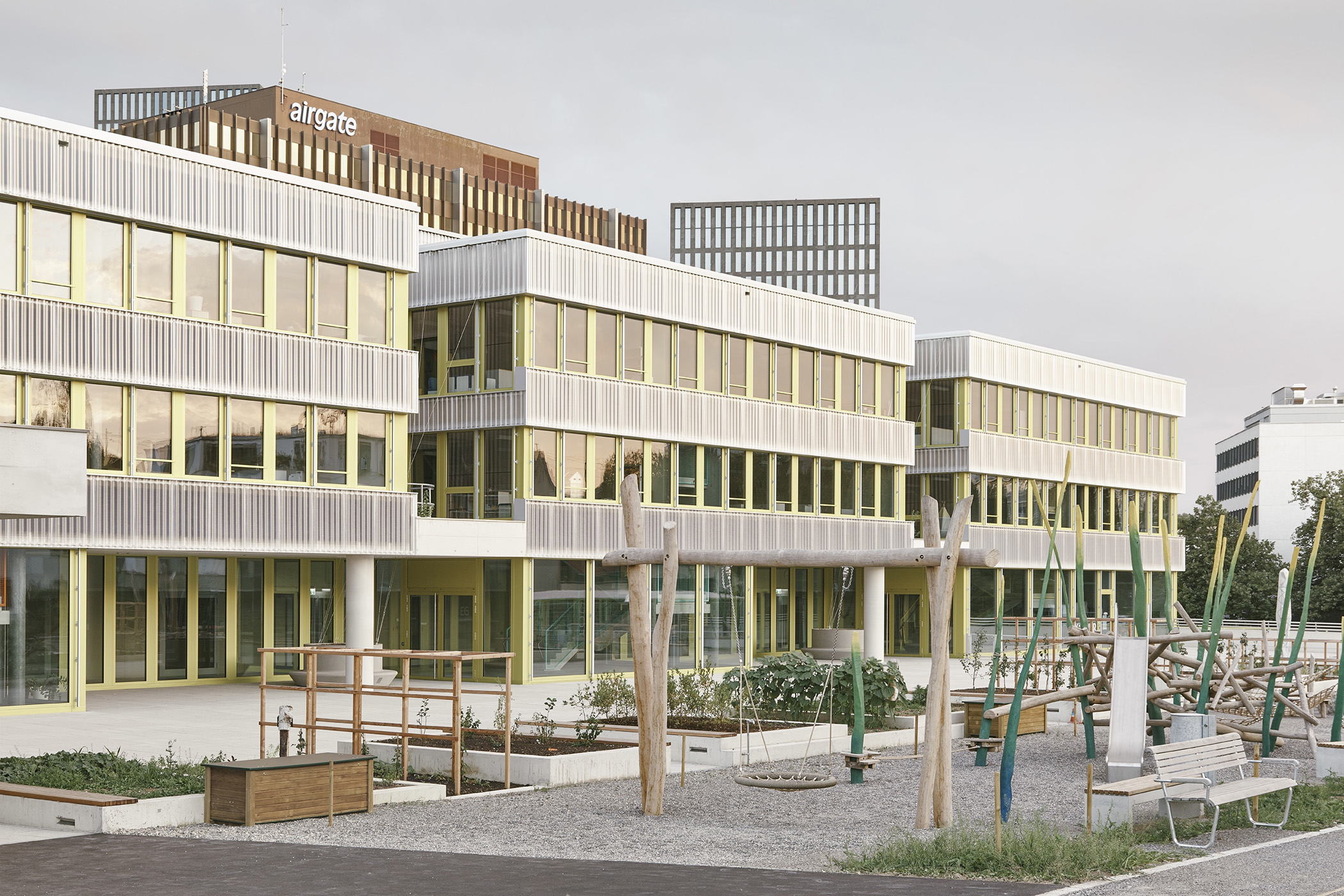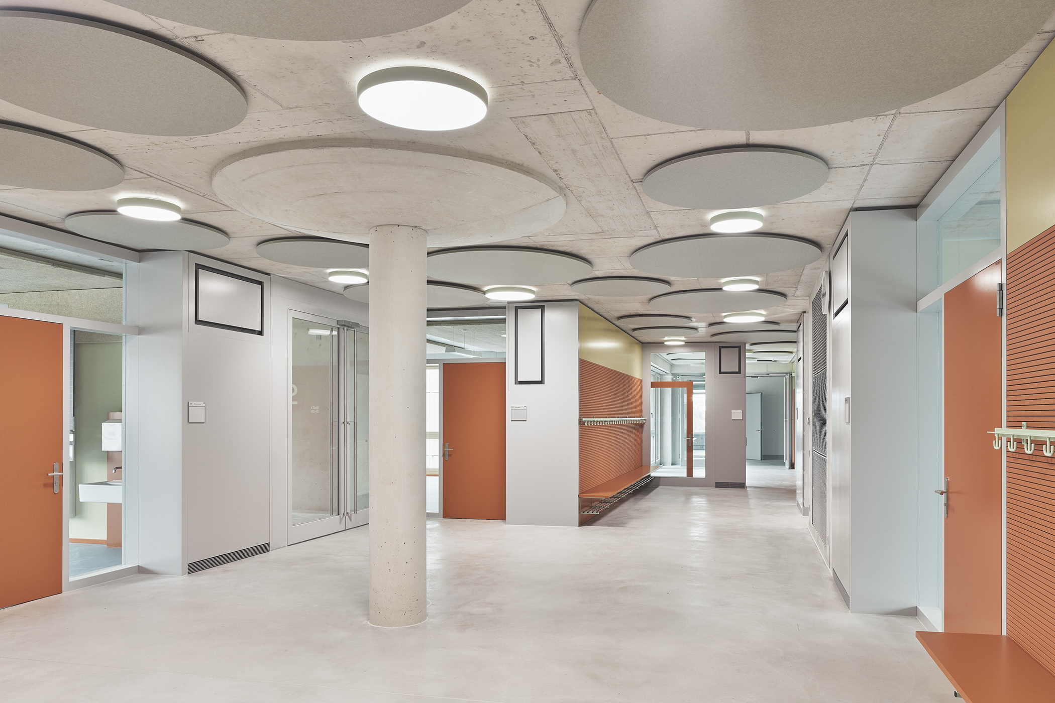 Das Schulhaus für rund 440 Kinder enthält 18 Klassenzimmer, einen Doppelkindergarten, eine Doppelsporthalle sowie verschiedene Betreuungs- und Spezialräume. Jeweils drei Klassen sind als Cluster organisiert und funktionieren als räumlich abgeschlossene Einheit.