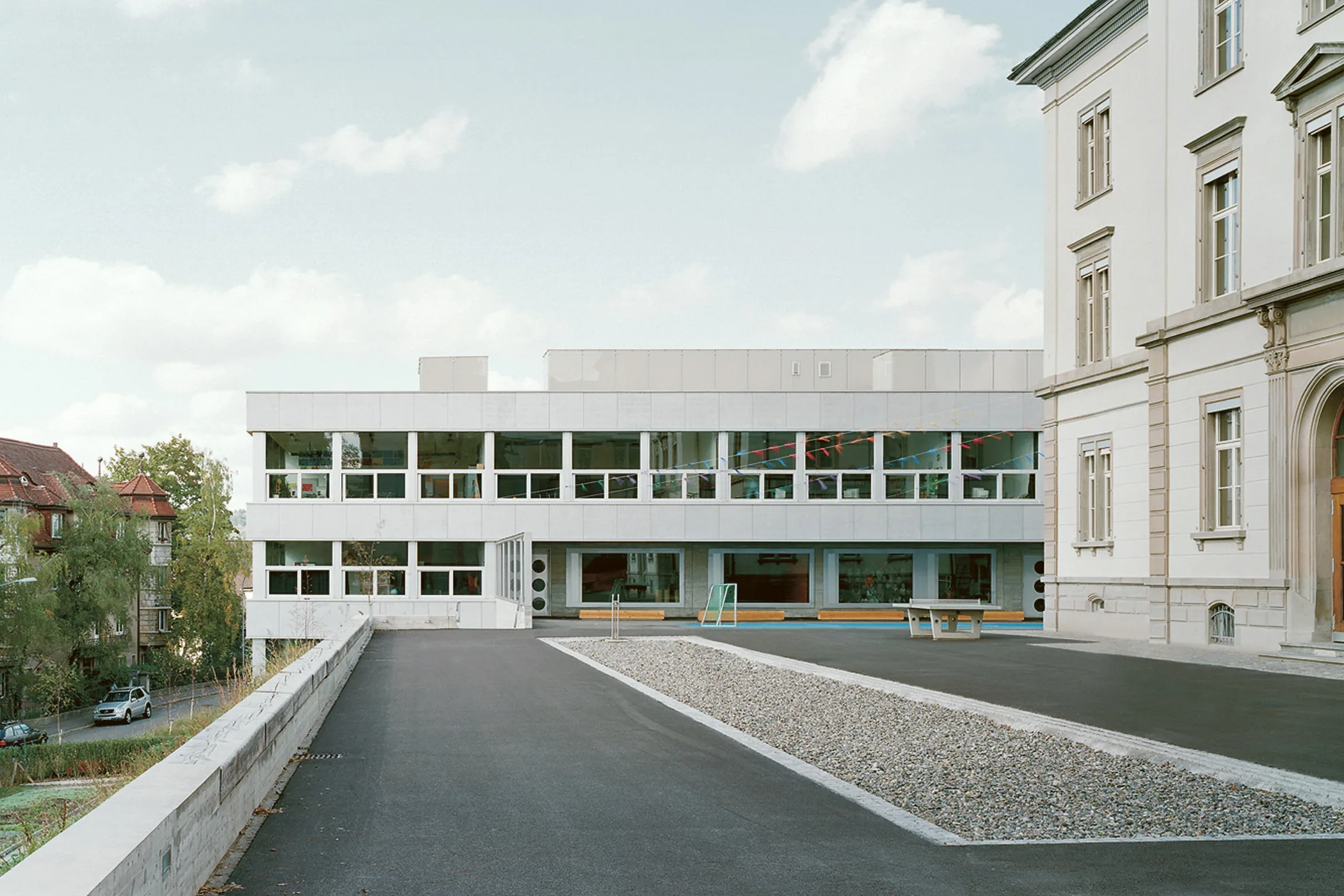 Der zurückhaltende Umbau und die Erweiterung des 1865 erbauten Schulhauses Scherr und der angrenzenden Turnhalle aus den 1970er Jahren hält einige Überraschungen bereit.