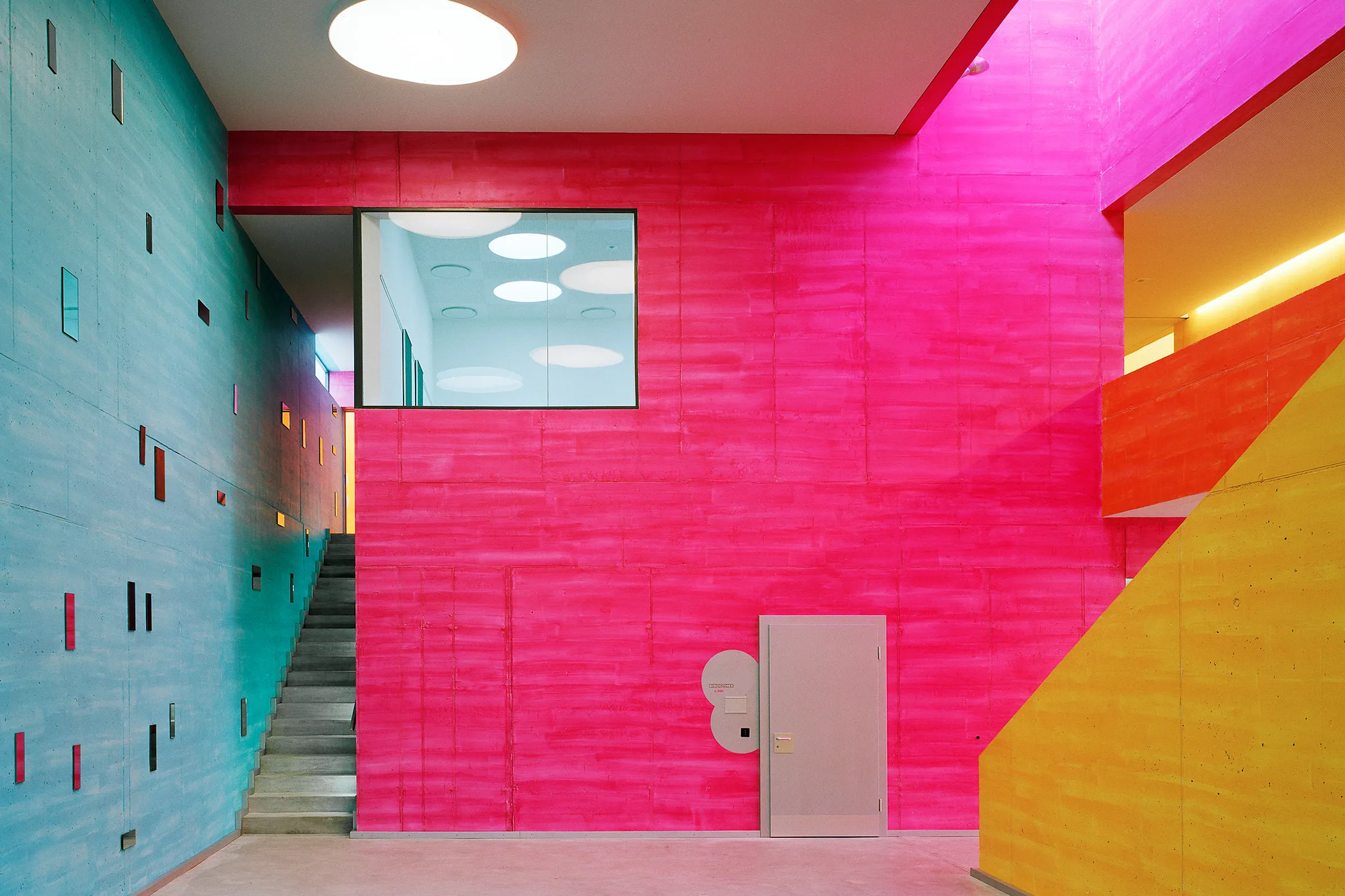 Im Innern werden alle Register einer Farb- und Lichtregie gezogen. Farbe ist hier mehr als nur Anstrich, sie wird zu einem Bestandteil des Raumes, taucht ihn in unterschiedliche Atmosphären und entfaltet im Wechsel von künstlicher und natürlicher Beleuchtung eine Strahlkraft, wie man sie bisher nur aus südlichen Gefilden, etwa aus dem Werk Luis Barragáns in Mexiko City kennt: Eine rosarote Wand trifft auf eine orange, diese wird in der nächsten Ecke mit himmelblauen oder zitronengelben Flächen kombiniert.