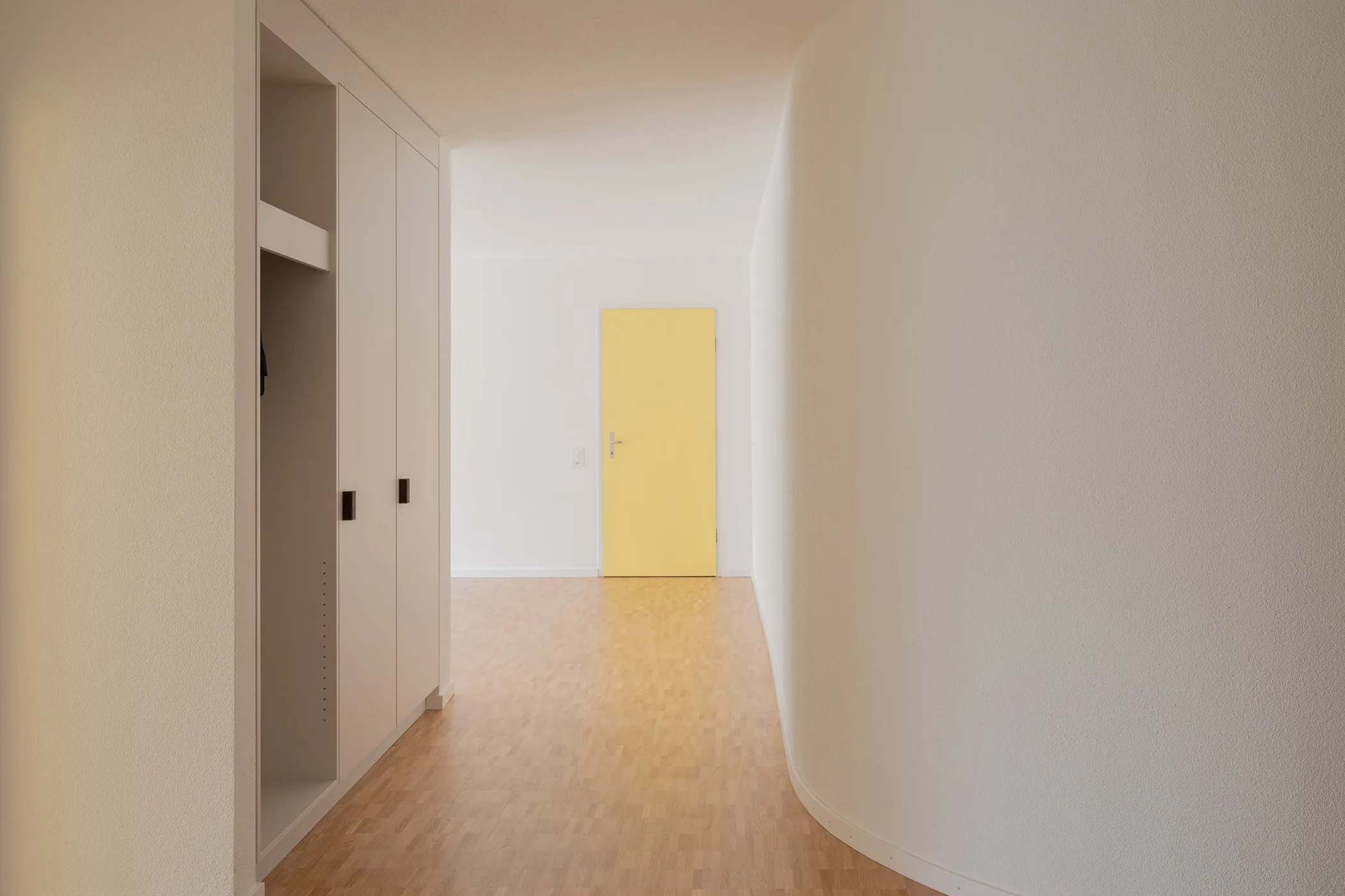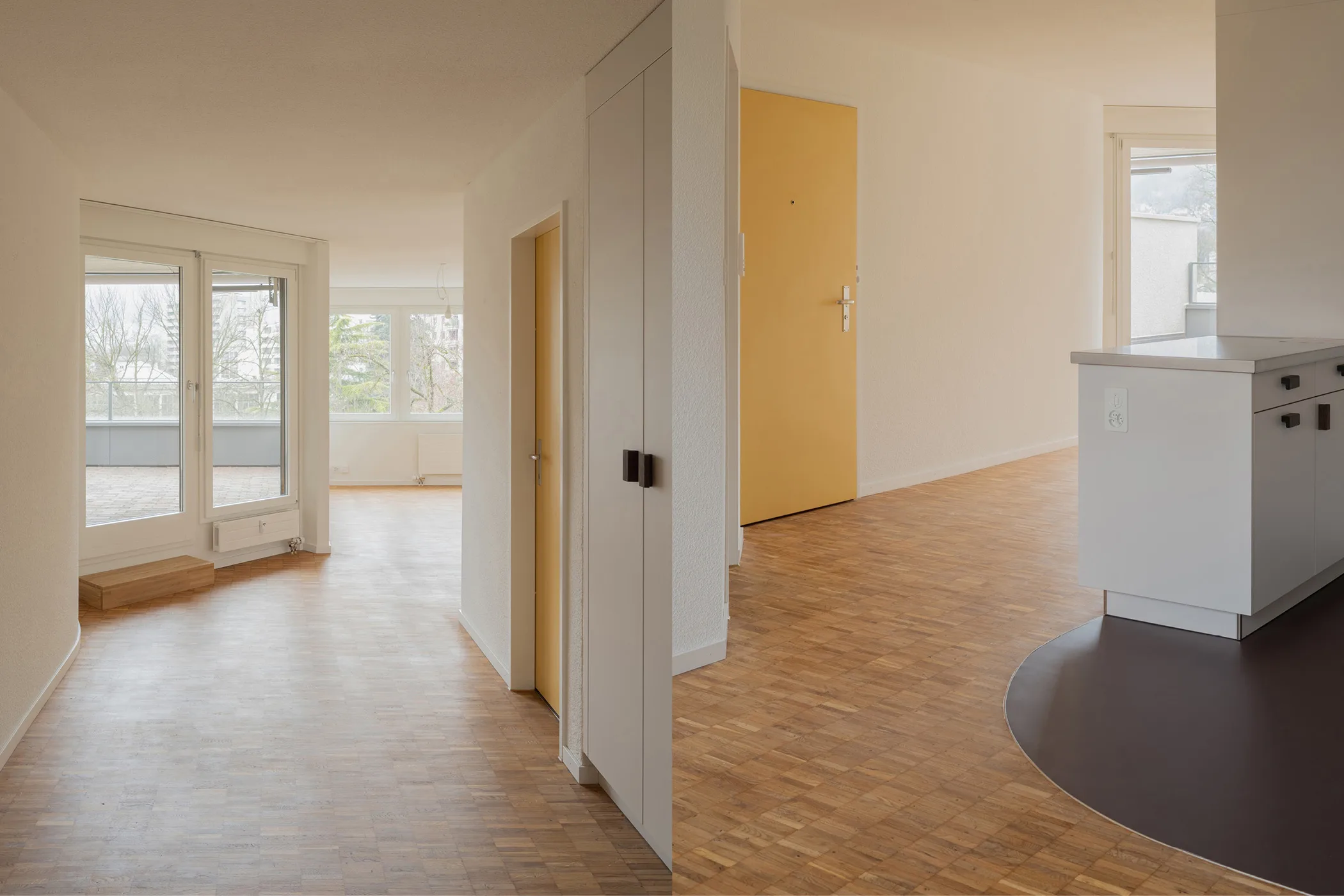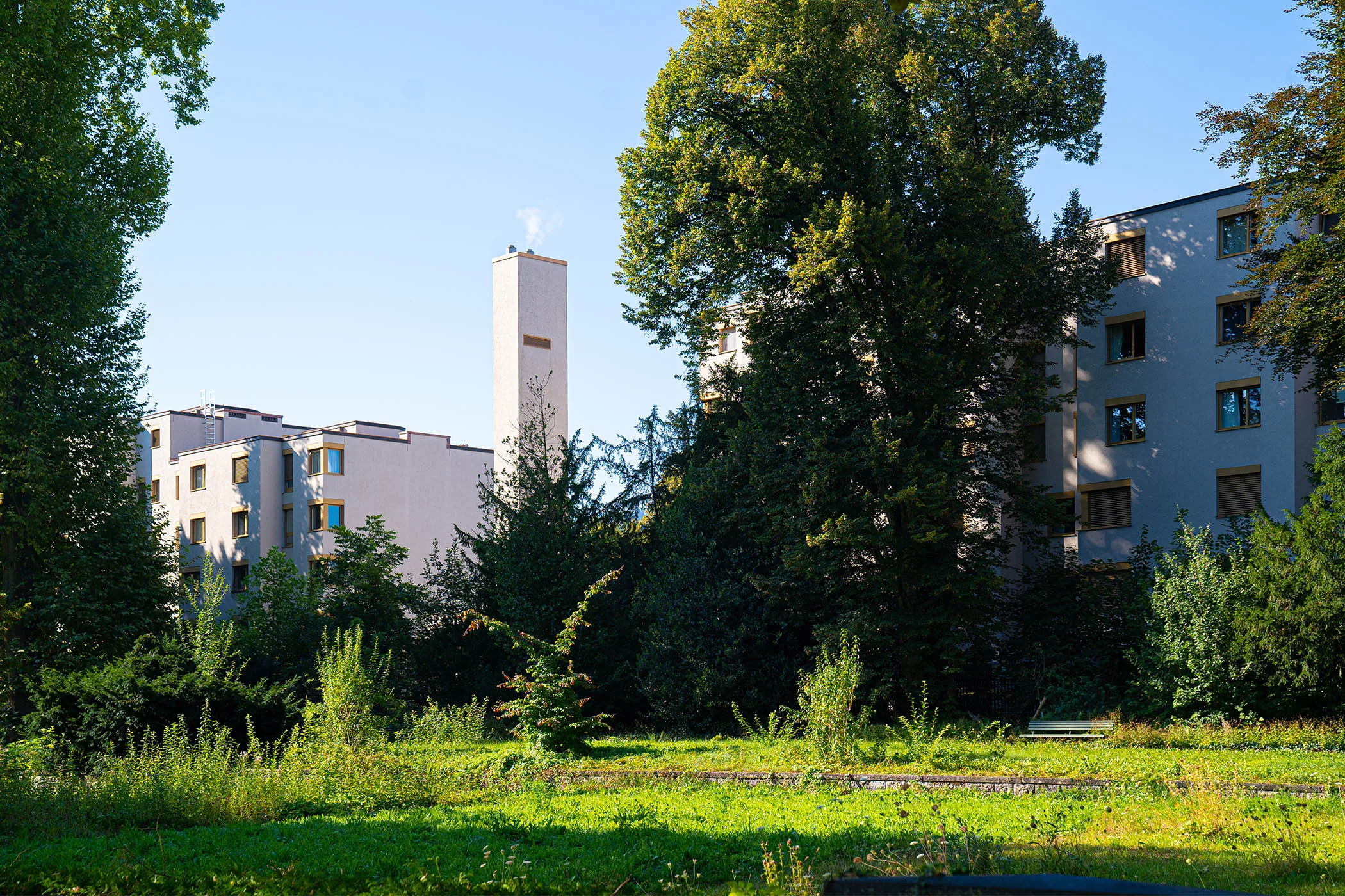 Im Rahmen einer sorgfältigen Sanierung wurde die Siedlung in die Gegenwart überführt. Vorhandene Qualitäten wurden beibehalten und neue Farben und Materialien vermitteln zwischen den 70er Jahren und heute. Der neue Gemeinschaftsraum befindet sich auf dem Platz zwischen den beiden Häuserzeilen. In seiner Formensprache und Materialisierung ordnet er sich in die Gestaltung des Aussenraums ein und löst klare Grenzen zwischen Innen und Aussen auf.
