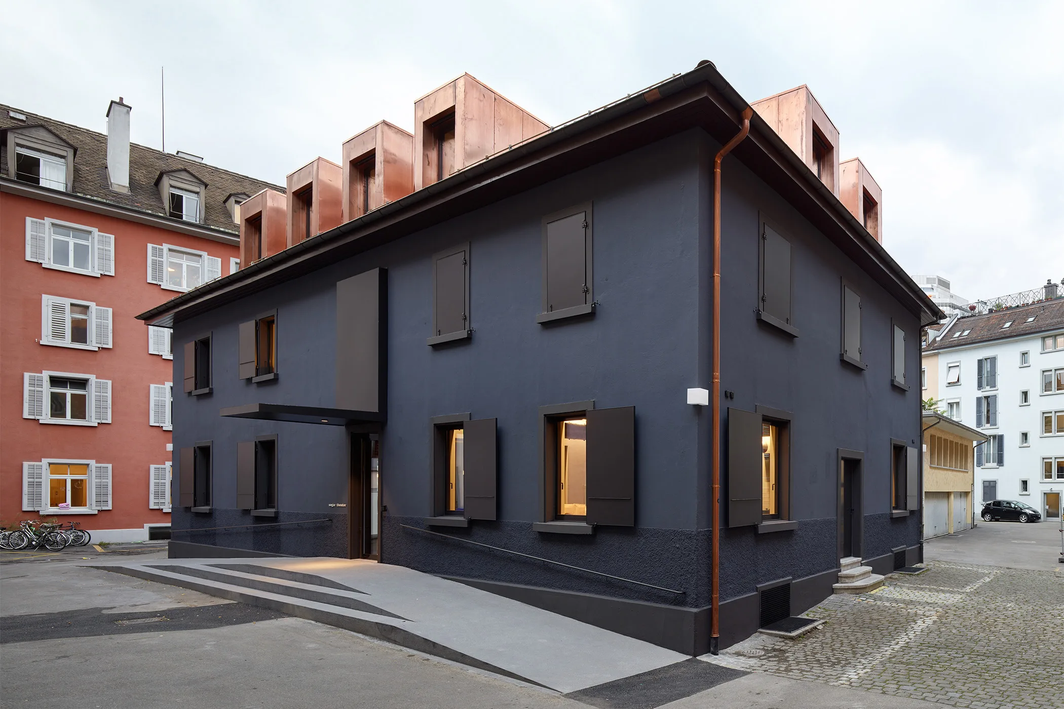 2019 wurde für das literarische Kleintheater «sogar» der Saal deutlich vergrössert, damit die Platzzahl erhöht und die akustischen und klimatischen Verhältnisse verbessert werden konnten. Der Einbau eines Foyers mit Theatercafé erweitert das Raumangebot für Theaterinszenierungen. Mit den Nachtfarben wird auf ein Phänomen verwiesen, das wie in der Literatur und im Theater einen anderen Blick auf die Realität zulässt.