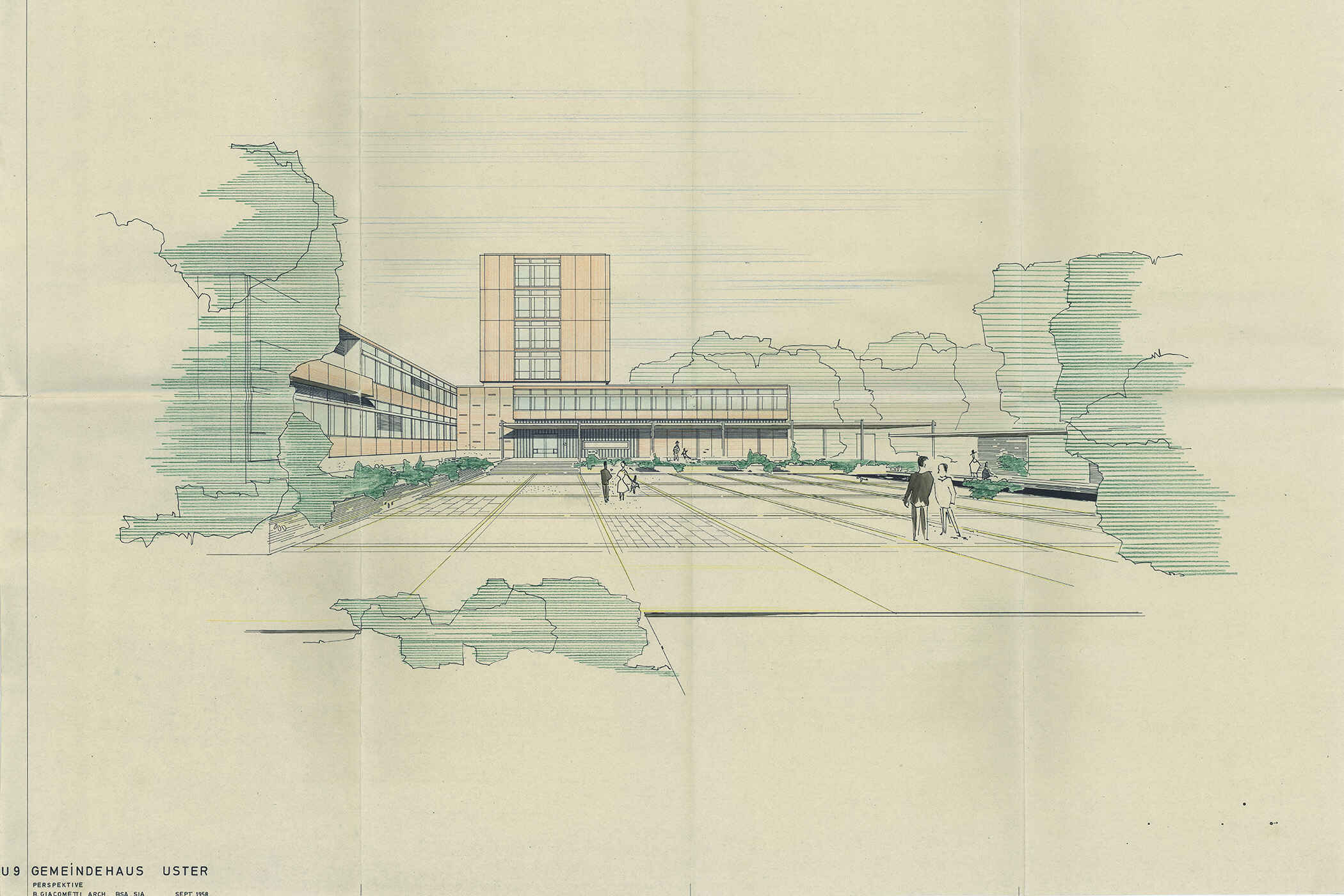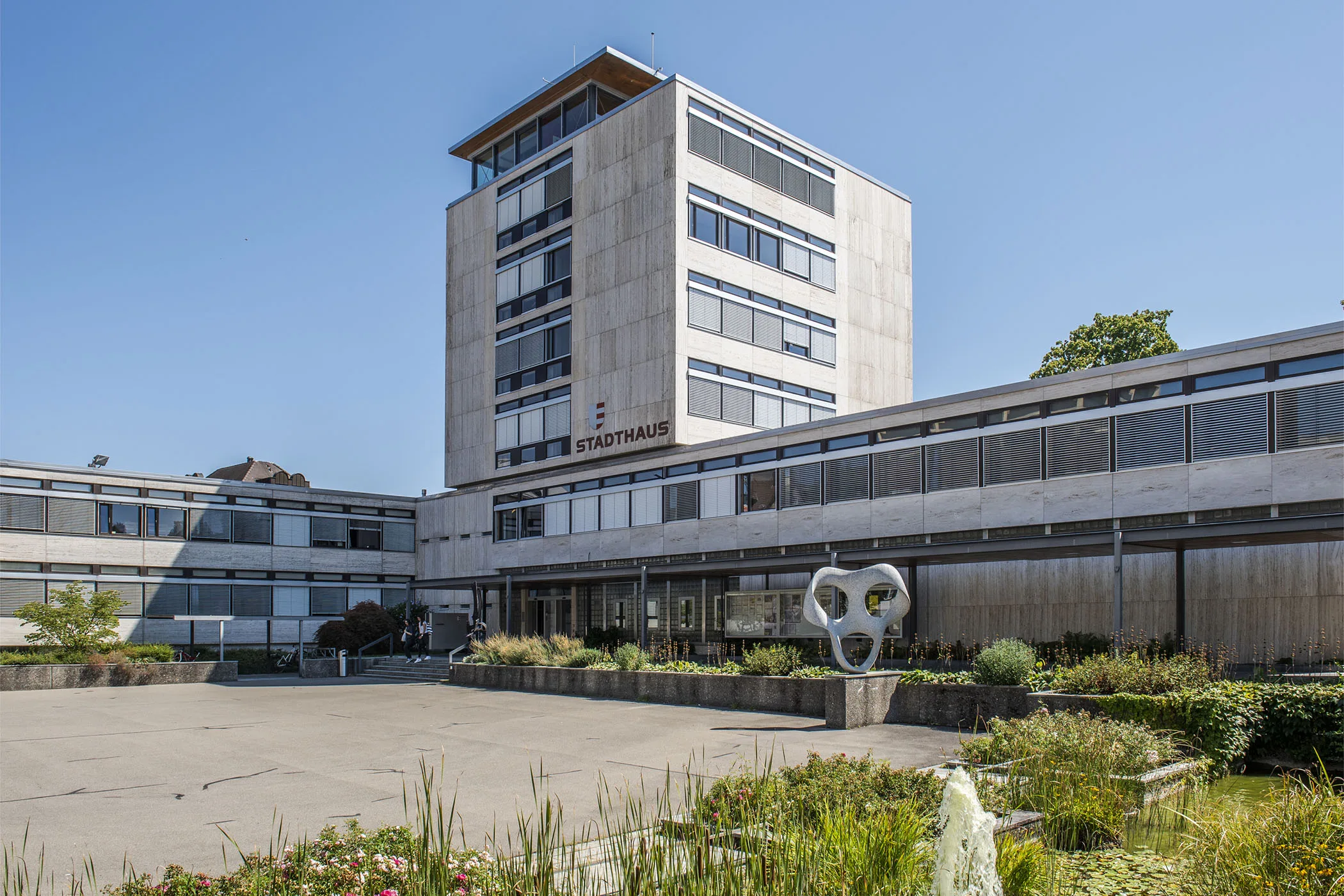 Das anlässlich der Einweihung am 23. Juni 1962 als «Meisterwerk» gefeierte Stadthaus Uster wurde von Bruno Giacometti (1907-2012) entworfen. Der aus der weltberühmten Bergeller Künstlerfamilie der Giacometti stammende Architekt war der Überzeugung, dass ein Stadthaus «mehr als die reine Zweckerfüllung eines Verwaltungsgebäudes bedeuten» muss. Über der T-förmigen Anordnung der Verwaltungstrakte erhebt sich der viergeschossige Hochhausturm. Damit schuf Giacometti eine zur Strasse orientierte Piazza und eine rückseitig situierte Grünanlage. Roh belassene Materialien wie Travertin, Granit, Beton und Eichenholz bestimmen den architektonischen Ausdruck und die Raumstimmung im Innern. Architektur, Raumgestaltung, Möbeldesign und die 1965 von Max Bill geschaffene Skulptur «Rhythmus im Raum» (1965) bilden eine Einheit, die dem Stadthaus den Charakter eines Gesamtkunstwerks verleiht.