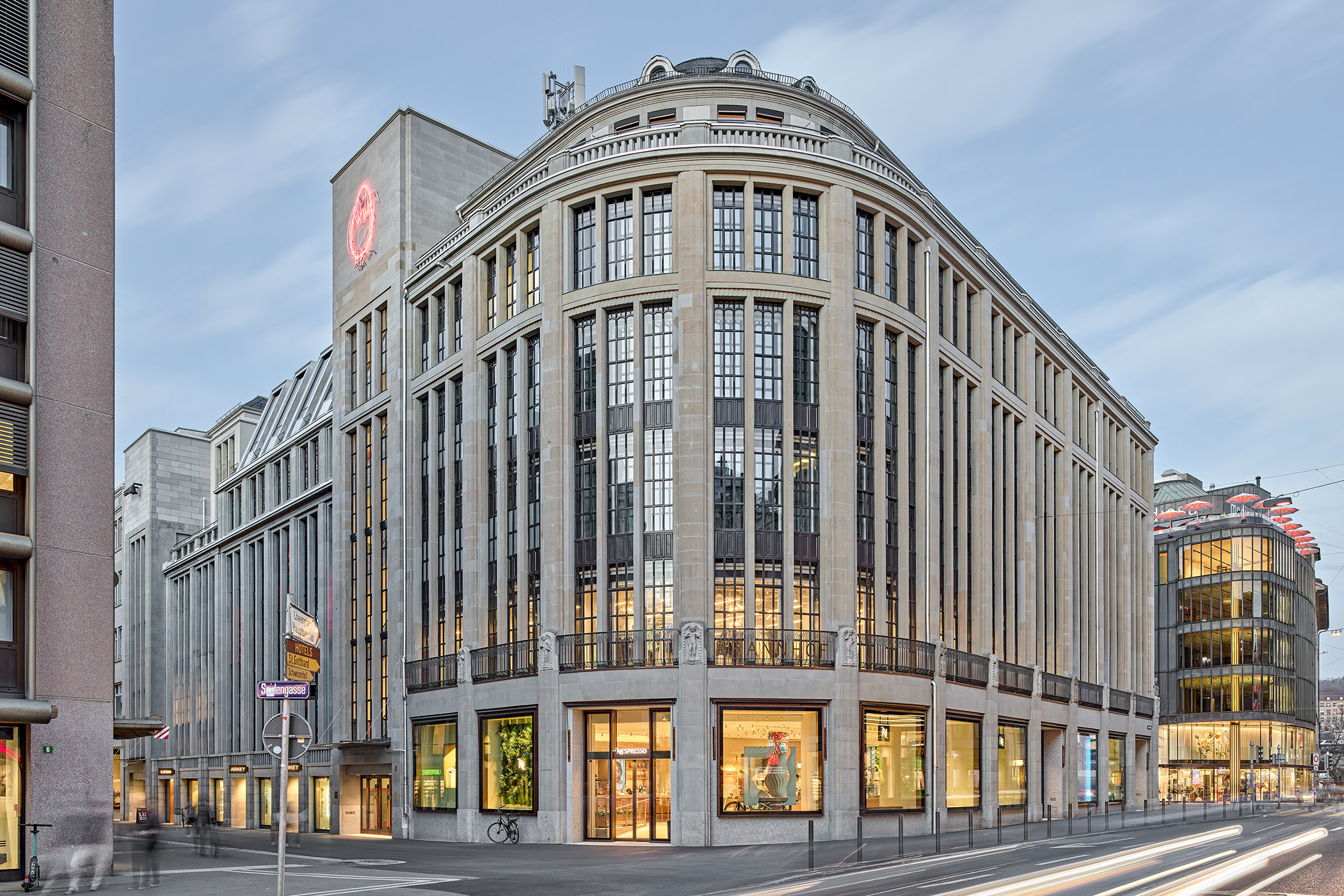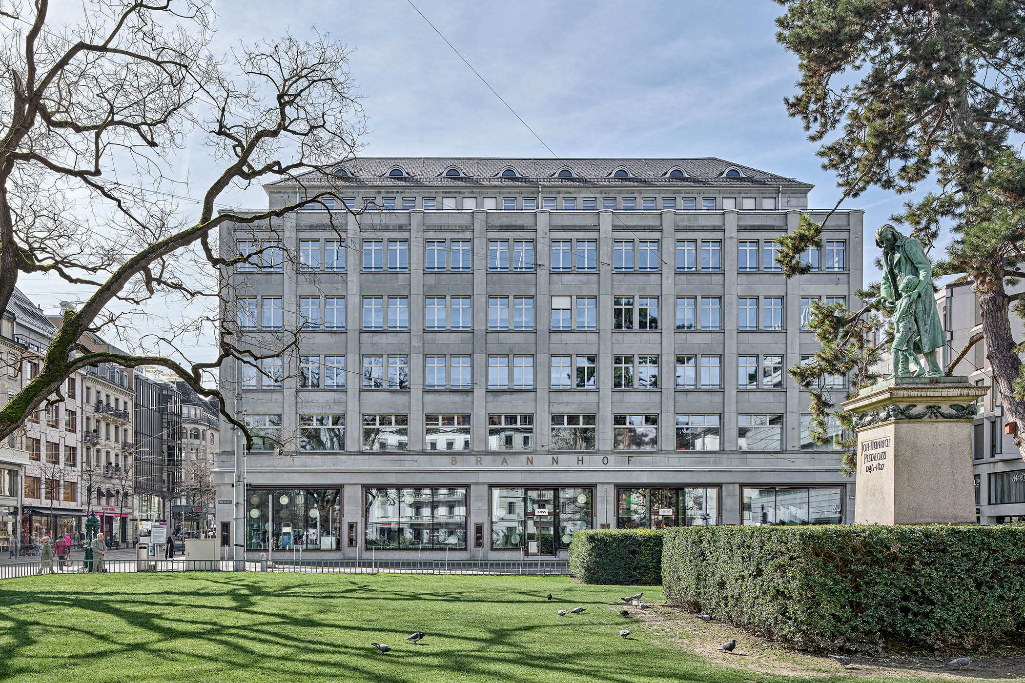 Der imposante Gebäudekomplex an der Bahnhofstrasse 75/79 entstand zwischen 1912 und 1931 in mehreren Etappen nach den Plänen von Pfleghard & Haefeli für den Warenhauspionier Julius Brann. Von 2020 bis 2023 erfolgte eine umfassende Sanierung, bei der heutige Anforderungen an Technik, Energie, Brandschutz und Erdbebensicherheit ebenso berücksichtigt wurden wie denkmalpflegerische Aspekte.