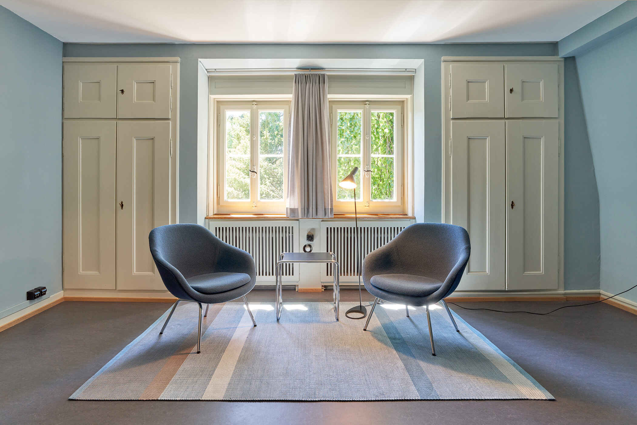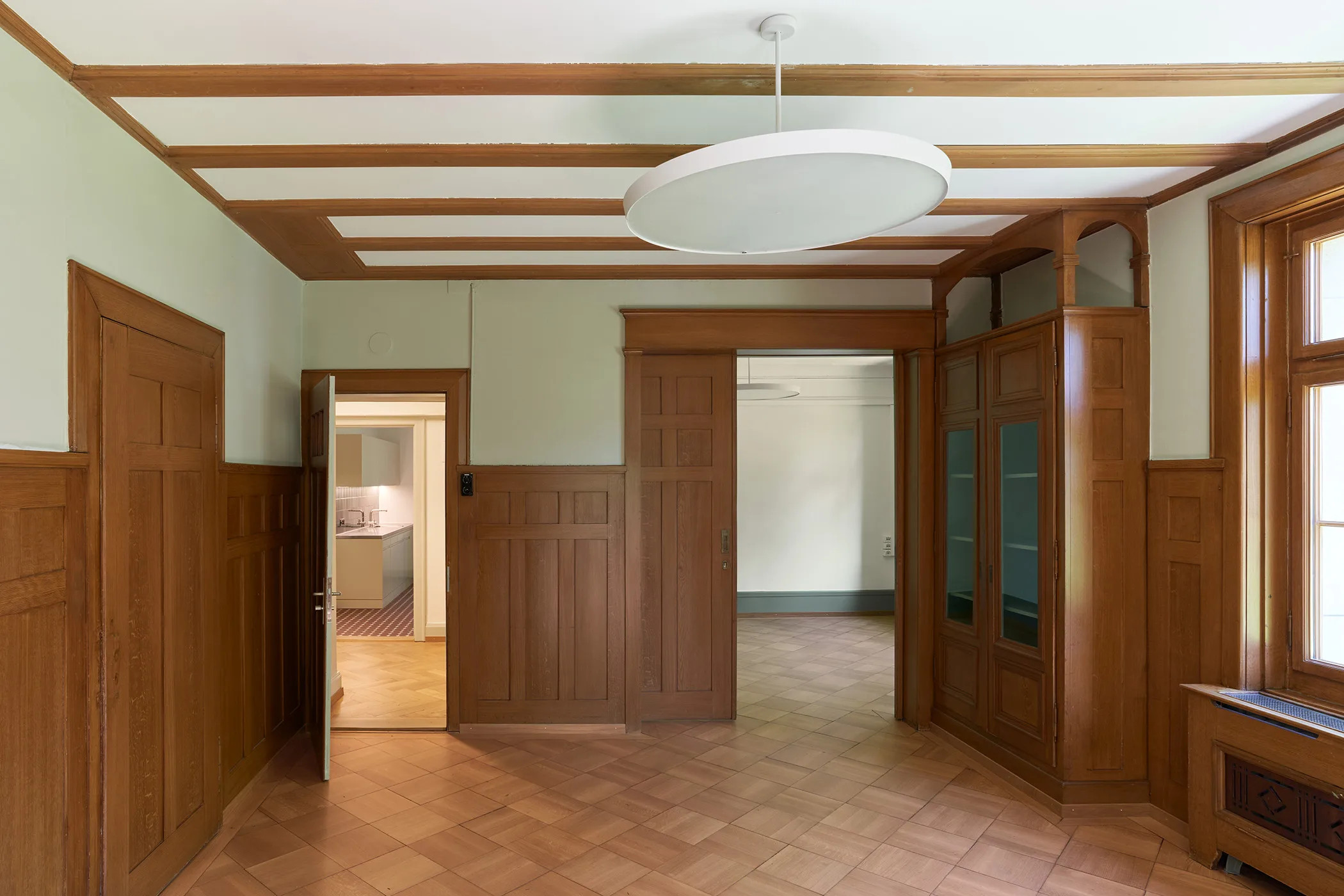 Die Villa Zur Hofegg wurde 1905 von Julius Kunkler, einem Schüler Gottfried Sempers, erstellt und diente als sein Wohnhaus. Das unter Kommunalen Denkmalschutz stehende Haus mit markantem Dach wird heute als Institutsgebäude der Universität Zürich genutzt. Während die unteren Geschosse sanft saniert wurden, fanden im Dachgeschoss grössere Instandsetzungsmassnahmen statt. Die ursprünglichen räumlichen Qualitäten wurden wiederhergestellt: Sämtliche Räume sowie das Treppenhaus wurden frisch gestrichen und aufgewertet, die nicht originalen Etagenabschlüsse mit Spanplattentüren durch raumhohe Glas-/Holztüren in zeitgemässer Gestaltung ersetzt. Die schützenswerten Bodenbeläge wurden teilweise wieder freigelegt oder sorgfältig ersetzt. Das Farbkonzept für Wände, Holzwerk, Textilien und eigens für die Räume geschaffene Teppiche bezieht sich auf die vorgefundene innere und äussere Farbumgebung.