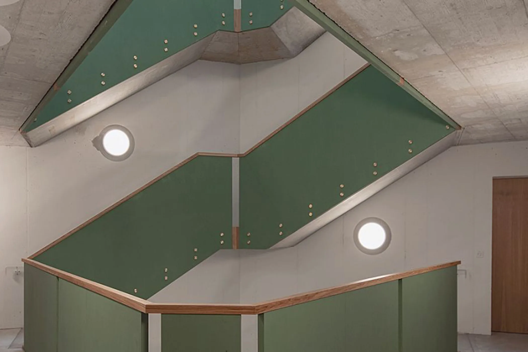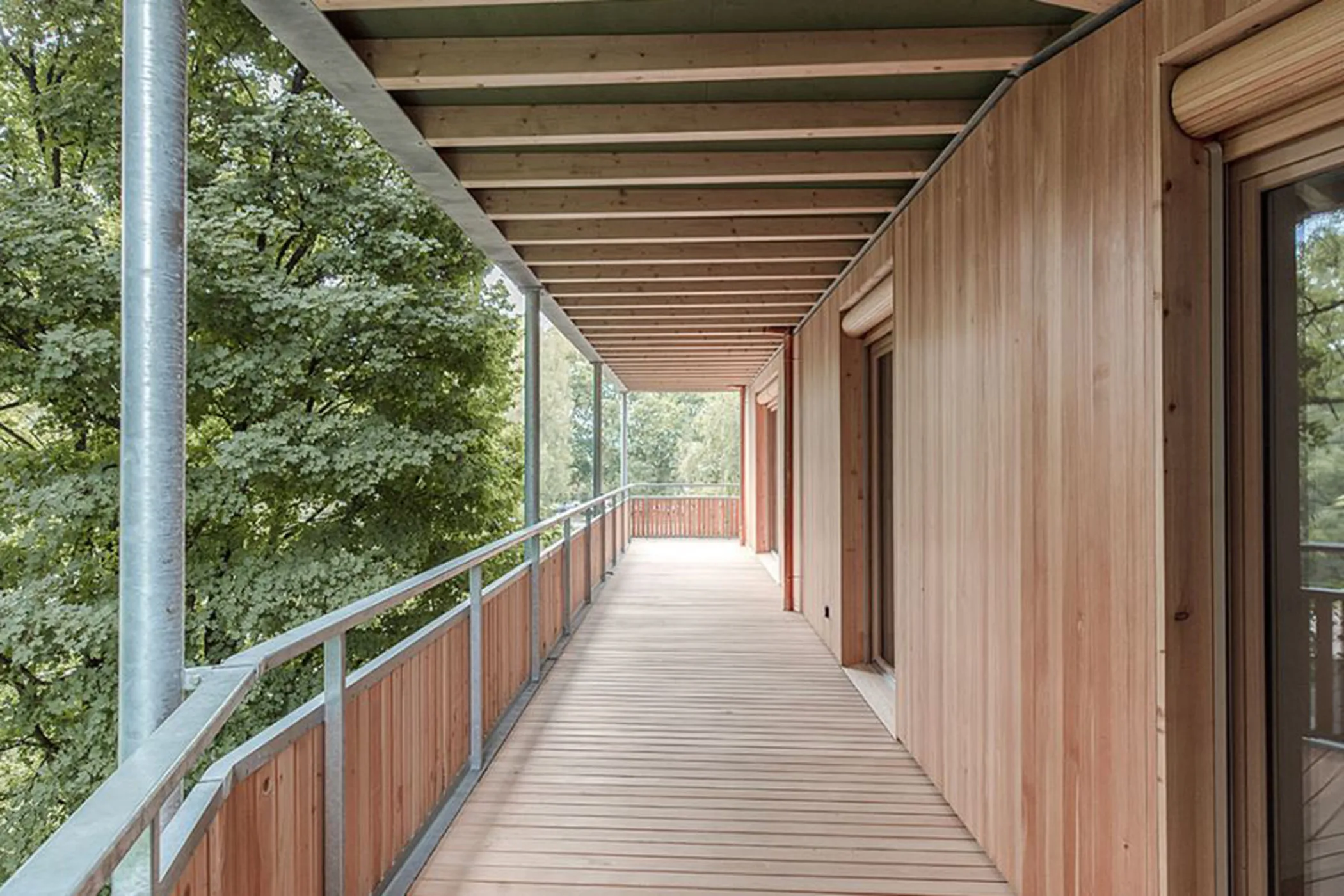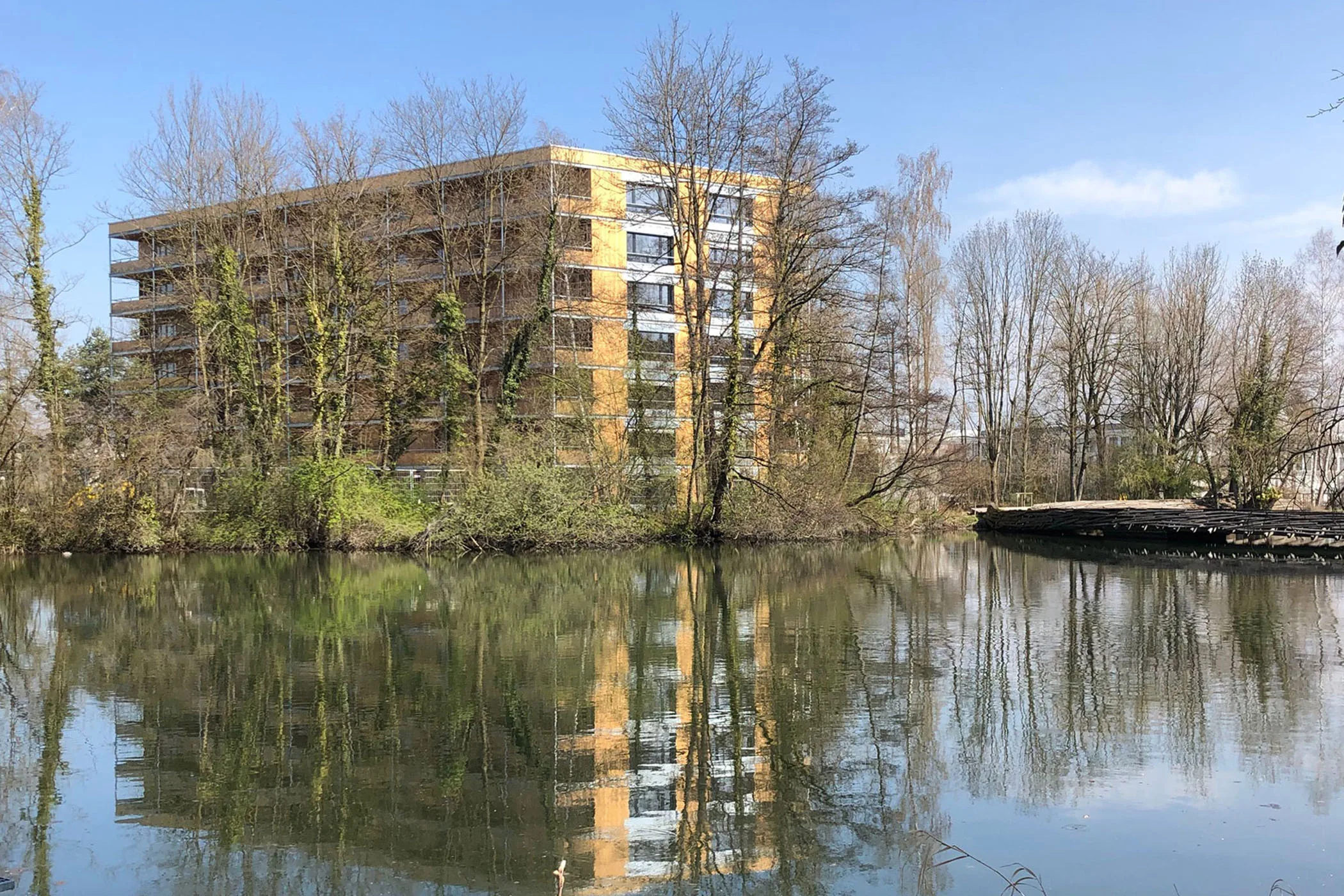 Form, Grösse und Grundgeometrie der vier Gebäude ermöglichten die Entwicklung grundverschiedener Wohnungstypen: Zwei- und dreiseitig organisierte übereckwohnungen, kleine einseitig west,- süd- und weiherorientierte Wohnungen, sowie durchgesteckte Ost-West Wohnungen. Durch ihre facettierte Geometrie entstehen für alle Wohnungen weite Ausblicke und interessante Perspektiven. Die Ausrichtung der Baukörper auf die Aussenräume wird durch tiefe Balkonschichten unterstrichen. Als Antwort auf das Thema «Wohnen im Park» erweitern diese grosszügig dimensionierten Raumschichten die Wohnungen um ein «Sommerzimmer» mit direktem Naturbezug. Die Verwendung einiger weniger Materialien wie Holz, verzinktem Stahl und Beton führt zu einem zurückhaltenden äusseren Erscheinungsbild, welches durch die filigrane Konstruktion der Balkonschicht verfeinert und belebt wird.