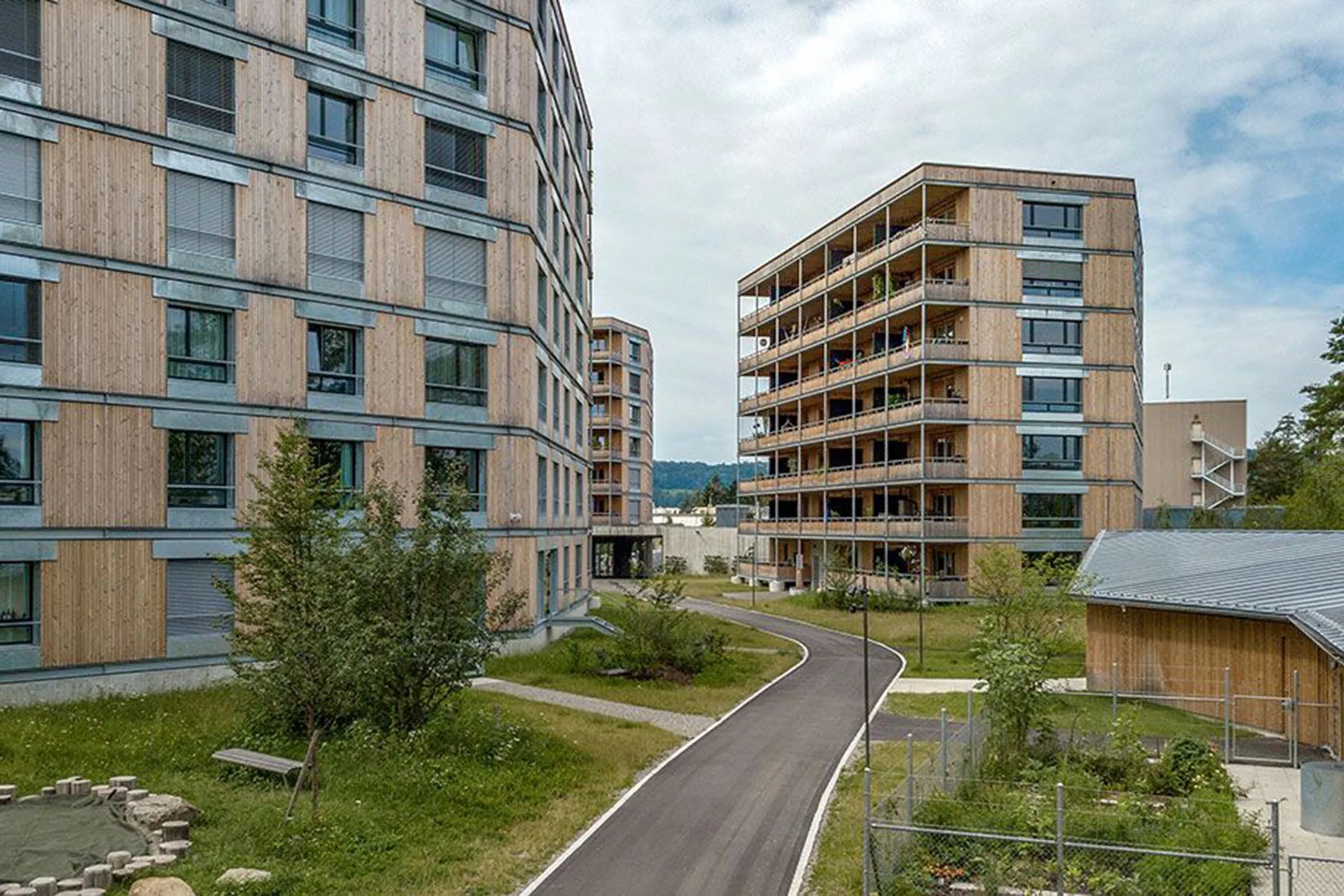 Die vier individuell ausformulierten Häuser wurden so zueinander in Beziehung gesetzt, dass sich eine ausbalancierte und kräftige Gesamtfigur formte. Dazwischen entstanden grosszügige und gut nutzbare Siedlungsräume, die den Wohnungen vielfältige Ein- und Ausblicke in die Tiefe des parkartigen Freiraums und zum Zellweger Weiher ermöglichen.