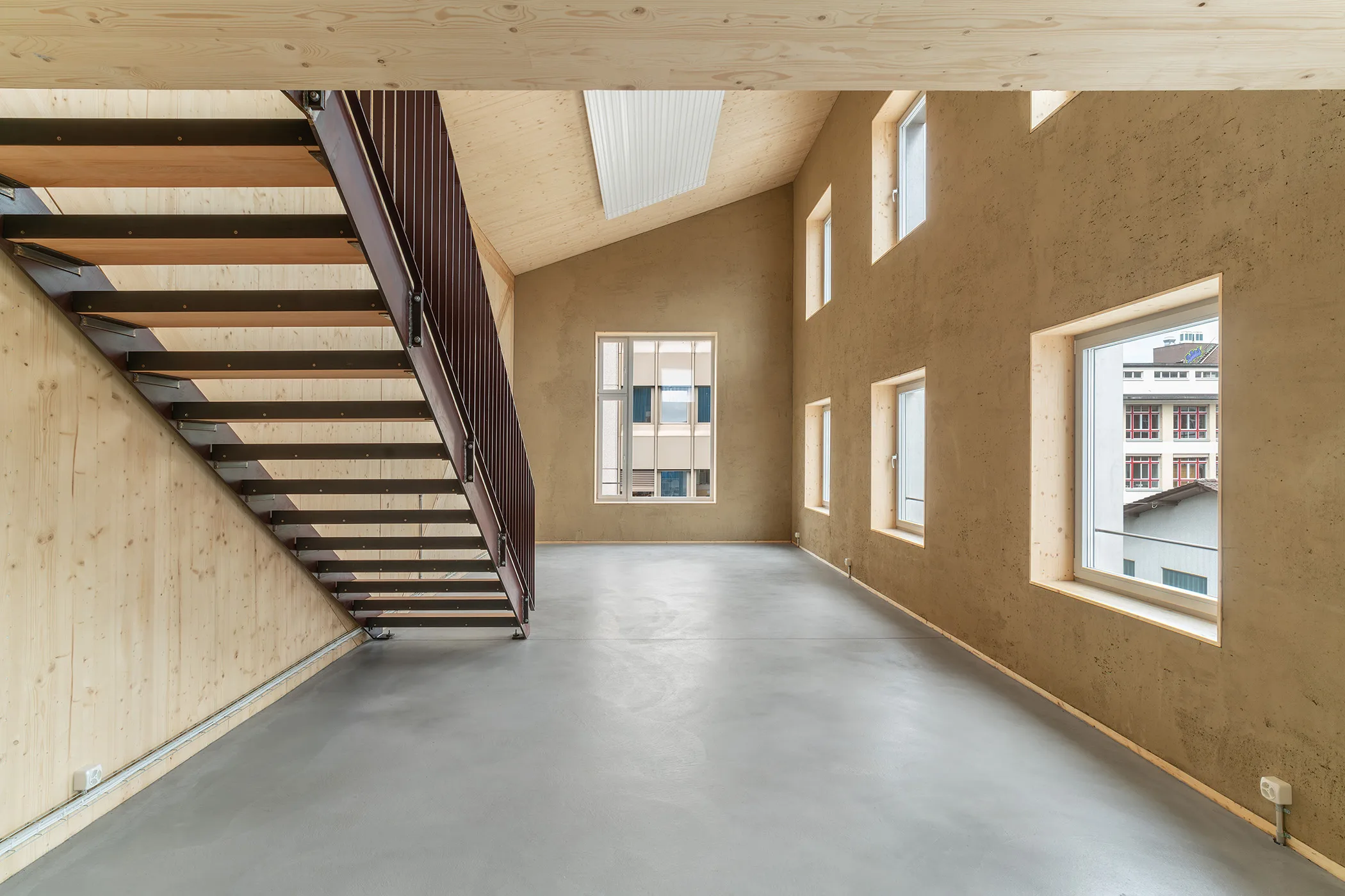 Handwerksgenossenschaften, hat sich das Fabrikations- und Werkhofgelände zu einem Lagergelände mit kleingewerblichen Nutzungen entwickelt. Bis sich eine nächste Generation mit der Weiterentwicklug des Grubenstrasse-Areals befassen wird, soll das brachgefallene, ehemalige Schlossereigebäude an der Grubenstrasse 29 für eine Zwischennutzung ertüchtigt und erweitert werden. «Belassen, was bleiben kann, reparieren was repariert werden kann und nur neu bauen, was fehlt oder nicht repariert werden kann.» Das Umnutzungskonzept sieht nutzungsneutrale Ateliers- und Gewerberäume mit einfachem, robustem Ausbaustandard und industriellem Flair vor. Sie können in unterschiedlichen Konstellationen gemeinschaftlich oder individuell bespielt werden. Eine möglichst geringe Eingriffstiefe in den Bestand und die Wahl nachhaltiger, regenerativer Materialien und Bauteile aus Wiederverwendung für die neuen Baukörper sorgt für einen schonenden Umgang mit dem Industrierbe und der Umwelt. So entstehen wenig graue Emissionen, was das Klima schützt. Gleichzeitig bleibt wertvoller Raum mit einfachem Ausbaustandard für Gewerbe und Kreative erhalten. Die Aufstockung folgt der Regel der maximalen Höhe mit minimalem Eingriff in die bestehende statische Struktur.