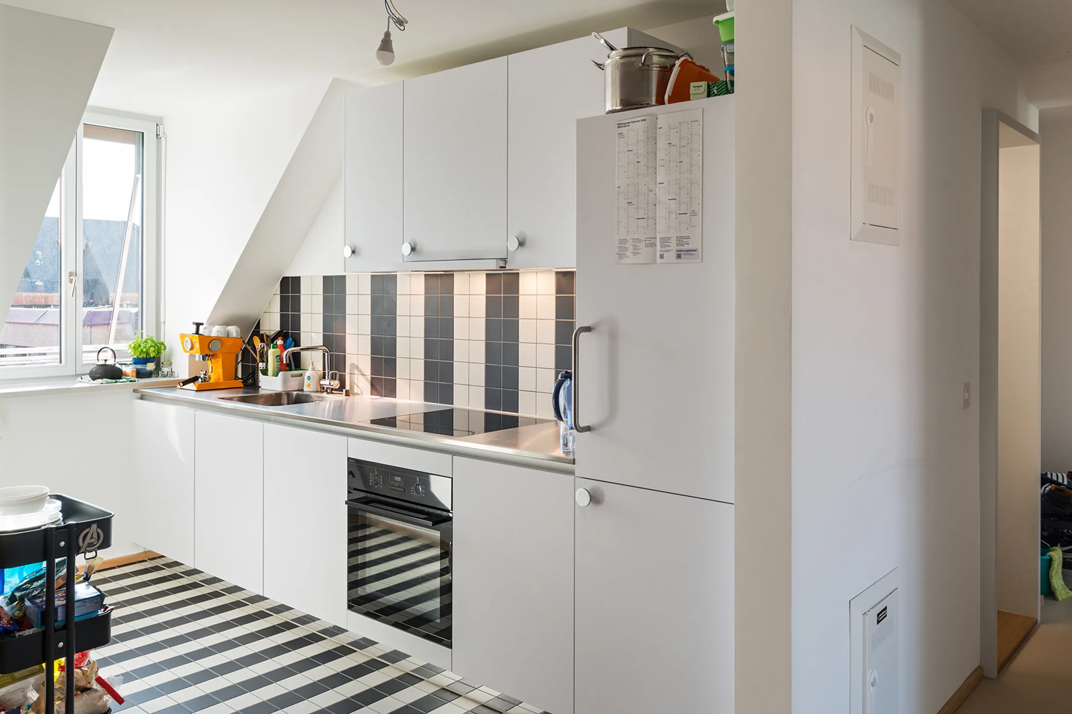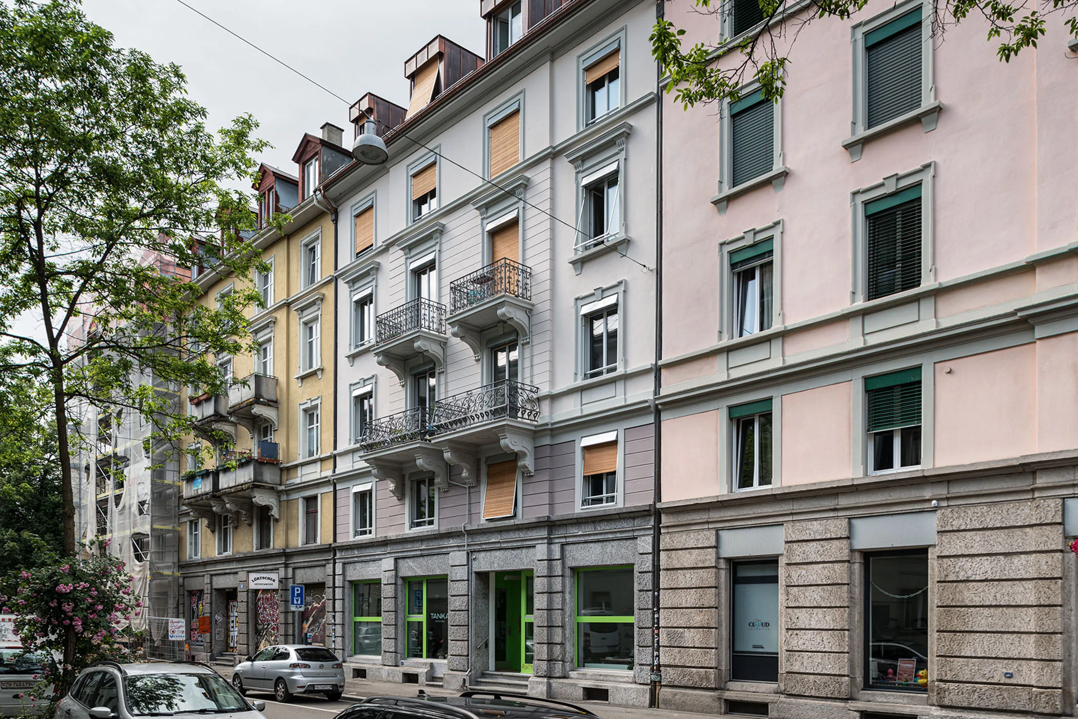 Schon von aussen stechen die knallgrünen Fensterrahmen der Ladengeschäfte hervor. Sie heben sich markant ab von der farblich dezenten Umgebung. Dasselbe hellgrün kam in Form eines Noppenbelages auf den Stufen des Treppenhauses zur Anwendung. Fast ebenso auffällig sind die schwarz-weiss gestreiften Böden und Wände in den Küchen und Bädern.