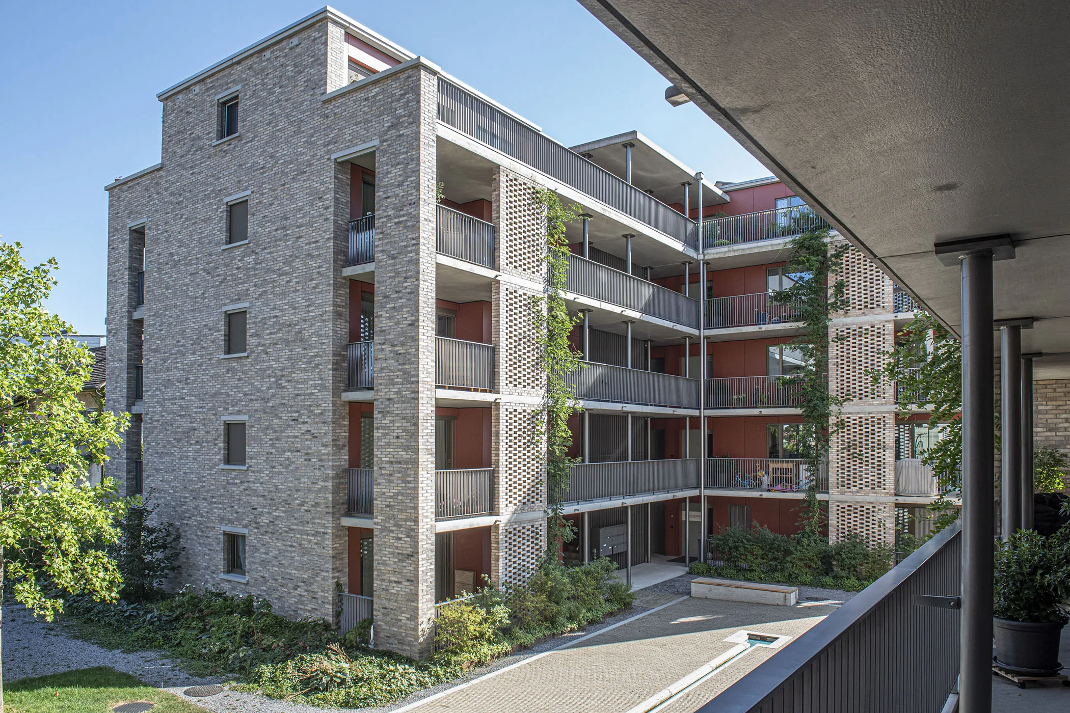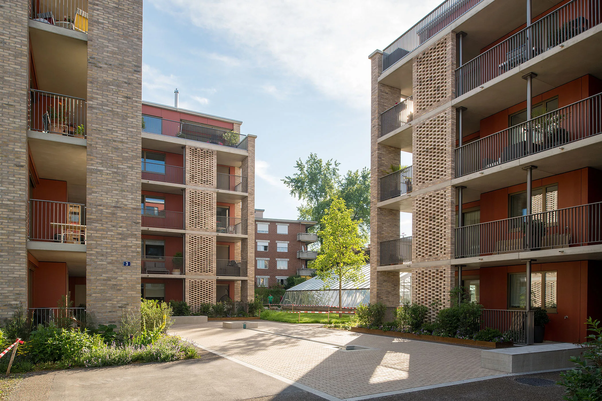 Zwei winkelförmige Neubauten bilden durch ihre Anordnung zueinander einen Hofraum. Dieser wird mit seinen allseitig angelegten Laubengängen zum Kern und Innenraum der Gesamtfigur. Die Lauben erschliessen die Wohnungen und sind gleichzeitig Aussenraum der Wohnungen. Der Hofraum,über den alle Wege zu den Wohnungen führen, ist das gemeinsame Entrée aller Wohnungen. Unterstrichen wird diese Funktion durch die roten Fassadenplatten, die den Hof einfassen, und den Bodenbelag aus sorgfältig gefügten Lehmsteinen mit einer offenen Wasserrinne. Der Hofraum istsowohl Innen- als auch Aussenraum, vermittelt Verbundenheit. Scheiben aus «Pullovermauerwerk» bieten Schatten und Sichtschutz, nach dem Vorbild orientalischer Holzgitter (Maschrabiyyas). Wem es zuviel wird, zieht den Vorhang.