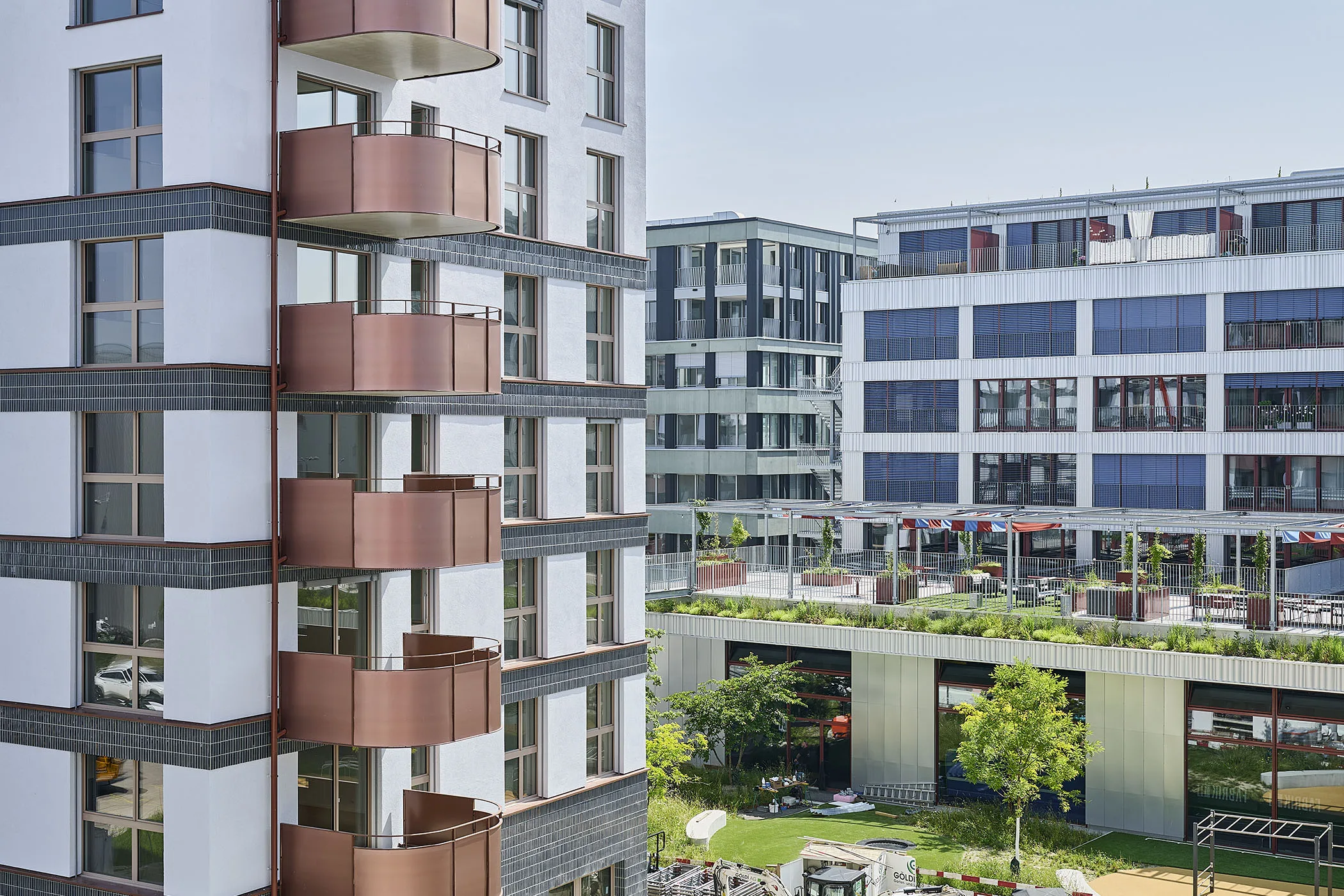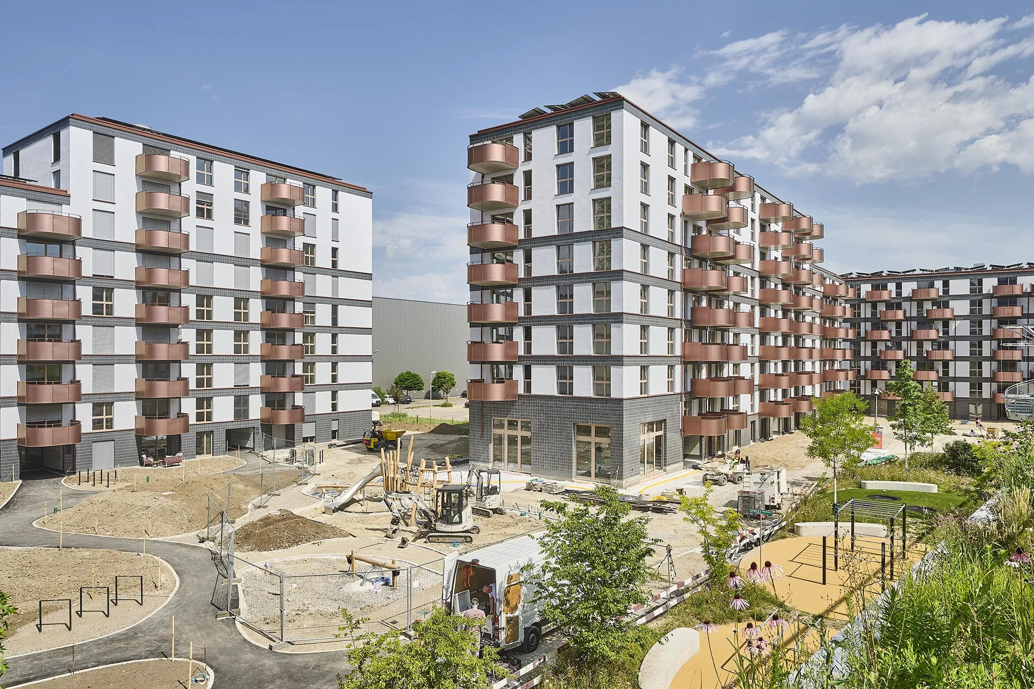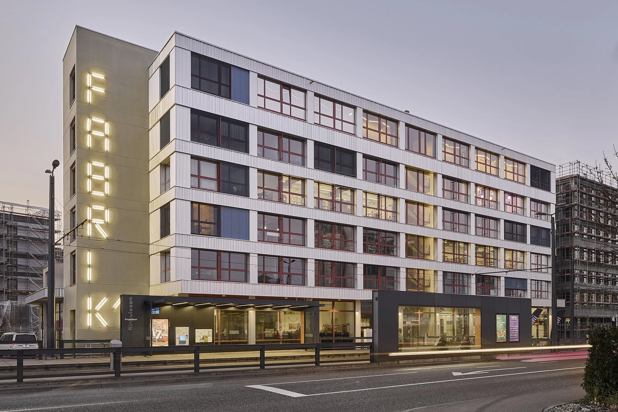 Das Gebiet Hochbord in Dübendorf befindet sich im Wandel von einer Industrie- zu einer Wohnzone. Mit der neuen Überbauung entsteht ein durchmischtes, urban belebtes Quartier. Die drei Neubauten sind so angeordnet, dass sie zusammen mit dem bestehenden Gewerbehaus einen identitätsstiftenden Aussenraum bilden, der im Transformationsprozess eine zentrale Rolle spielt. Entlang der Ringstrasse befinden sich publikumsorientierte Nutzungen, darüber Büros und Wohnungen. In den beiden winkelförmigen Neubauten sind rund 240 Wohnungen untergebracht, ergänzt durch öffentliche Flächen am Ringplatz und im zentralen Bau. Das bestehende Gebäude wurde in eine Wohn- und Dienstleistungsliegenschaft umgebaut, mit loftähnlichen Wohnungen, Indoor-Sportmöglichkeiten im Hallengeschoss sowie Co-Working-Bereichen in den oberen Geschossen. Eine Dachterrasse über der Sporthalle steht allen Mietenden zur Verfügung und bietet hohe Aufenthaltsqualität neben dem Büelwisenpark.